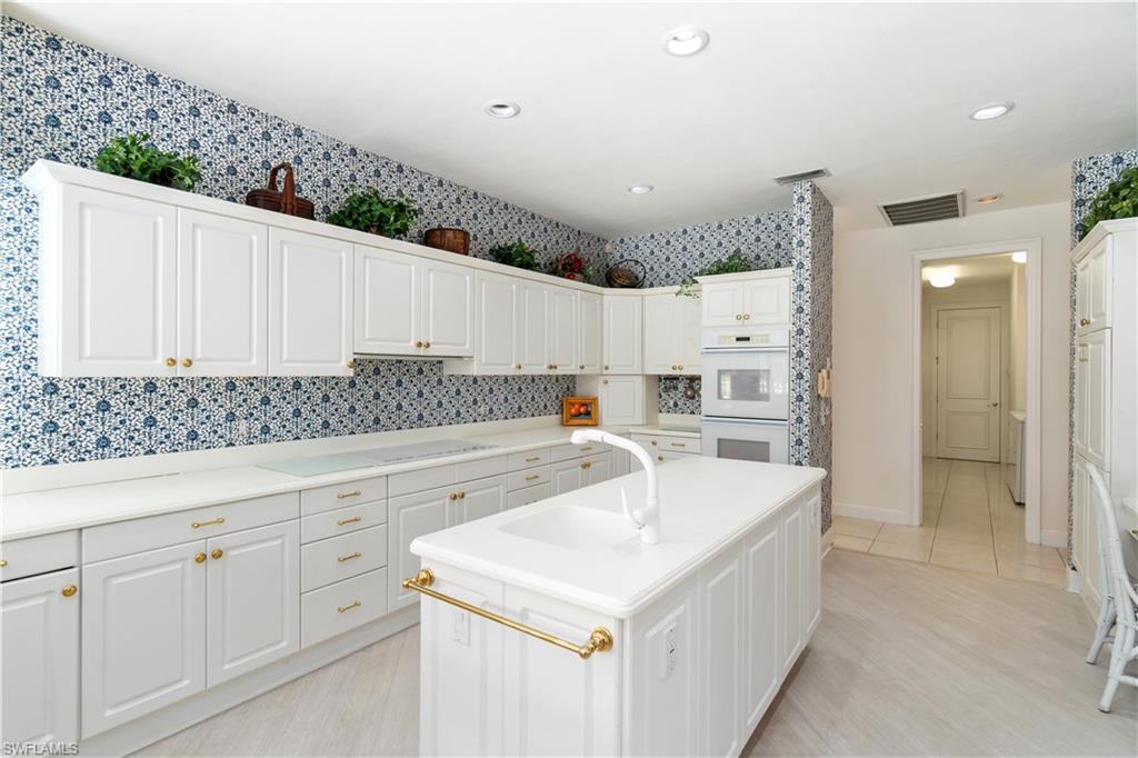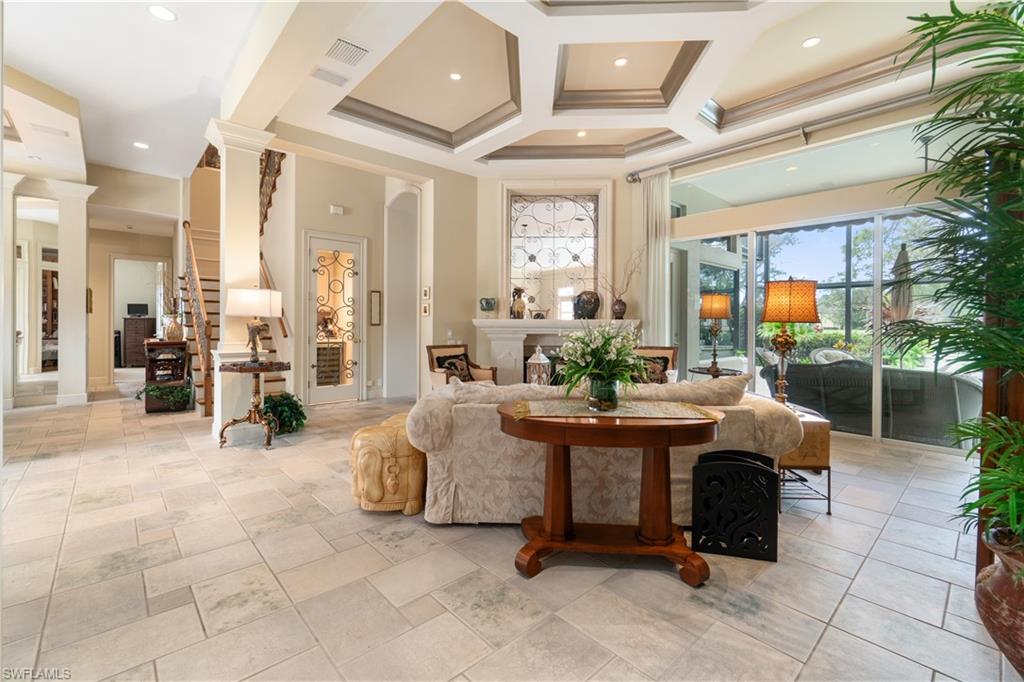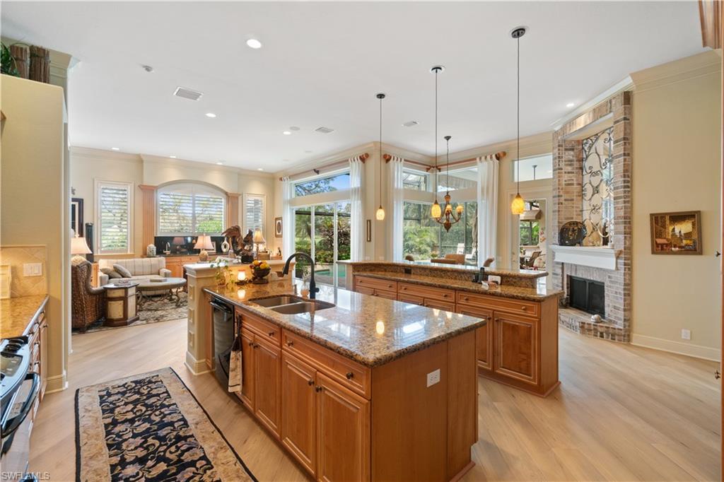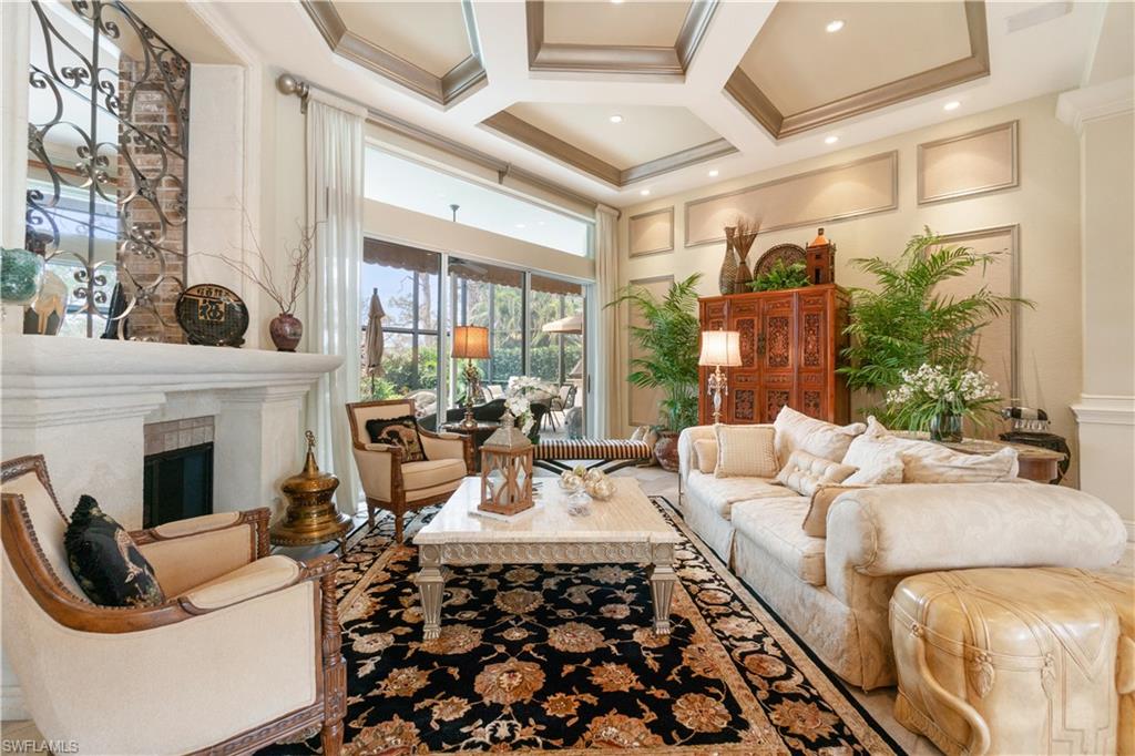 This extraordinary residence offers stunning lake and deep-preserve views. Impeccably updated, the home features rich hardwood floors and custom 8-foot doors, with 3 bedrooms, a versatile den, a lake-facing sunroom and 4 bathrooms. The high-ceilinged living room centers around a fireplace and flows seamlessly onto a lanai/screened porch overlooking the saltwater pool and spa, with nature's beauty just steps away. Equally sophisticated, the formal dining room boasts French doors, and there's a nearby den lined with custom library bookcases. The newly reimagined kitchen and family room impress with their airy and sophisticated style. Highlights include a dramatic beamed ceiling, top-tier European appliances, dual extra-wide quartz islands, custom-designed cabinetry with hardwood polished maple interiors as well as a gas cooktop, making it a dream space for culinary enthusiasts and entertainers alike. The adjoining family room features custom built-ins, while the sunroom offers a sun-drenched & serene space to unwind, with breathtaking views of nature often visited by white egrets and blue herons. The spacious primary suite includes a walk-in closet, wall of custom cabinetry, and a luxurious bathroom. The home is fully storm-ready, featuring hurricane-rated protection, a whole-house generator, and a newer roof. The garage accommodates two cars plus a golf cart. Located in the prestigious Audubon Country Club, this home provides access to an array of amenities and social activities/events, including an 18-hole golf course, tennis, pickle ball, croquet, bocce ball, a large community pool, a fitness and lifestyle center, and a clubhouse with multiple dining options. Immediate afternoon golf play available, and short waiting list for full golf membership. Enjoy the boardwalk to the bay with kayaks, and relish Naples’ finest beaches, restaurants, and shopping only minutes from Audubon.