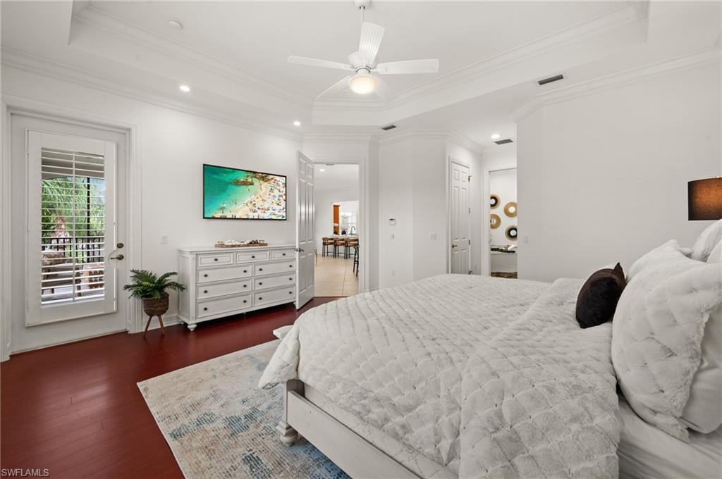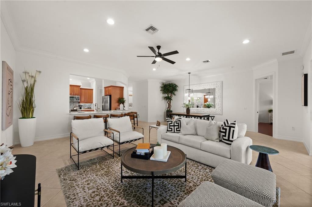 This first-floor coach has three bedrooms, two baths, an updated kitchen with white quartz countertops and stainless appliances. The kitchen is open to the great room, and lanai for socializing with family and guests. Plantation shutters and crown molding accentuate the upgrades to the unit! Wood floors in the living and dining rooms, and halls. Its 8-foot doors and 10-foot-high ceilings add to the spacious feeling of this coach home! A private two-car garage has a new epoxy floor. Enjoy a beautiful view of the pool and spa near the screened lanai. All exterior maintenance is covered in The Reserve Association dues. A new exterior paint and roof was installed in 2024 with no assessments. The gated community of Banyan Woods has amenities that include a community fitness center, a clubhouse, playground and basketball court. Great location within minutes to Gulf beaches, wonderful dining and shopping.