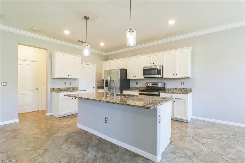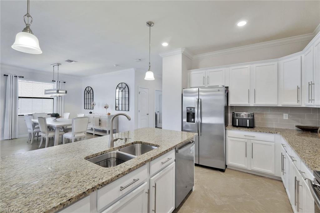 Welcome to Your Naples Oasis! This stunning 3-bedroom, 3-bathroom home with a 2-car garage and extended driveway offers the Naples lifestyle you’ve been dreaming of. Featuring soaring ceilings, an open floor plan, and a large lanai with a private pool, spa, and outdoor kitchen, this residence is perfect for both relaxation and entertaining. Inside, the sleek kitchen showcases white cabinetry, quartz countertops, a stylish backsplash, a massive island with seating for four, stainless steel appliances with hood, and a spacious walk-in pantry. The open kitchen, living, and dining areas flow seamlessly together under a detailed tray ceiling, with windows and sliders filling the home with natural light and views of the pool and lanai. The owner’s suite is bright and expansive, offering two custom walk-in closets, a linen closet, and a spa-like bath with dual vanities, soaking tub, and an oversized glass-enclosed shower. Step outside to your resort-style lanai, complete with a sparkling pool, spa, and fully equipped outdoor kitchen with grill and refrigerator—perfect for Florida living. Additional highlights include: • Impact-resistant windows and doors • Tile flooring throughout main living areas; carpet in bedrooms • Garage with built-in shelving Located in Bent Creek Preserve, residents enjoy a lakeside clubhouse with event space, billiards, fitness center, resort pool & spa, tennis, pickleball, bocce, basketball, playground, and a social calendar. Conveniently, the community also connects to Founders Square, a hub for premier dining and entertainment. This is more than a home—it’s a lifestyle! Comes with Home Warranty at closing.