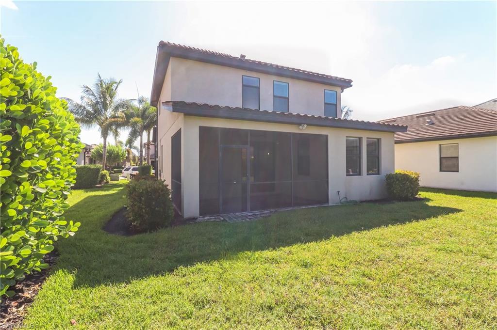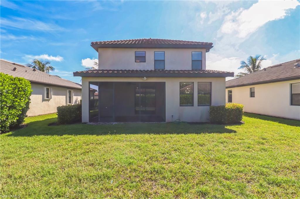 Have you been searching for a spacious family home with serene preserve views and ideal western exposure for unforgettable sunsets? This beautifully maintained two-story residence in Bent Creek Preserve delivers privacy, functionality and room to grow, all in a prime North Naples location with access to top-rated schools, shopping and dining. Designed for modern living and effortless entertaining, this five-bedroom, three-bath home with a den and a rare three-car garage showcases a thoughtful layout and elegant finishes. The open-concept main level features diagonal tile flooring, crown molding, arched walkways, and a seamless flow between living, dining and kitchen spaces. The kitchen is stylish and functional, offering white shaker-style cabinetry, granite countertops, recessed lighting, a built-in desk, pantry and a center island with breakfast bar seating. Stainless steel appliances include a refrigerator with icemaker, range, microwave and dishwasher. Glass sliders lead from the living area to a screened lanai with a covered outdoor space, offering tranquil preserve views and a brick paver patio with a fire pit, ideal for outdoor gatherings. A guest bedroom and full bath with granite vanity and shower-tub combination are conveniently on the first floor. Upstairs, the owner’s suite offers two walk-in closets with shelving and a spa-like en-suite bath featuring a dual-sink granite vanity, full-width mirror, soaking tub and a walk-in shower with glass enclosure. Three additional guest bedrooms share a full bath with a dual-sink vanity and shower-tub combo, while the spacious den/media room with double doors and floating shelves offers flexibility for work or relaxation. The laundry room includes a GE washer and dryer with overhead shelving for storage. Outside, a wide brick paver driveway complements the tandem three-car garage, offering ample space for vehicles and storage. Manual shutters provide storm protection, and a security system adds peace of mind. Bent Creek Preserve is a resort-style, gated community offering unmatched amenities including a lakeside clubhouse, fitness center, steam room, showers, billiard room, event center, resort pool and spa, tennis, pickleball, bocce ball, half-court basketball and a playground. With gated access into Founders Square and easy proximity to Mercato, Gulf beaches, and Interstate 75, this home offers a blend of luxury, privacy and convenience. Schedule your private showing today.