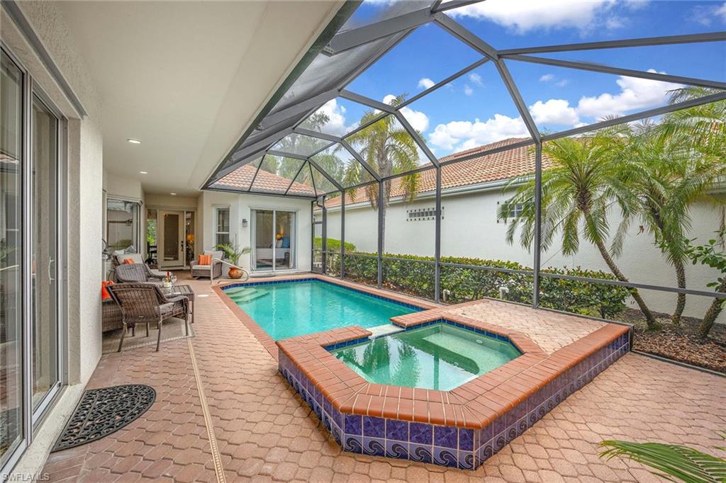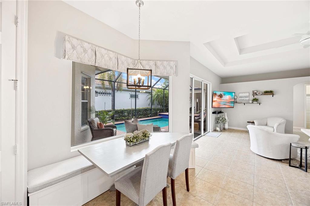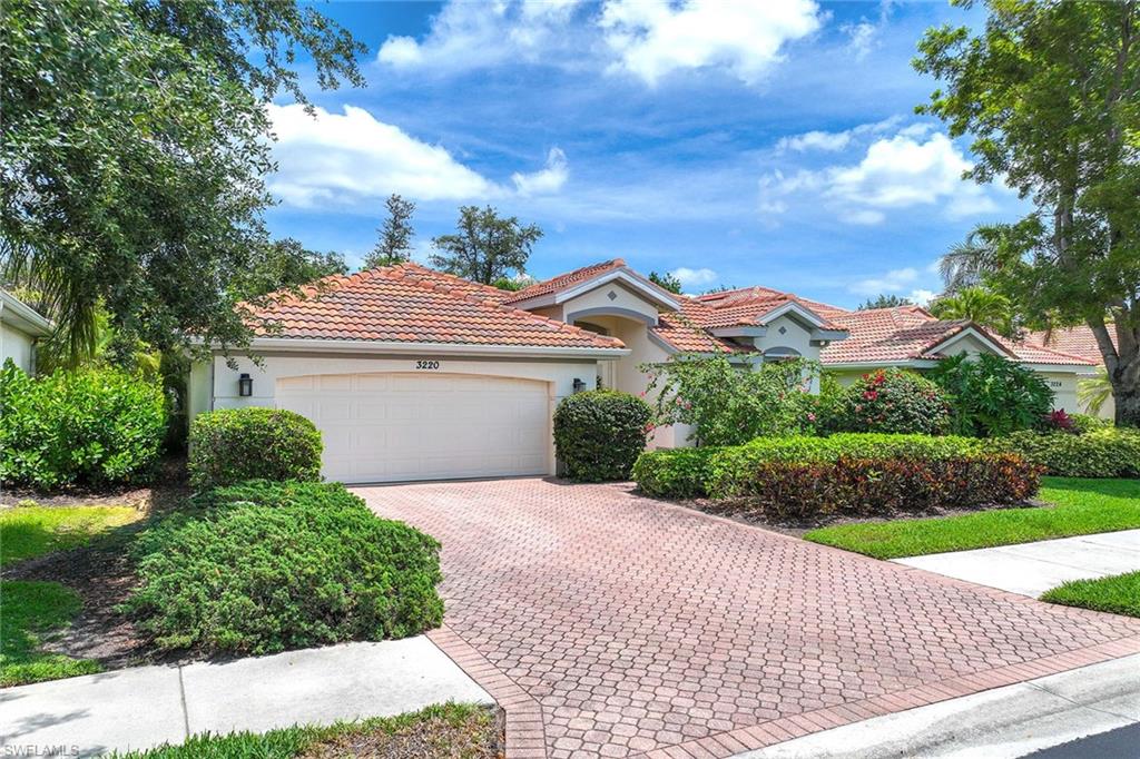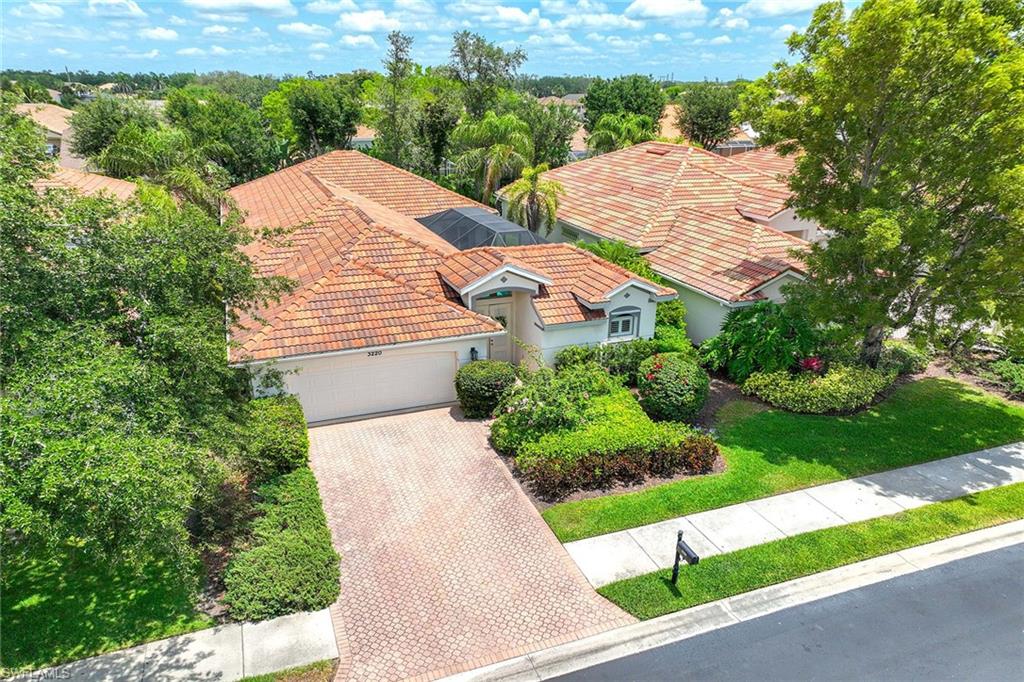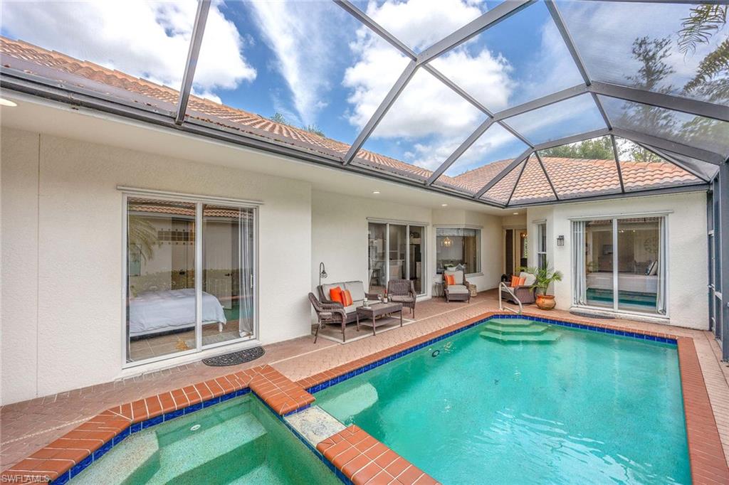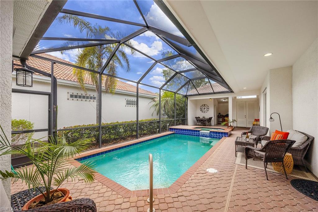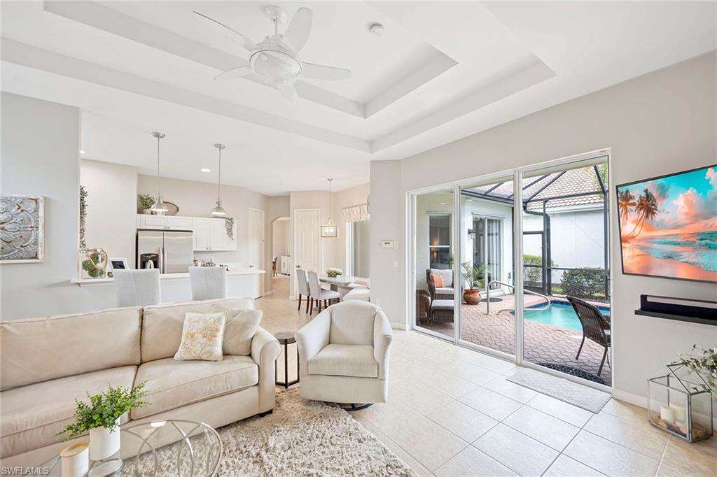 This impeccably updated and rarely available single-family pool home on a private corner lot awaits in the heart of North Naples’ highly sought-after Bridgewater Bay. Showcasing soaring 14 ft. tray ceilings, this light-filled residence impresses with plantation shutters throughout and an open-concept layout that flows effortlessly from the spacious living area—accented by an oversized designer fan—to the dining room and kitchen. The chef-inspired kitchen gleams with 2022 stainless KitchenAid appliances, white cabinetry, granite countertops, and a glass-tile backsplash. With thoughtful upgrades such as a tile roof (2021), luxury vinyl plank flooring in living areas (2022), modern lighting throughout (2022), a full exterior repaint (2022), and a new A/C system (2022), this home offers style and substance in equal measure. The laundry room is equipped with built-in cabinetry, a utility sink, and LG front-load washer/dryer for convenience. Unwind in your heated pool and spa, surrounded by mature tropical landscaping—towering palms, lush oaks, and vibrant greenery. The 2.5-car side-loading garage with an extended paver driveway adds curb appeal and ample space for vehicles or storage. Additional peace of mind includes a security system and hardwired Ring floodlight cameras and doorbell (2022). Located in Flood Zone X so no flood insurance is required, this home never lost power or sustained damage during Hurricane Ian. Bridgewater Bay is a resort-style gated community offering unmatched amenities, featuring two pools (resort-style and lap), tennis, pickleball, bocce, and basketball courts, a clubhouse with fitness center and social calendar, a playground, and tranquil lakes. Two convenient access points on Orange Blossom Drive and Livingston Road provide effortless connectivity. Perfectly positioned just 3 miles to Naples beaches, 2 miles to Mercato, and close to I-75, this home combines location, lifestyle, and luxury in one perfect package.