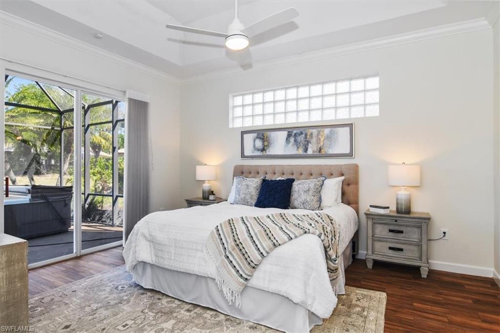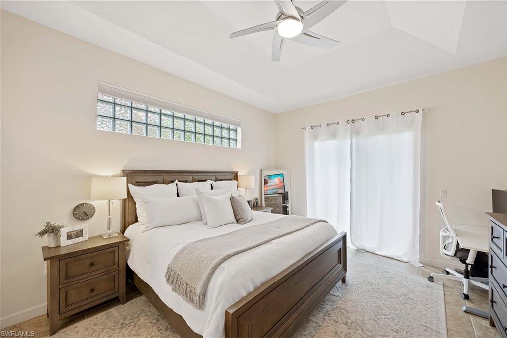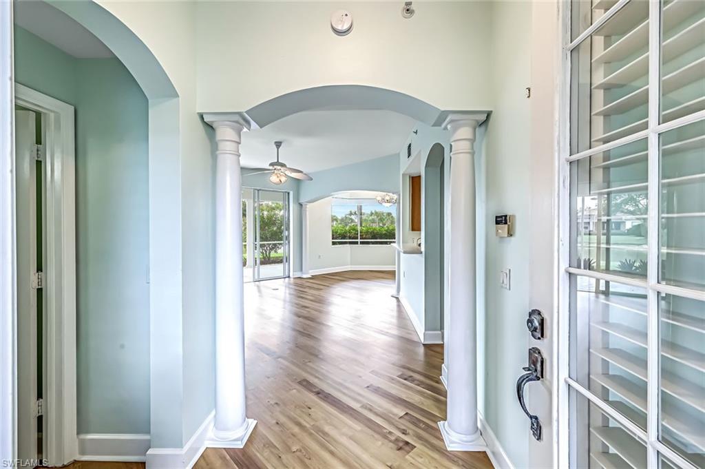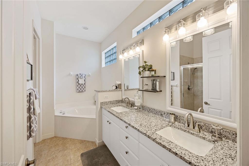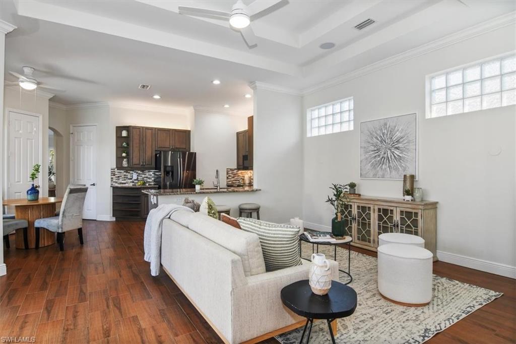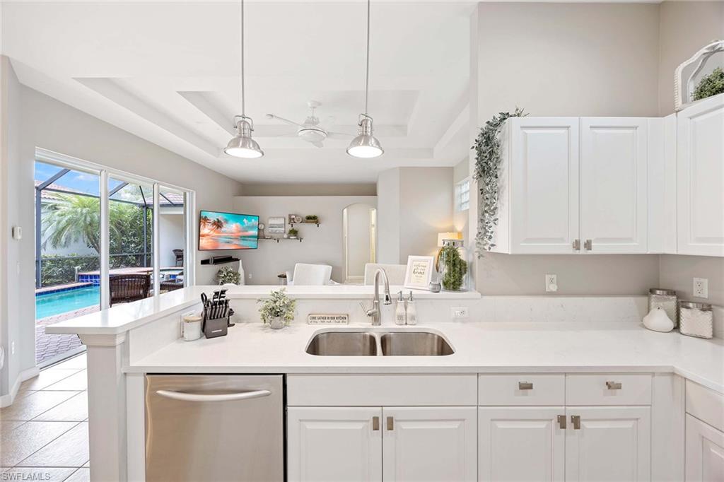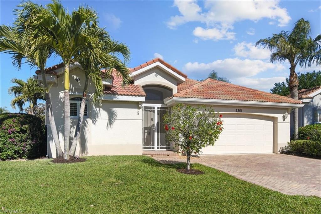 This impeccably updated and rarely available single-family pool home on a private corner lot awaits in the heart of North Naples’ highly sought-after Bridgewater Bay. Showcasing soaring 14 ft. tray ceilings, this light-filled residence impresses with plantation shutters throughout and an open-concept layout that flows effortlessly from the spacious living area—accented by an oversized designer fan—to the dining room and kitchen. The chef-inspired kitchen gleams with 2022 stainless KitchenAid appliances, white cabinetry, granite countertops, and a glass-tile backsplash. With thoughtful upgrades such as a tile roof (2021), luxury vinyl plank flooring in living areas (2022), modern lighting throughout (2022), a full exterior repaint (2022), and a new A/C system (2022), this home offers style and substance in equal measure. The laundry room is equipped with built-in cabinetry, a utility sink, and LG front-load washer/dryer for convenience. Unwind in your heated pool and spa, surrounded by mature tropical landscaping—towering palms, lush oaks, and vibrant greenery. The 2.5-car side-loading garage with an extended paver driveway adds curb appeal and ample space for vehicles or storage. Additional peace of mind includes a security system and hardwired Ring floodlight cameras and doorbell (2022). Located in Flood Zone X so no flood insurance is required, this home never lost power or sustained damage during Hurricane Ian. Bridgewater Bay is a resort-style gated community offering unmatched amenities, featuring two pools (resort-style and lap), tennis, pickleball, bocce, and basketball courts, a clubhouse with fitness center and social calendar, a playground, and tranquil lakes. Two convenient access points on Orange Blossom Drive and Livingston Road provide effortless connectivity. Perfectly positioned just 3 miles to Naples beaches, 2 miles to Mercato, and close to I-75, this home combines location, lifestyle, and luxury in one perfect package.