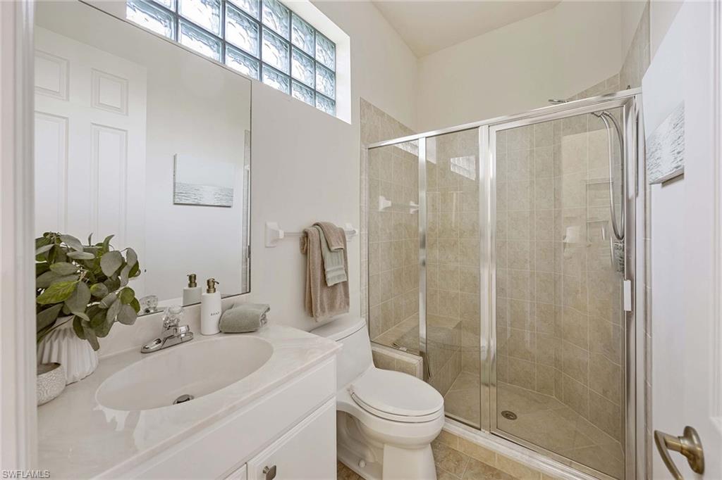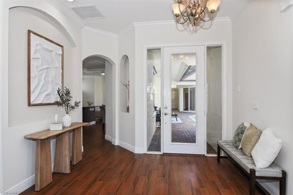 Welcome to this beautifully renovated courtyard-style home in the highly sought-after community of Bridgwater Bay. Located in North Naples, this spacious residence offers 3 bedrooms, 3 bathrooms in the main house, plus a 1-bedroom, 1-bathroom casita – perfect for guests, a home office, or extra privacy. Step outside into the inviting courtyard, complete with a solar heated pool, offering the perfect space for relaxing or entertaining. The rear patio that extends the length of the home, where you can unwind while enjoying tranquil views of the serene lake. Inside, the home has been thoughtfully updated with a renovated kitchen and new tile floors throughout, creating a modern and stylish living space. The large, pie-shaped lot offers plenty of outdoor space for privacy and enjoyment. Bridgwater Bay offers an abundance of amenities, including tennis, pickleball, bocce, two community pools, a fitness center, and more! NEW hot water heater, 5 year old kitchen and tile floors throughout, new fans, interior painted, home was refreshed prior to going on the market. Seller also completed a pre home inspection! Nice for peace of mind when touring this home. NO FLOOD INSURANCE required. X Flood zone