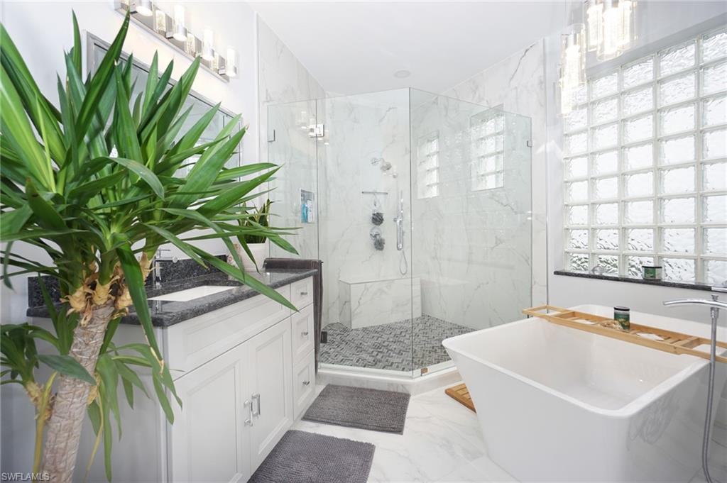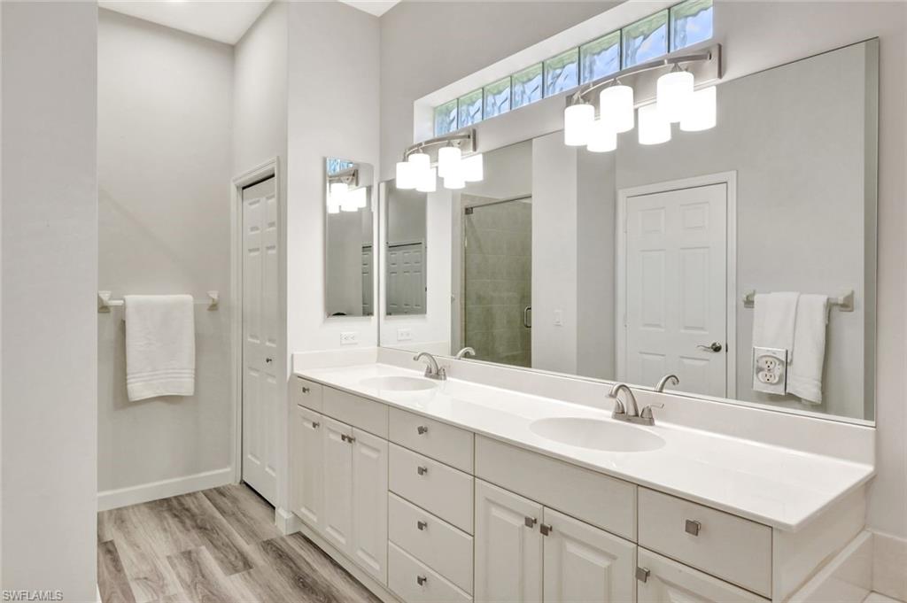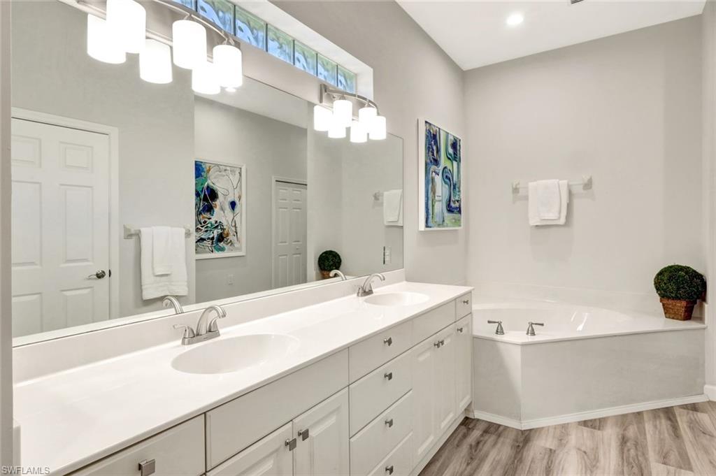 Discover a rare opportunity to own this stunning renovated contemporary 3BED, 2 BATH, 2 CAR GARAGE house in prestigious Bridgewater Bay community of the North Naples! Prime Naples location, only 15 minutes to 5th Ave, Mercato, beaches, not in a flood zone. Luxury living with a serene lakefront setting. Whole house renovated in 2023-2024. New 2023 luxury vinyl floors throughout, 2023 new inside and outside paint, 2024 new cabinetry, vanity and sink in laundry room. 2023 kitchen appliances. Open sunny South facing living room has dramatic wall of windows, soaring 14’ tray ceilings, great open-space living and dining rooms, delightful white quartz chef’s kitchen and a large lanai overlooking lake and fountain. Exquisite white kitchen has modern cabinetry, quartz countertops, pantry. Kitchen and breakfast areas open to oversized lanai, fabulous for grilling and outdoor entertaining. Luxurious master suite with 11’ coffered ceilings has custom organized walk-in closet, 2nd closet, elegant spa like bath and separate shower. Guest bath has new fixtures and countertops. Oversized attached 2 car garage with new 2024 cabinetry throughout, 2024 epoxy flooring by Encore Garage. Whole house surround sound audio system. Timeless décor and incredible attention to details! Backyard has plenty of room to further extend lanai and create your dream pool/spa oasis. Bridgewater Bay amenities include clubhouse w/ resort pool, spa, indoor lap pool, fitness center, 2 Har-Tru clay tennis courts,2 full pickleball courts, 2 Bocce courts, putting green, and more! “A” Rated North Naples schools. Take a 3-D Tour, CLICK on the 3D BUTTON and walk around.