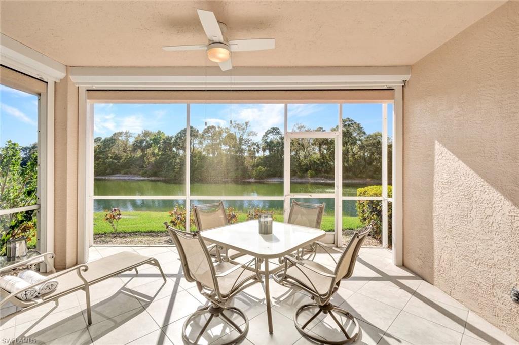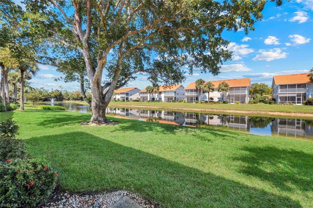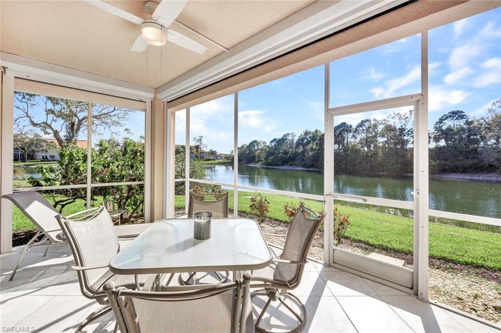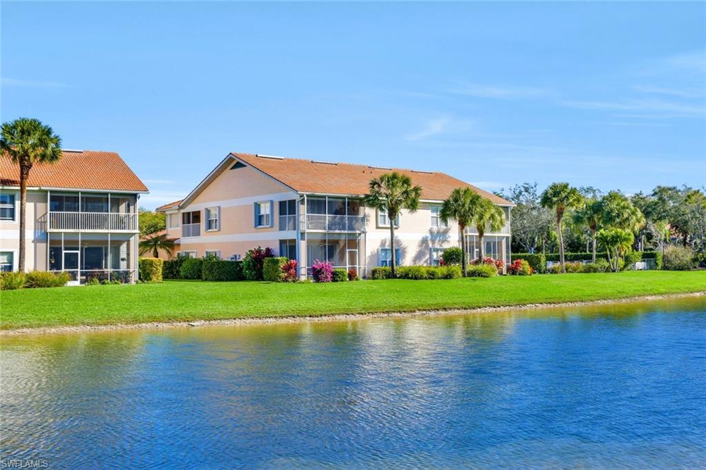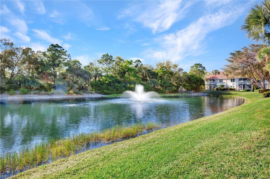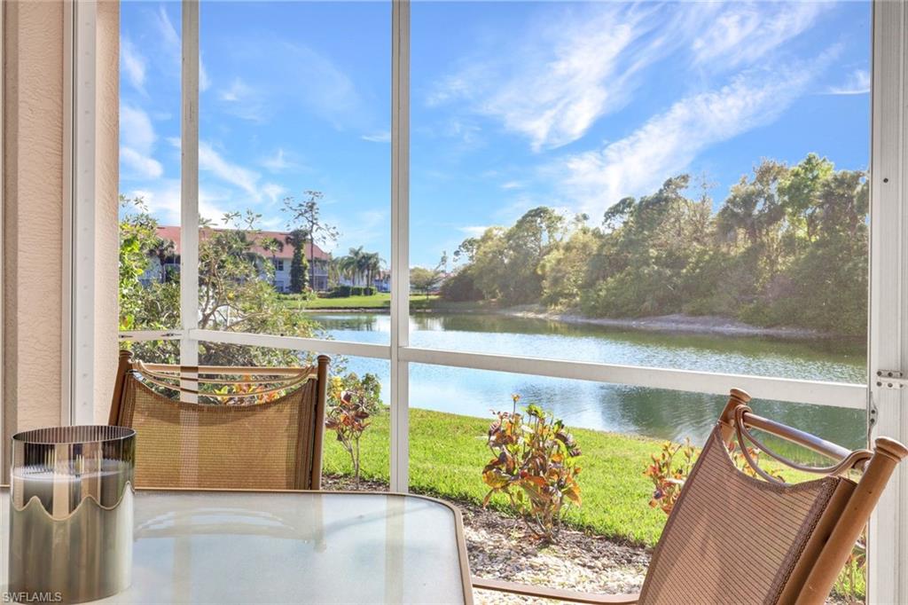 One of the best views in the community. Gorgeous first floor unit that is full of light with gorgeous lake, fountain and preserve views. You will love spending time on your back lanai watching the shore birds around the lake and enjoying the Florida lifestyle. This unit has a great open concept floor plan with 2 spacious bedrooms and a large lanai as well as a den space with separate side lanai that has added sliding glass doors so it can be used year round. The kitchen features light colored cabinetry and countertops, stainless steel appliances and a breakfast bar. Enjoy volume ceilings, decorative niches, updated lighting throughout as well as being freshly painted. Large neutral tile that is laid on a diagonal can be found throughout the living spaces and an upgraded carpet is in both bedrooms. Enjoy piece of mind with added hurricane protection. You are steps from the local resident pool as well as being a block from Carlton Lakes master association amenity center which features 60 ft lap pool, hot tub, bocce courts, tennis courts, tot lot, workout room and fishing pier. This community has great walkability to both Seed to Table as well as The Strand shopping center. You are minutes to shopping, dining and Naples gorgeous white sand beaches. This unit is sold with a 1 year home warranty for the new buyer.