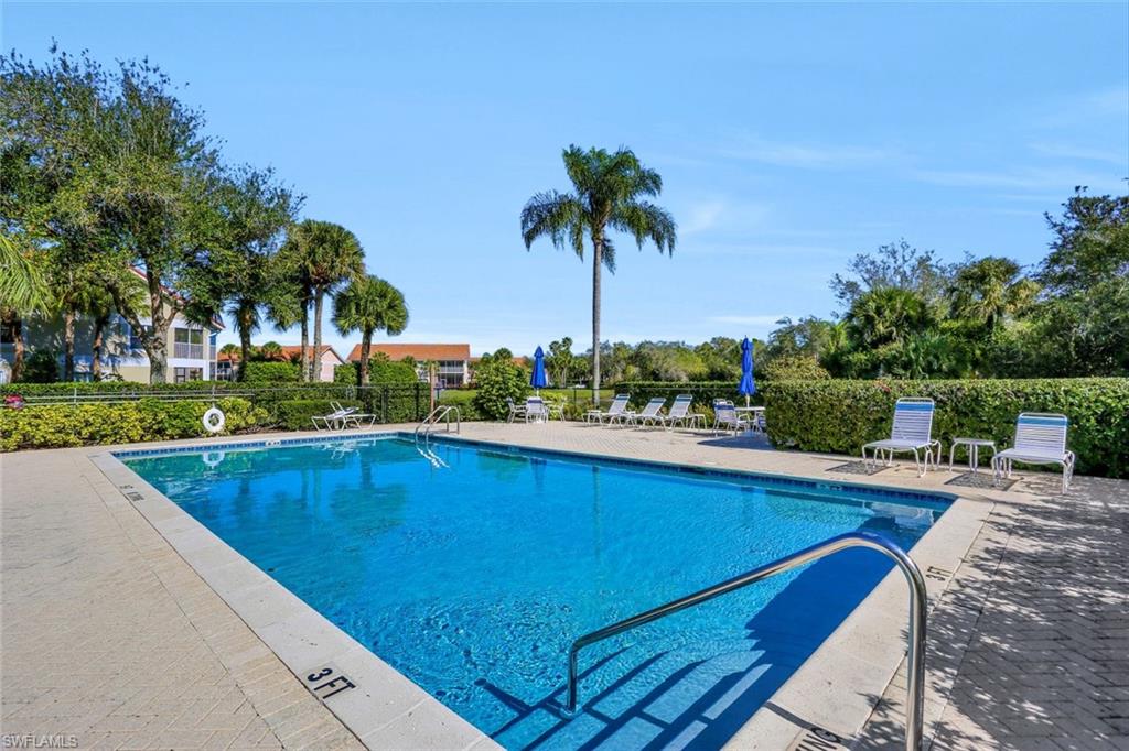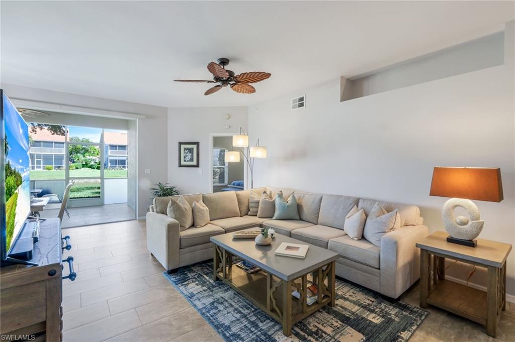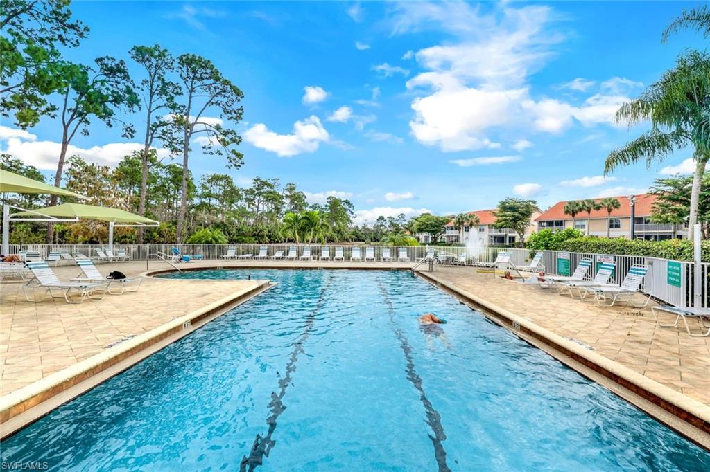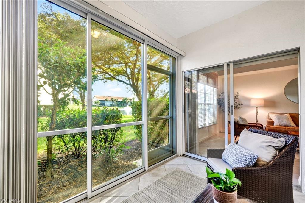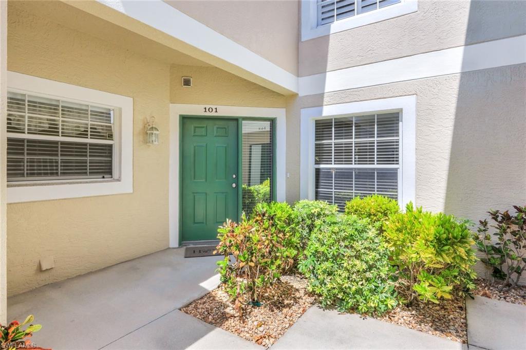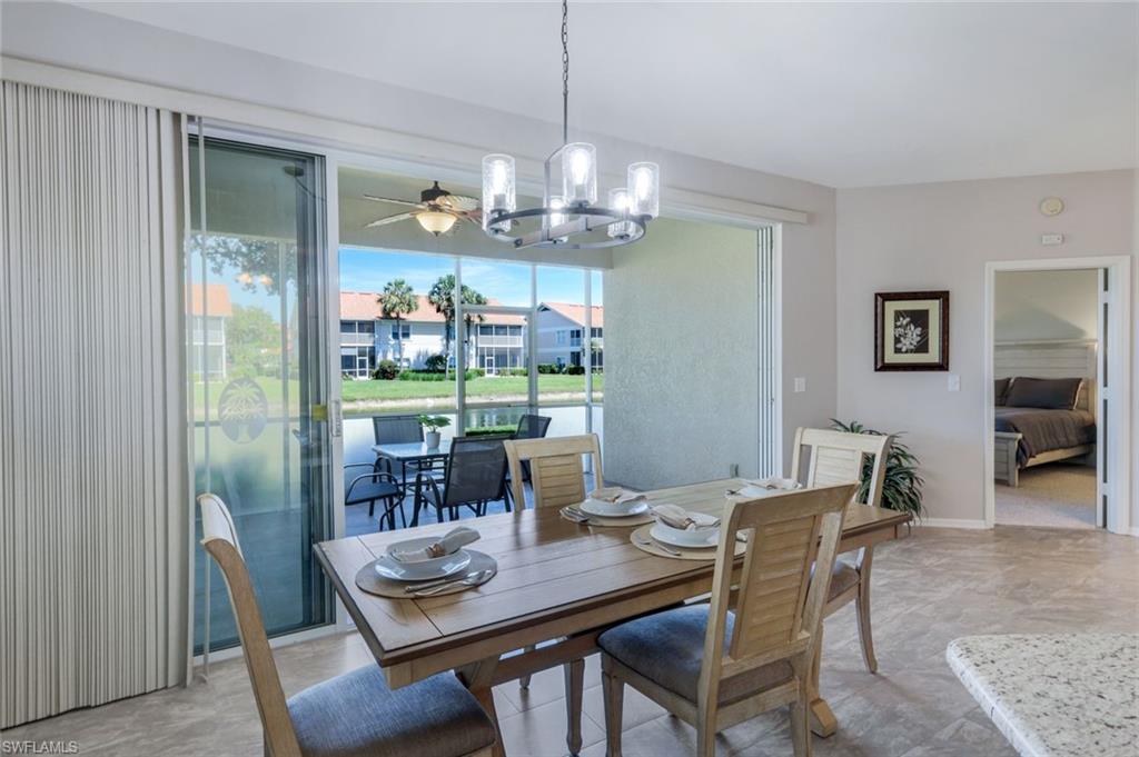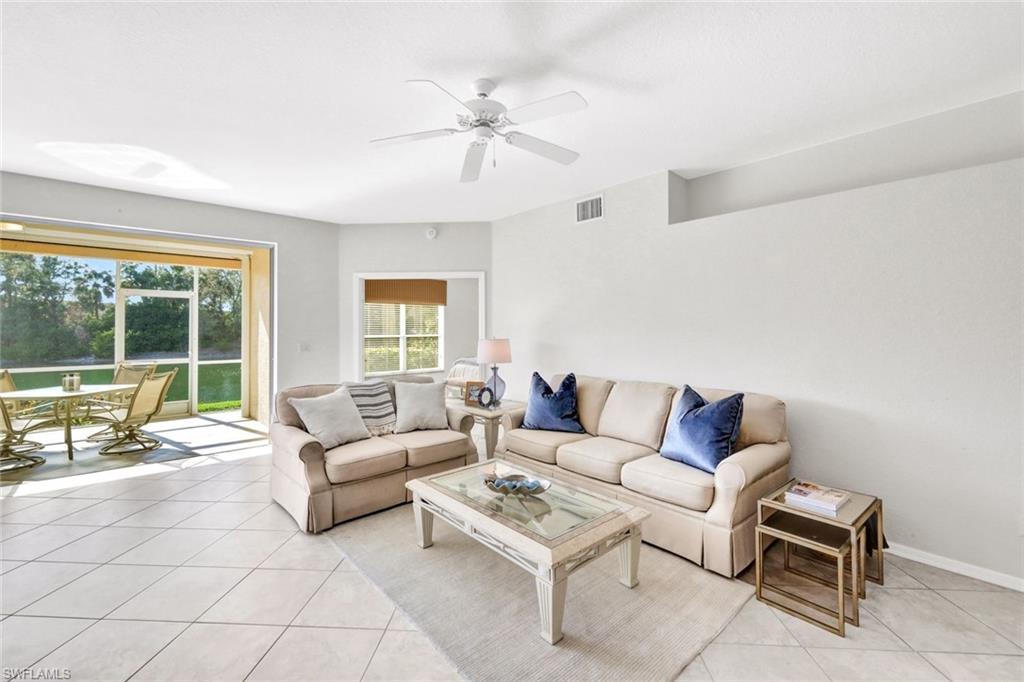 One of the best views in the community. Gorgeous first floor unit that is full of light with gorgeous lake, fountain and preserve views. You will love spending time on your back lanai watching the shore birds around the lake and enjoying the Florida lifestyle. This unit has a great open concept floor plan with 2 spacious bedrooms and a large lanai as well as a den space with separate side lanai that has added sliding glass doors so it can be used year round. The kitchen features light colored cabinetry and countertops, stainless steel appliances and a breakfast bar. Enjoy volume ceilings, decorative niches, updated lighting throughout as well as being freshly painted. Large neutral tile that is laid on a diagonal can be found throughout the living spaces and an upgraded carpet is in both bedrooms. Enjoy piece of mind with added hurricane protection. You are steps from the local resident pool as well as being a block from Carlton Lakes master association amenity center which features 60 ft lap pool, hot tub, bocce courts, tennis courts, tot lot, workout room and fishing pier. This community has great walkability to both Seed to Table as well as The Strand shopping center. You are minutes to shopping, dining and Naples gorgeous white sand beaches. This unit is sold with a 1 year home warranty for the new buyer.
