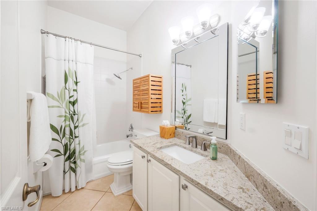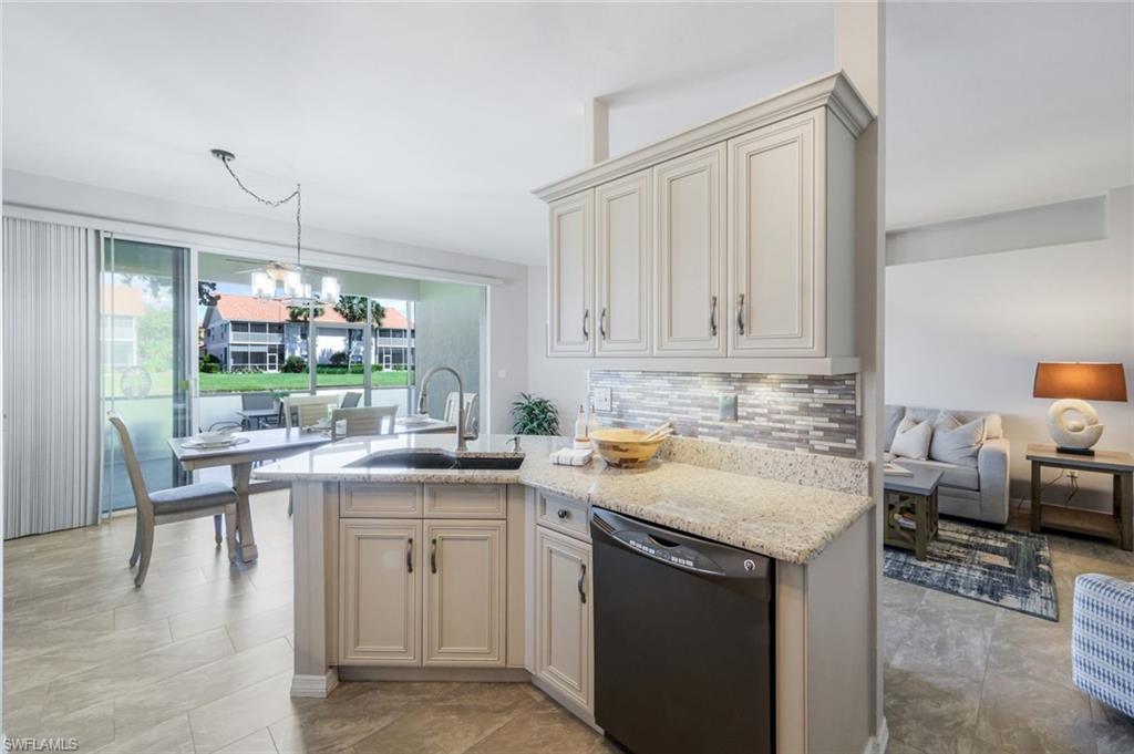 Beautifully updated 1st floor 3 bedroom, 2 bath lakefront unit with 1 car attached garage and private courtyard entry. Enjoy on updated kitchen with custom designed with grey cabinetry, granite counters, under counter tap lighting, stainless steel appliances and tiled backsplash. Gorgeous tiled flooring throughout living area and large guest bedroom laid in a subway pattern. Master bedroom features updated bath with custom cabinetry, dual sinks, granite counter tops and frameless shower door. The guest bath has also been updated with raised vanity, updated lighting and mirror. The larger of the two guest bedrooms also has a private lanai that has been enclosed with glass sliding glass doors and can function as a bonus room or lanai space. Enjoy gorgeous lake views from your tiled back lanai while dining alfresco. The AC has recently been replaced and is only 1 year old. This condo association has had all roofs replaced and also painted all exteriors of the buildings. You have ample guest parking just across the street and you are a short walk to the local resident pool. Carlton Lakes features great walkability to both Seed To Table as well as a local resident gate that offer pedestrian access to The Strand shopping plaza. Carlton Lakes amenities include club house with 60 ft lap pool and hot tub, tennis courts, bocce courts, tot lot, fishing pier and fitness room. This unit is being offered furnished with some exclusions and a one year home warranty for the new buyer at closing!