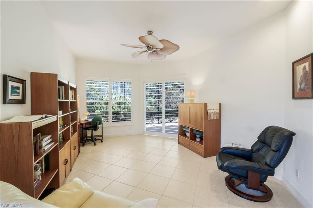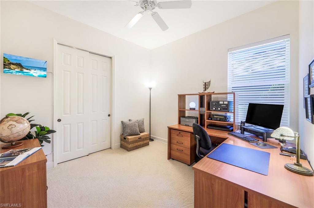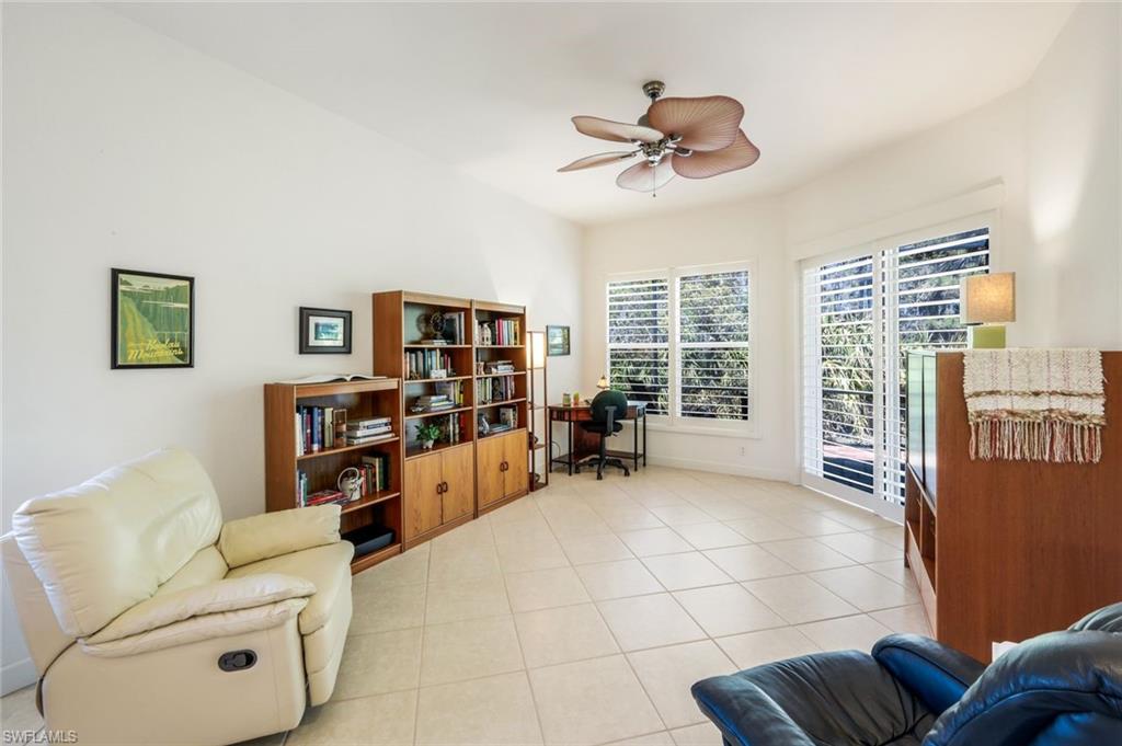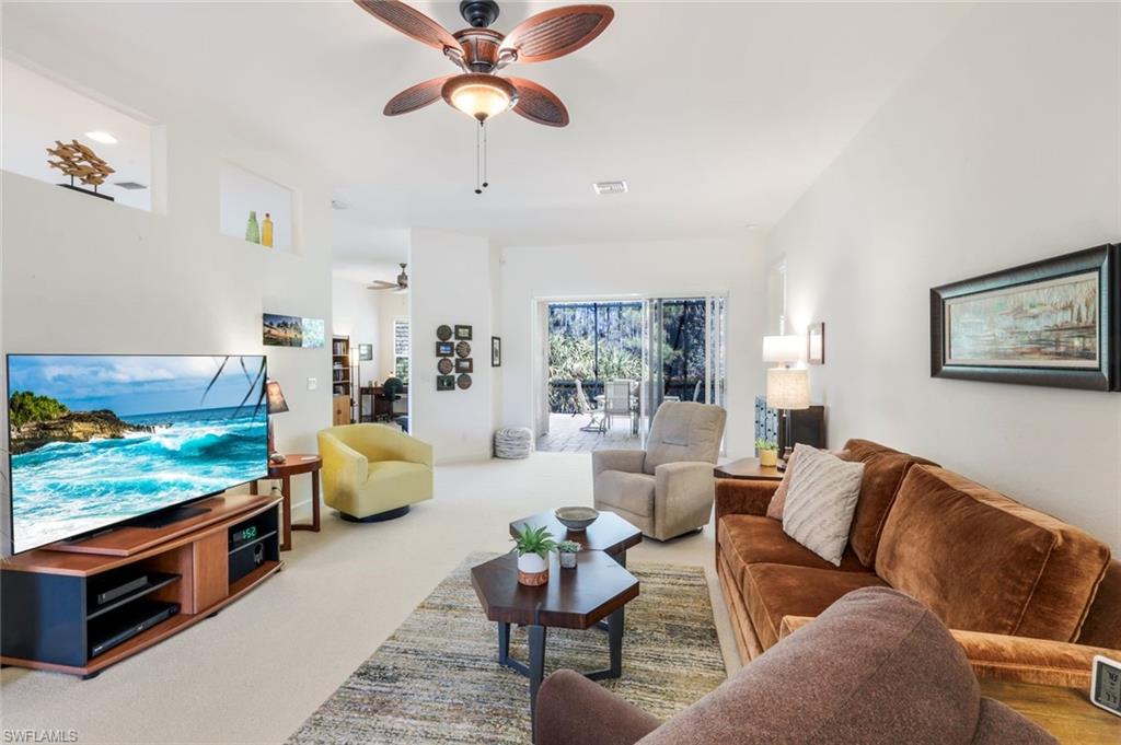 This attached villa is nestled in a tranquil and pleasant setting in the gated community of Carlton Lakes in north Naples. The home has vaulted ceilings and lovely wooded views from the screened lanai. There are 2 bedrooms plus a den and 2 full bathrooms with a split floorplan which gives privacy to all. Tile flooring extends through the main living areas, with carpet in the bedrooms and den. The office is perfect for a third guest bedroom, and it has great natural window light. The property is further enhanced by boasting storm protection shutters, an attached 2-car garage with built-in EV charger, and space for a private pool to be built in the backyard. The neighborhood is well-established with a welcoming Community Clubhouse. Fishing is allowed from the charming neighborhood overlook dock, where you might also catch a stunning sunrise or sunset. Amenities include a spacious pool, tennis courts, bocce, social events, sidewalk paths, mature trees and lush tropical landscaping. Enjoy 16 lakes & 50 acres of nature preserves all within Carlton Lakes. This residence is a wonderful choice for full time living, rental investment, retirement, vacations, or snowbirds. Cable, internet and lawn care are all included in the association fees. Close to amazing beaches, public golf, ample restaurants, local parks and also super easy to get to all conveniences such as grocery, gas, and the SWFL International Airport. This is your chance to own a special slice of paradise.