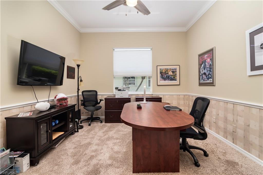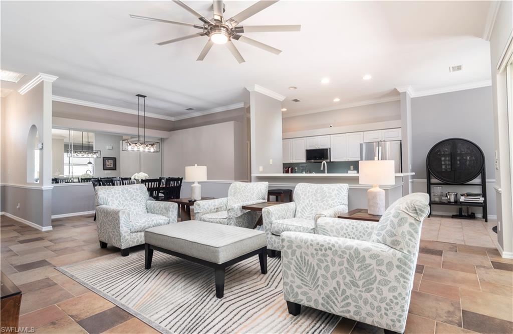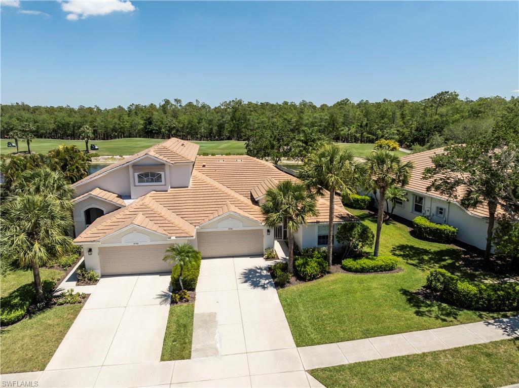 This first floor, turnkey furnished condo with an incredible golf course view must be seen to be believed! This beautifully maintained Veranda III residence is located in the highly sought-after Cedar Hammock Golf & Country Club, a premier bundled golf community in Naples. Offering 2 bedrooms plus a den, 2 full bathrooms, and a detached 1-car garage, this spacious home features 1,414 sq. ft. of living area (1,714 sq. ft. total including the front and rear screened lanais). Inside, you’ll find a bright open layout with crown molding, chair rails, and elegant travertine tile floors in the main living areas, complemented by luxury vinyl faux wood flooring in the bedrooms and den. The kitchen has been updated with quartz countertops, stainless steel appliances, and ample cabinet and pantry space. Enjoy peaceful mornings or relaxing evenings on either your front veranda or rear screened lanai—recently re-screened in 2025 and featuring Florida glass for added privacy. Notable updates include hurricane-impact windows, high end washer/dryer, new tile roof and exterior paint (2020), and surge protection throughout. The property also includes Wi-Fi readiness and plenty of guest parking nearby. Cedar Hammock offers a recently redesigned 18-hole championship golf course, practice facilities, resort-style pools, tennis and bocce courts, a fully equipped fitness center, and a beautifully renovated clubhouse with both casual and fine dining options, all within a guard-gated community just minutes from downtown Naples and the beaches. This is the one!