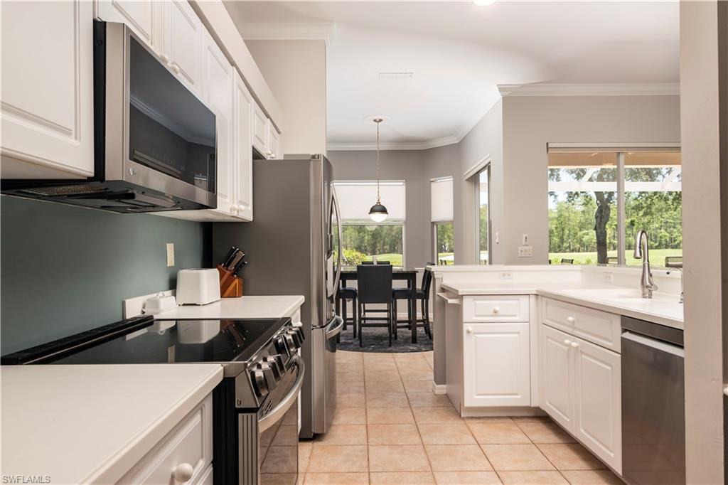 First floor, end unit Abbey (highly coveted!) is light and bright with just under 2000' square feet. The condo has large, south facing windows, with the back lanai overlooking the fairway of the 9th Hole of Cedar Hammock Golf and Country Club's award winning golf course. The 2 bedroom + den/2 bath has large front and back lanais for wonderful outdoor living, great storage with 3 walk in closets, two linen closets, plus a one car garage with extra storage. Large, neutral tile on the diagonal greets you in the nicely updated, eat in kitchen with updated cabinets, granite countertops, farmhouse sink, newer appliances and light fixtures. Brand new AC with transferable warranty, and the washer, dryer, hot water heater have also been updated. Freshly painted bedrooms and den have newly installed, gorgeous, light, wood laminate floors. The grand master bath has large walk in shower, separate soaking tub, the toilet in a private water closet, a linen closet and dual sinks for plenty of personal space, has also been freshly painted. Watch breathtaking sunsets from the comfort of your lanai while also viewing deer and birds wandering by. This unit is being offered turnkey so just pack your suitcase and golf clubs to unwind in your own slice of Naple's paradise. Cedar Hammock is a bundled golf community, 6,680-yard Par 72 Course, that was designed by two legendary golf course architects, Jed Azinger and Gordon Lewis. The redesigned Community Center features both indoor and outdoor dining options, a new resort pool, 2 story fitness center with professional trainer, pro shop, a competitive tennis program on updated courts, bocce courts with popular community programs. Close to both downtown Naples and Marco Island, great restaurants and shopping, all next to gorgeous white sand beaches.