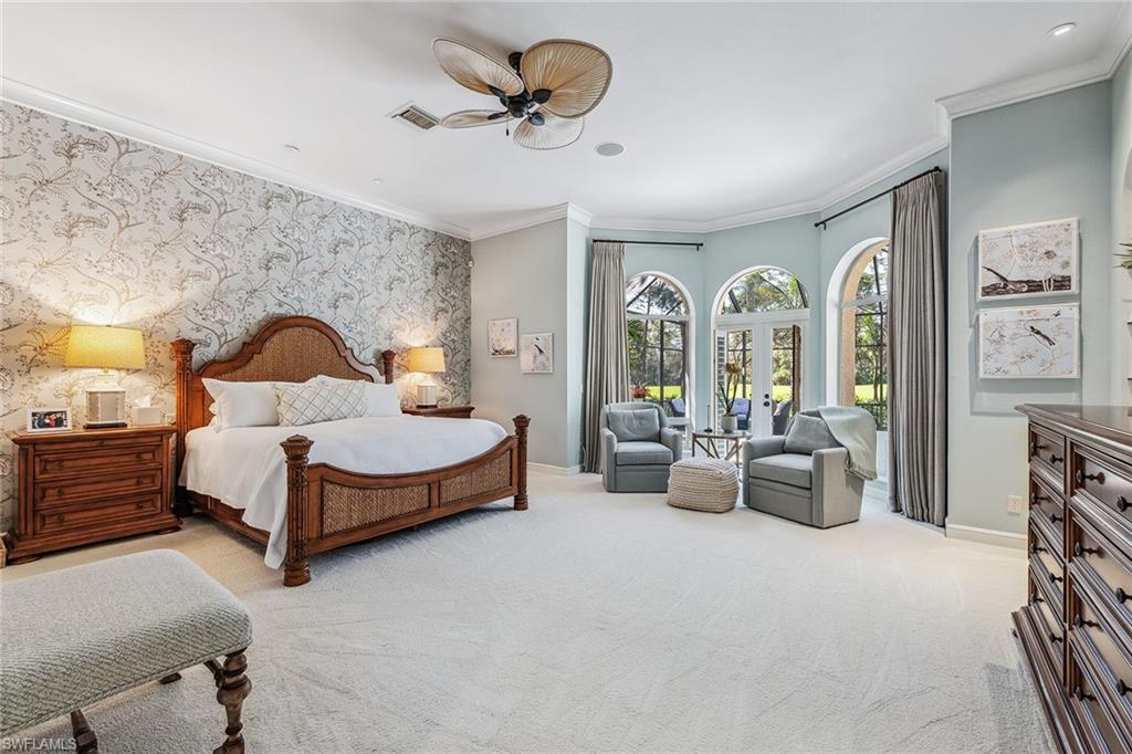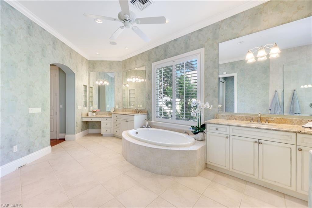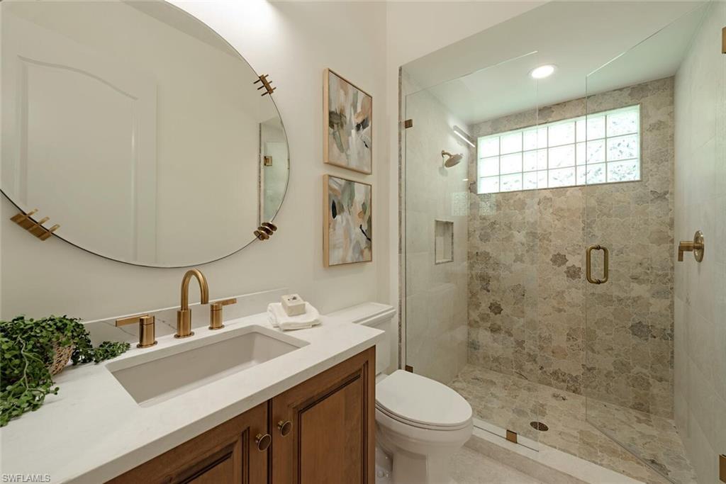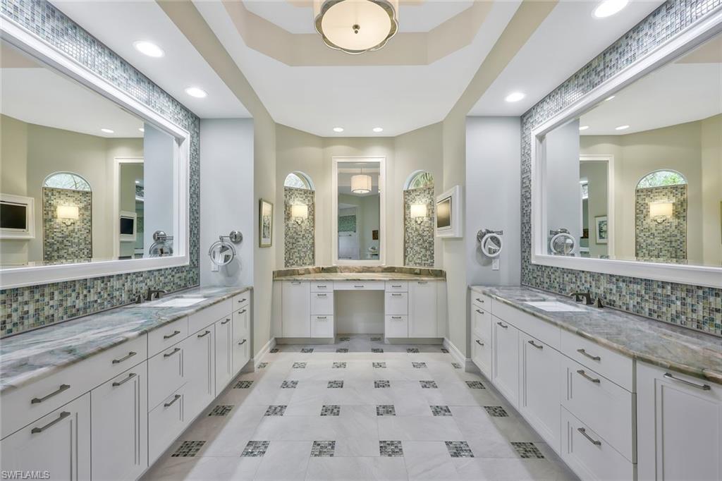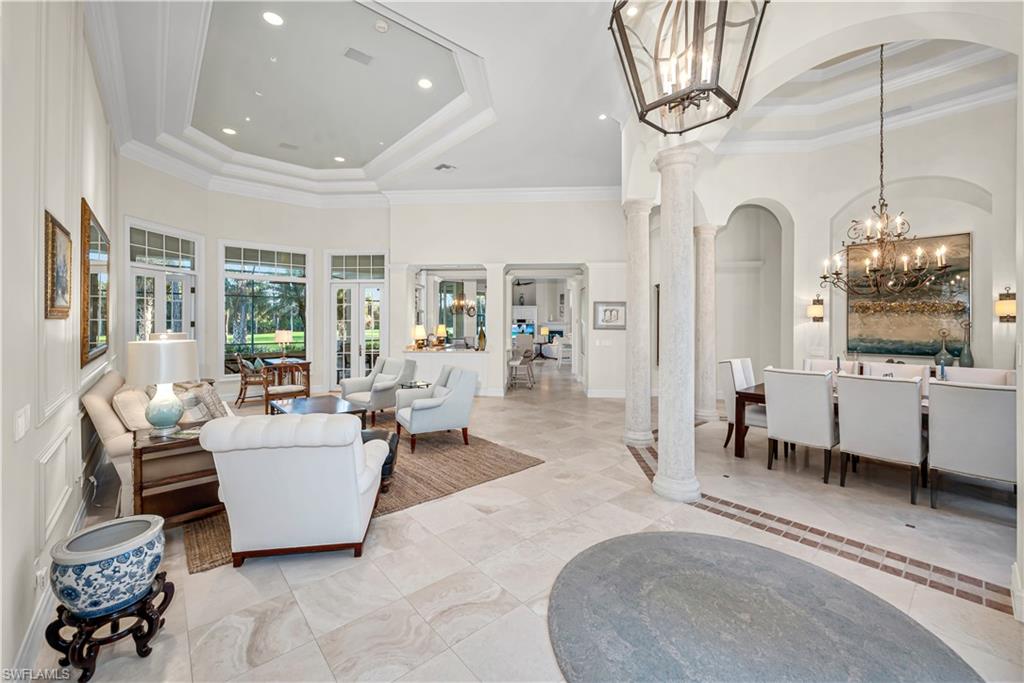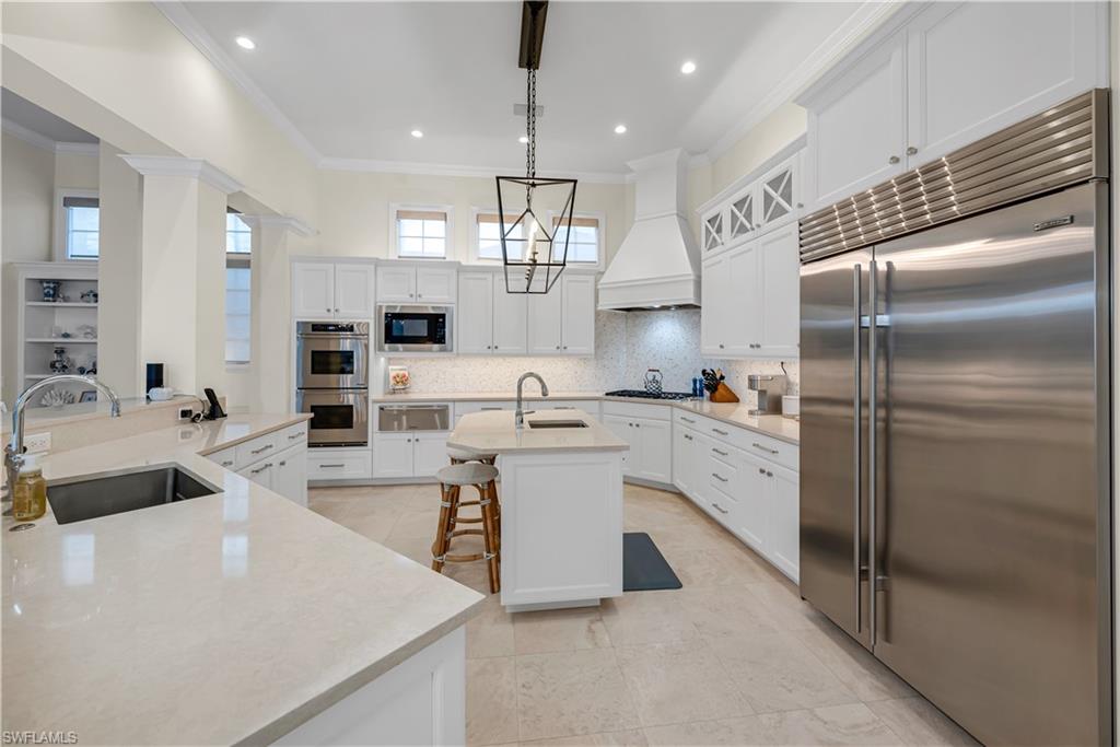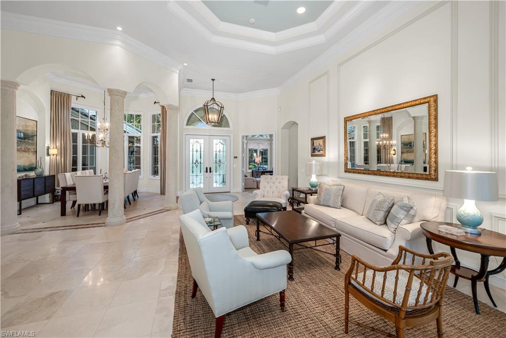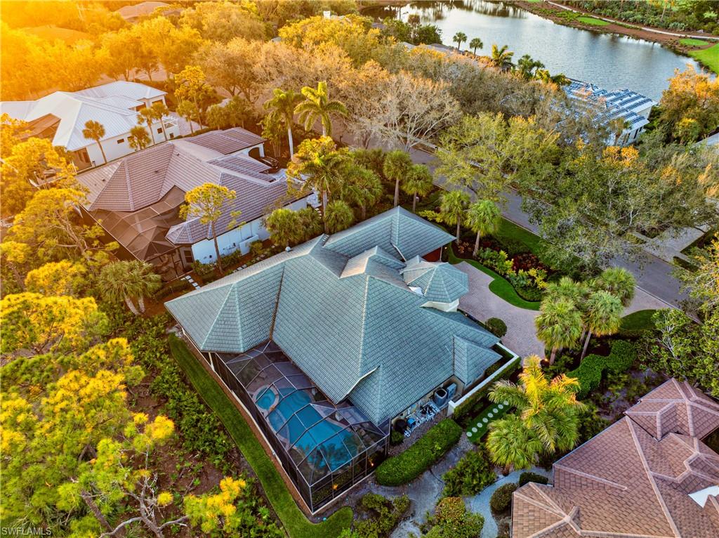 Sophisticated, stylish and sunny retreat describes this beautifully renovated residence on a private cul-de-sac lot with serene southern exposure lakefront setting. This sprawling residence offering over 8,500 square feet in total area is an entertainer's delight with spectacular foyer entrance with 17-foot ceilings, huge windows, climate-controlled 700-bottle wine cooler with beautiful glass door and great room with big views and impact pocket sliding doors leading to the 2,700-square-foot lanai with ample covered and uncovered entertaining area. The sleek cook’s kitchen offers Thermador appliances, six-burner gas stove, double oven, center island, bar area and huge walk-in pantry. Many improvements include four stunning renovated baths, exquisite light fixtures, new roof and screened enclosure in 2018, two new water heaters in 2022, marble floors in living area and guest suite, wood floors in owner’s suite and study, generator, gas fireplace, built-in safe, Sonos sound system and speakers throughout living area, Ring security and summer kitchen with Artisan grill and sink. The large owner’s suite offers beautiful views, two walk-in closets, large bath with private garden setting with inside and outside showers. Huge private guest suite upstairs with large screened and open balcony overlooking the lake. Long driveway leads to the fabulous oversize 927-square-foot garage with built-in cabinets, third bay for golf cart and car lift for the auto collector. Immediate golf membership available with purchase, negotiable furniture package and pristine condition make this home move-in ready. Collier’s Reserve's natural beauty of 450 acres was recognized as the world’s first Audubon Signature Sanctuary community and offers world-class club amenities, championship golf, active tennis, pickleball and bocce, newer fitness center, excellent food with friendly staff, and overall superb location in Naples, less than two miles to Vanderbilt Beach.
