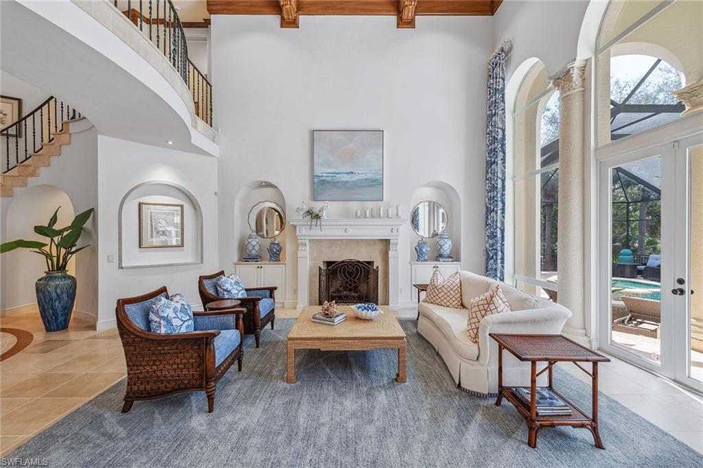 Masterfully designed updated & elegant estate home on a beautifully manicured street in Colliers Reserve! This spacious and light custom-appointed home welcomes you through oversize solid mahogany wood double entry doors into an awe inspiring grand entrance foyer with 22' soaring ceilings, diagonally set marble floor, and magnificent sweeping curved staircase with marble treads and wrought iron railings with solid brass banister. Light and airy interiors feature designer lighting and window treatments, oversize rich crown moldings and millwork, and a chef's dream custom kitchen featuring a Thermador 5 burner gas cook top, wood paneled vent hood with polished and tumbled marble border detail, upper & under cabinet lighting, Thermador thermal wall oven, and exquisite granite countertops with seating at center island. Custom 8ft solid wood doors through out. The primary suite bath feels like an oasis with dual marble vanities and separate frameless walk in shower and Mirabelle Therapy bubbler spa tub. There is ample space for entertaining family and friends with a separate bar area and designer stylish wood accented outdoor covered living space. Luton lighting system throughout with programmable features via a Savant home automation system. A separate office/den features custom raised panel natural finish entry doors complimenting wood paneling and crown moldings with wide plank royal mahogany wood floors. Enjoy the peace & serenity outdoors around an oversized 35x16 sparking lap pool and raised spa with greenery views of preserve & the golf course. Colliers Reserve enjoys designation as an Audubon Signature Sanctuary community spread out on over 450 acres of lush landscaping and natural beauty unmatched in Southwest Florida.