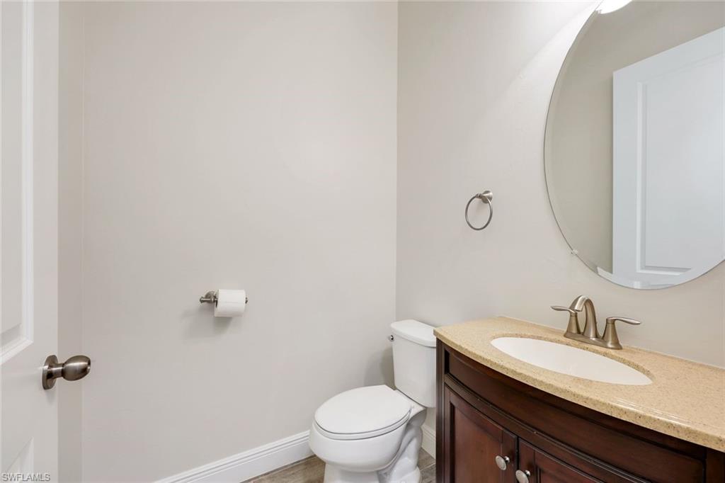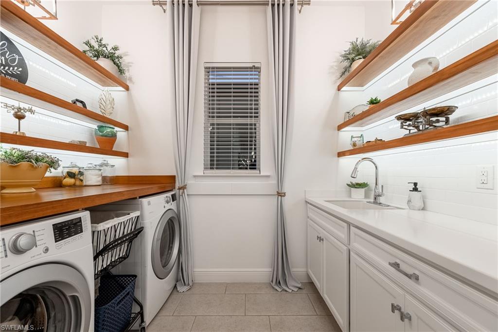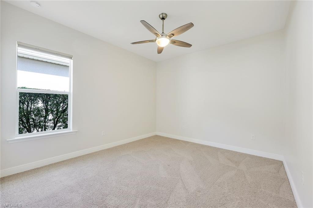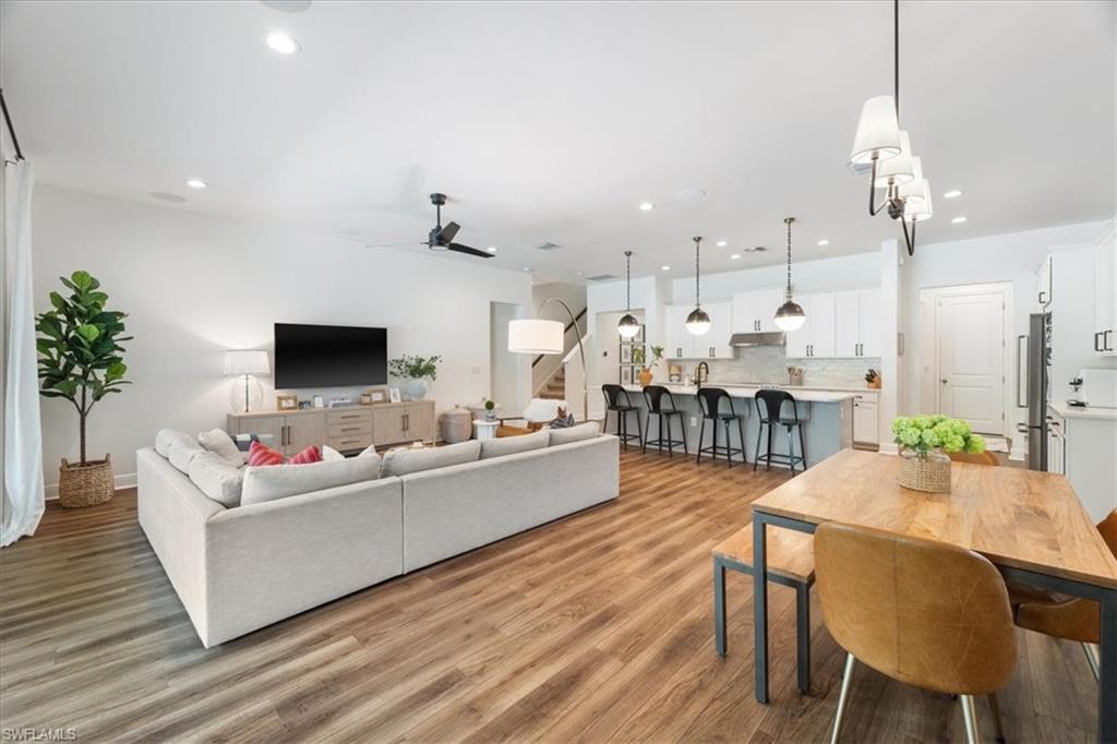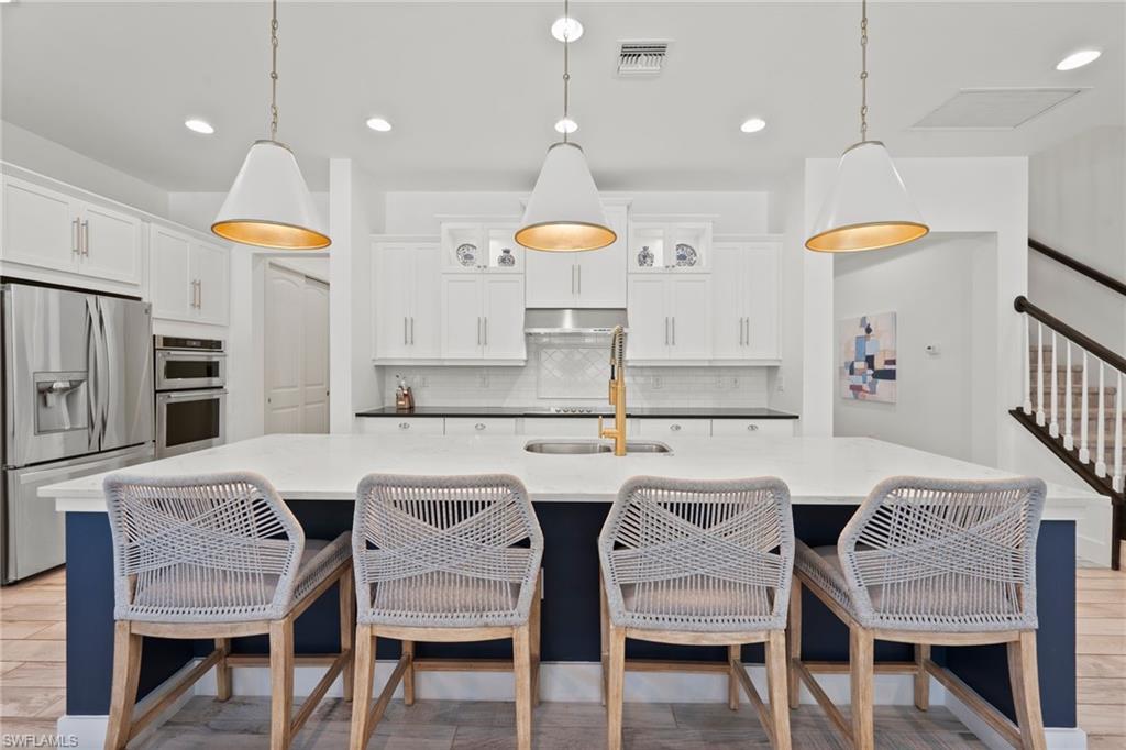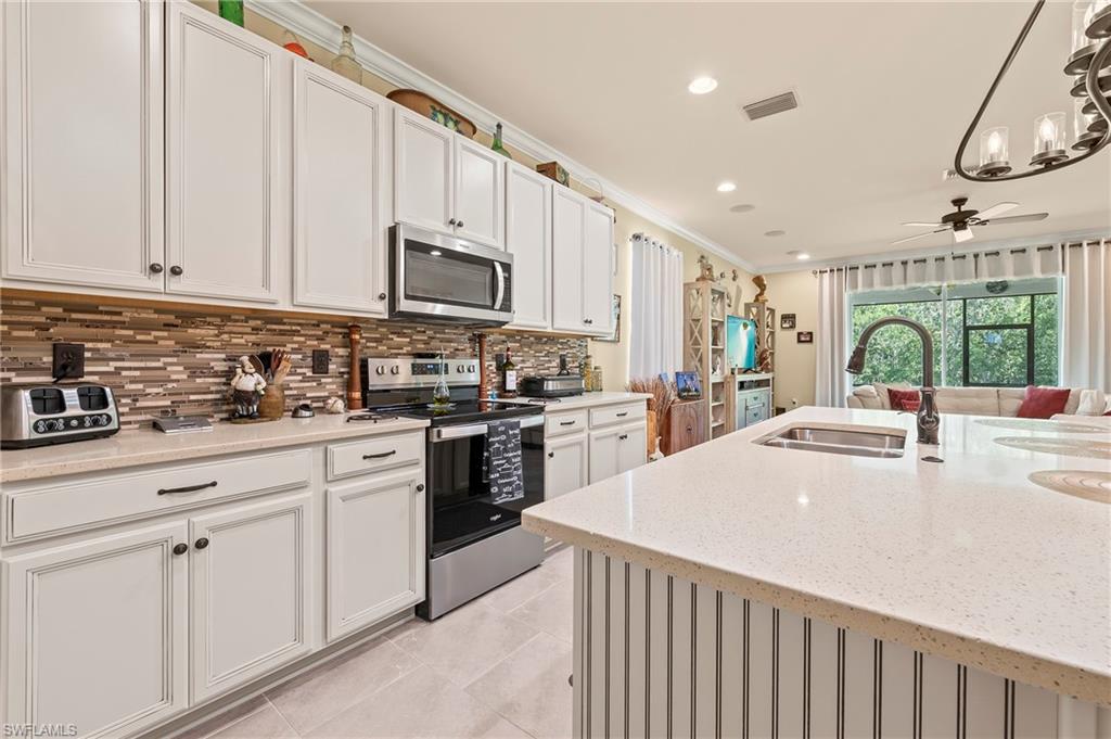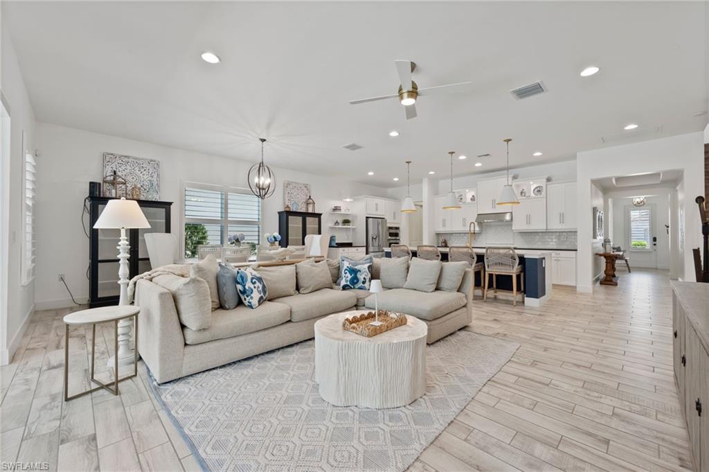 Modern, move-in ready, and effortlessly fresh—this North Naples home blends smart design with a laid-back, community-driven lifestyle. Located in the gated community of Compass Landing, this 3-bedroom + den, 2.5-bath home is full of stylish upgrades and custom touches that set it apart. Property comes with $3,000 worth of interior design services - ask the agent for details! Soaring vaulted ceilings welcome you in the entry and primary suite. The chef’s kitchen features quartz countertops, LED under-cabinet lighting, and upgraded cabinetry, while the custom birch slab desk, laundry room cabinets, framed mirrors, and built-in bench add both character and functionality. Bathrooms include tile to the ceiling and elevated finishes, and every bedroom is wired with co-ax cable and dimmer switches. Enjoy peaceful water views from every back window, a fully fenced yard with a privacy wall, a screen-enclosed lanai, and pre-wiring for a pool. Epoxy garage floors and built-in garage storage round out the thoughtful upgrades. Compass Landing offers a resort-style clubhouse, pool and spa, fitness center, shaded playground, and vibrant neighborhood events throughout the year. Zoned for Bear Creek Elementary and Gulf Coast High School. And when it’s time for dinner or drinks? Hop on your golf cart, bike, or ride over to nearby Founder’s Square—it’s all just minutes away.