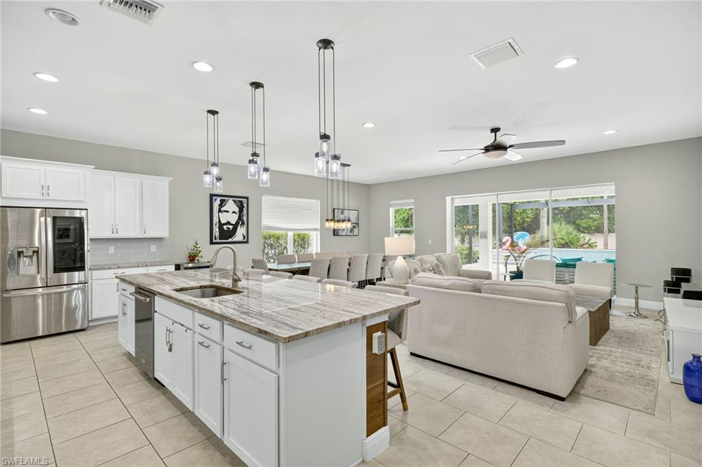 Modern single-story home which allows the ultimate SWFL lifestyle with your own private resort style saltwater heated pool, large custom 10-person spa, Elevated sunbathing deck, poolside full bar including liqueur on-tap, and full outdoor gourmet kitchen. Pool Heater 3x standard capacity for extra fast and extra hot at the touch of a button. Enjoy overlooking the community lake with fountain, as well as your 6000 Gallon Acrylic KOI Pond, makes your outdoor space even more of a tropical oasis. One of only a few homes in community on gas. 900 Gallon tank provides natural gas to both outdoor kitchen, outdoor fire-pits and indoor kitchen range. Home runs a usual FPL bill of $0 with a extra-large 56 panel solar system. Master suite includes oversized walk-in shower with Multiple shower heads and Dual Zone Hot water controls. Master suite also includes extra-large walk-in closet with built in closet organizers. Uplighting and enhanced ambiance lighting by pool and spa. All outdoor pool, spa, fire-pits, and lighting are automated thru remote control or mobile app. Home includes video security system. Come enjoy this beautiful paradise with KOI which attract positive forces and numerous beneficial outcomes. Attic has been set up for extra storage. Home equipped with Hepa air filtration system. Community is centrally located and part of a A+ School System. Close to shopping and beaches.
