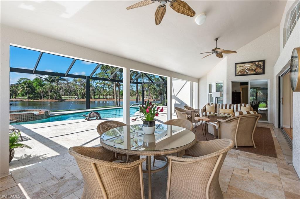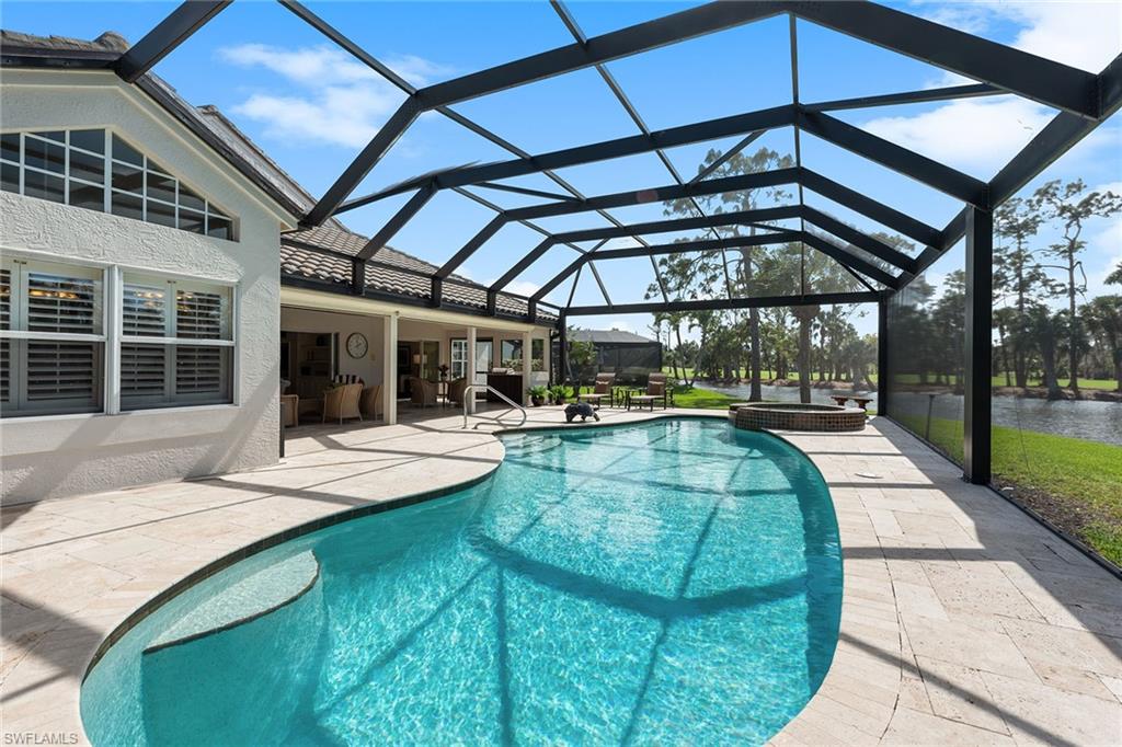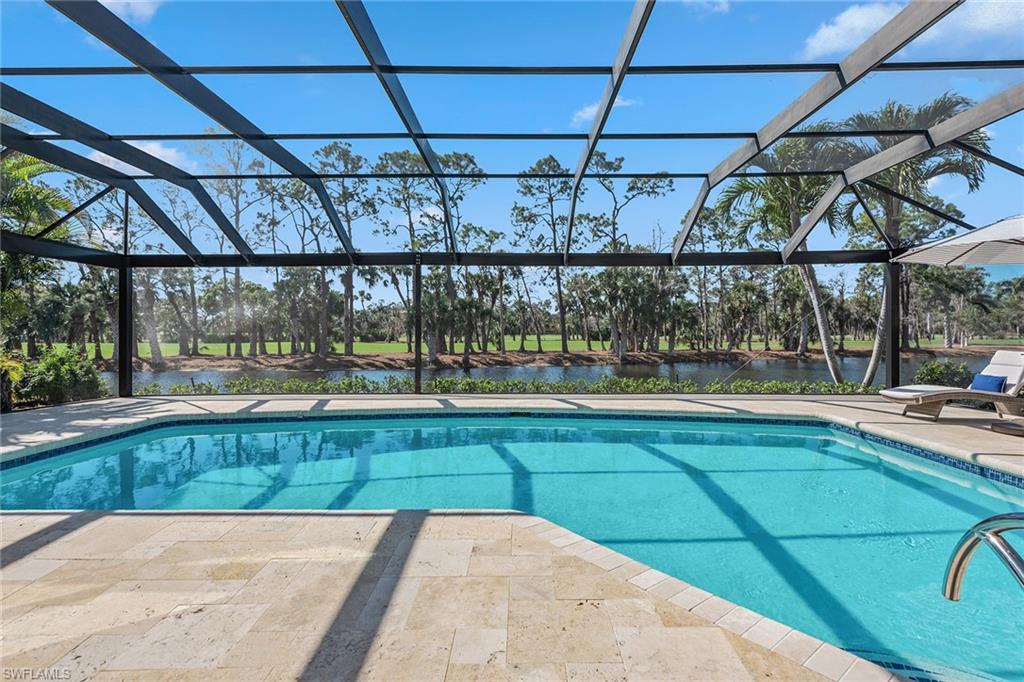 Positioned to capture sweeping west-facing water and golf course views, this refined three-bedroom, two-and-a-half-bath estate home in Eagle Creek Golf and Country Club offers a rare blend of privacy, elegance and resort-inspired living. As the sun sinks over the fairways, enjoy an unrivaled front-row seat to Naples famed sunsets from nearly every vantage point. Inside, marble flooring flows throughout most of the residence, setting a sophisticated tone that carries from the foyer into the bright and open living spaces. The updated kitchen, designed with form and function in mind, features solid wood cabinetry, premium appliances and a walk-in pantry, a thoughtful blend of timeless design and everyday utility. The light-filled primary suite is a serene retreat, with long views of the pool and tranquil vistas beyond. Two custom walk-in closets and a bath finished in elegant marble add a quiet sense of luxury. Outdoors, the residence unfolds into a destination all its own. A large covered lanai and expansive marble pool deck frame the oversized pool and spa, while a panoramic screen enclosure ensures every view remains uninterrupted. It’s a space designed to be peaceful and social, equally suited for quiet mornings or evening gatherings. Recent updates, including a newer tile roof, air conditioning system and water heater, provide peace of mind and lasting value. A short distance away, the newly renovated Eagle Creek clubhouse invites residents to experience championship golf, elevated dining and a vibrant social calendar. For those seeking wellness and leisure, the nearby Crystal Lake clubhouse offers outdoor dining, a fitness facility, tennis and pickleball, and a resort-style pool set among lush landscaping. This is more than a home, it’s a lifestyle framed by views, and tailored for the best of country club living.