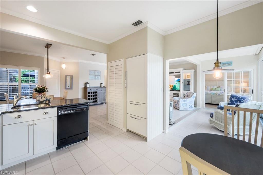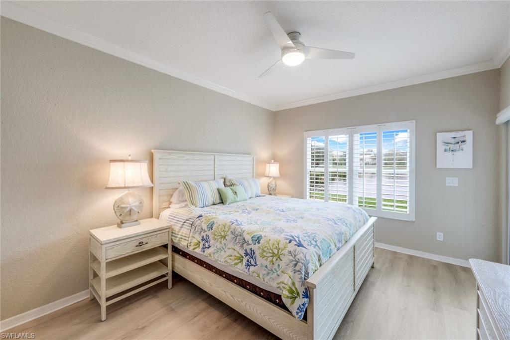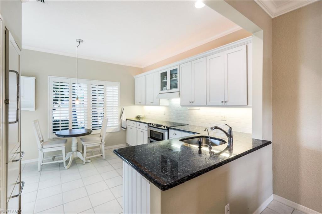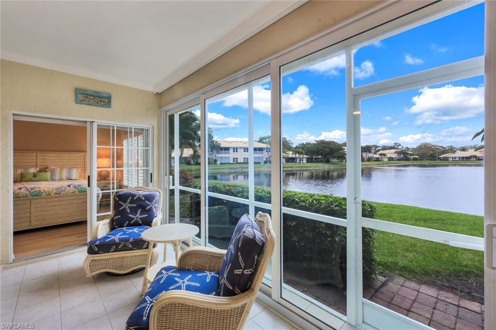 Wake up to breathtaking sunrises over the sparkling, long lake from the most sought-after building in Emerald Bay! Enjoy your morning coffee while taking in the scenic views from this beautifully updated and turnkey furnished condo, designed for comfort and style. It’s perfect for easy move-in or could serve as an exceptional seasonal investment property. Upon entry, you’ll be greeted by a charming, furnished courtyard that sets the tone for the inviting interior. Inside, the bright, open-concept living area features a spacious great room, dining area, and kitchen – ideal for both relaxing and entertaining. The kitchen has been thoughtfully renovated with crisp white shaker cabinetry, elegant granite countertops, a stylish backsplash, ambient lighting, slide-out shelves, a reverse osmosis water system, and a premium Subzero fridge. Both bathrooms feature stylishly updated vanities and sleek frameless glass showers for a polished look. Additional highlights include brand-new luxury vinyl plank flooring in the bedrooms, crown molding, decorator lighting, new ceiling fans, plantation shutters, built-in bedroom closets, and a motorized window shade at the slider for added privacy & convenience. The front door features a glass/screen combo to let in the breeze while keeping insects out. You can rest easy with impact windows and slider doors throughout, as well as a new water heater for peace of mind. The Villages of Emerald Bay is a picturesque, gated community located just west of U.S. 41, conveniently close to Delnor-Wiggins State Park, Vanderbilt Beach, Barefoot Beach & Bonita Beach. Its prime location places residents between two popular shopping and dining destinations, Mercato and Coconut Point Mall, making it ideal for those seeking both tranquility and accessibility. The neighborhood is renowned for its tree-lined streets and offers an array of amenities, including two community pools (this unit is just steps away from one of them), a hot tub, clubhouse, tennis/pickleball courts and an active social calendar. The Villages of Emerald Bay seamlessly blends a peaceful sanctuary with convenient access to all the best dining, shopping, and attractions that Naples and the surrounding areas offer. Whether you're looking for a serene winter retreat or a smart investment, this condo has it all!