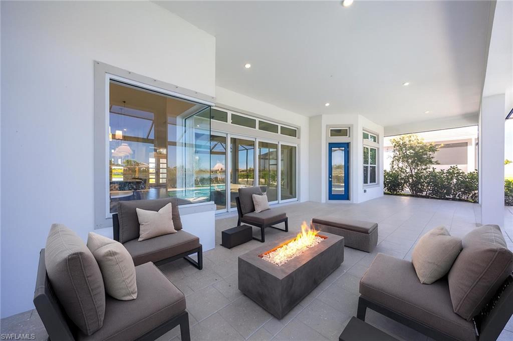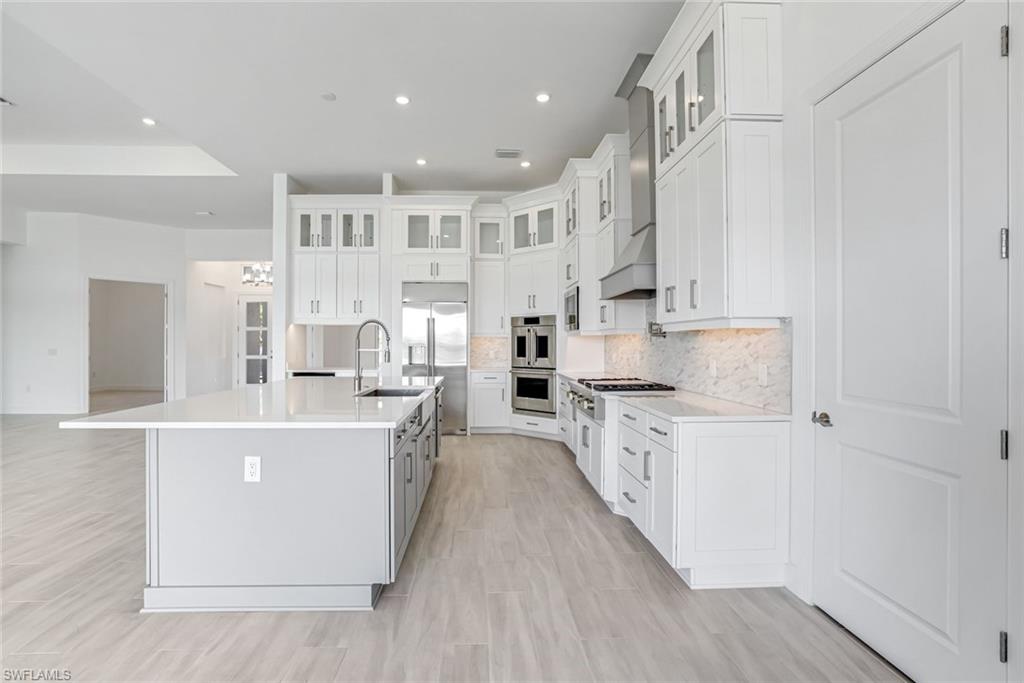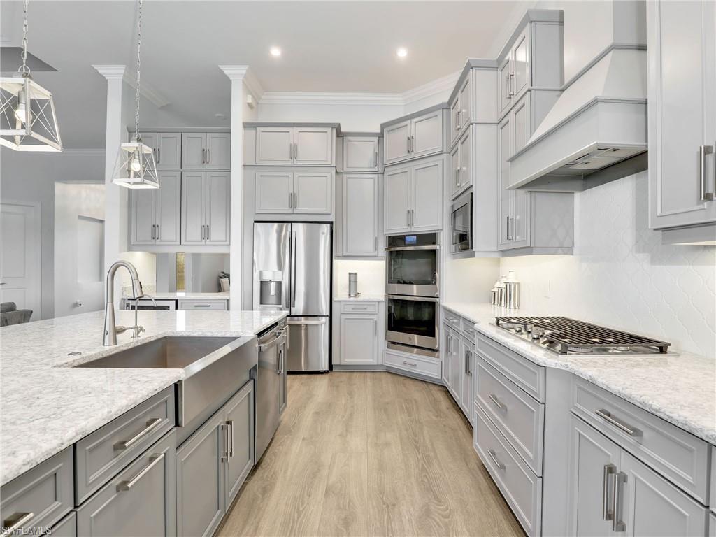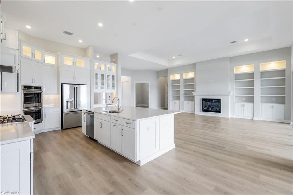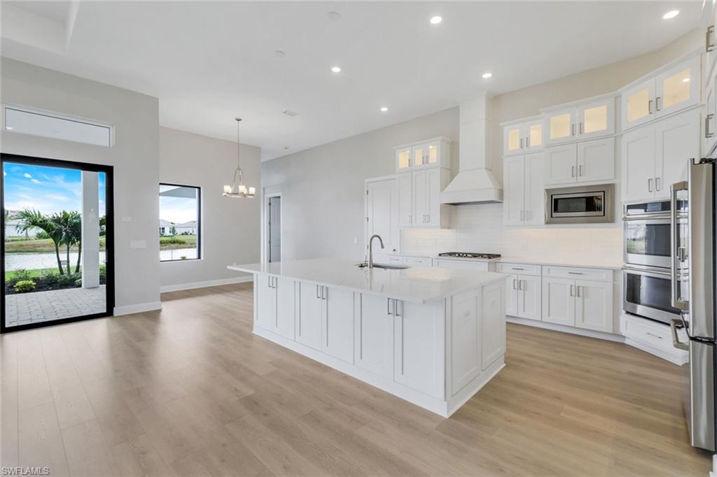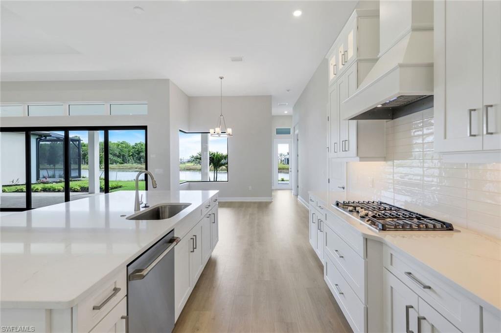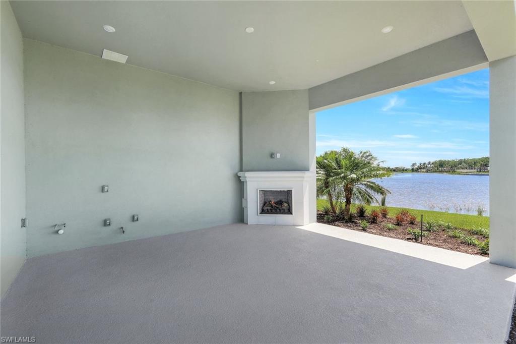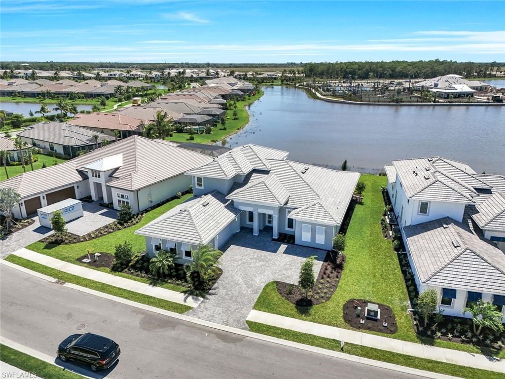 NEWLY BUILT LAKEFRONT POOL HOME WITH UNOBSTRUCTED VIEWS. This 4,500+ sq ft residence sits on a $400K premium lot with long lake views, complete privacy, and no future development across the water. The home impresses from the moment you arrive with an extended paver driveway, upgraded elevation, and hurricane-impact windows and doors. Inside, soaring tray ceilings, wood-beam accents, wainscoting, custom millwork, and wood-like tile floors create a warm, elegant feel. The open great room showcases panoramic lake views, a custom fireplace, built-in TV, and Sonos surround sound. The chef’s kitchen features quartz countertops, a massive island, gas cooktop, double ovens, dual wine coolers, soft-close cabinets, under-cabinet lighting, and a stylish glass-front bar. The first-floor owner’s suite is a private retreat with a bay window overlooking the lake, his/her walk-in closets with built-in cabinetry, and a spa-like bath with quartz counters, dual vanities, and a massive walk-in shower with three shower heads. Each guest bedroom includes an en-suite bath and walk-in closet. Upstairs, the bonus room offers a wet bar, lounge area, a full bath, and an additional guest suite with another full bath attached—perfect for entertaining or hosting guests. The outdoor living space is a true oasis with a gas-heated saltwater pool and spa, panoramic screens, extended lanai space, a full outdoor kitchen with grill, stovetop, sink, fridge, and a dedicated pool bath. Additional highlights include a 3-car epoxy garage, three AC units, tankless water heater, natural gas, generator-ready hookup, and no flood zone. Esplanade by the Islands offers resort-style living with a clubhouse, wine bar, restaurant, tiki bar, fitness center, dog park, and full social calendar—all minutes from Marco Island, Downtown Naples, and Gulf beaches. This home combines custom design, high-end finishes, and a one-of-a-kind lakefront lot—truly a rare find. MAKE AN OFFER TODAY.