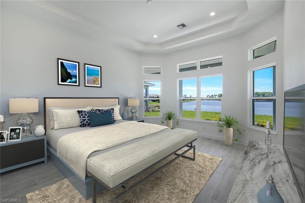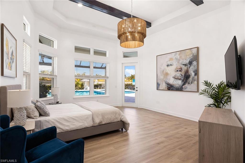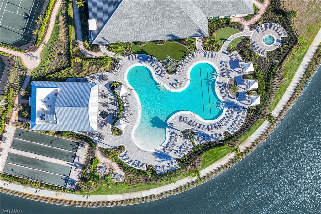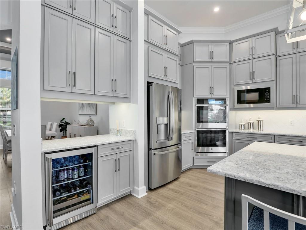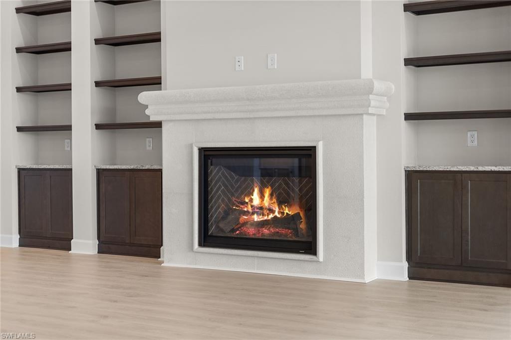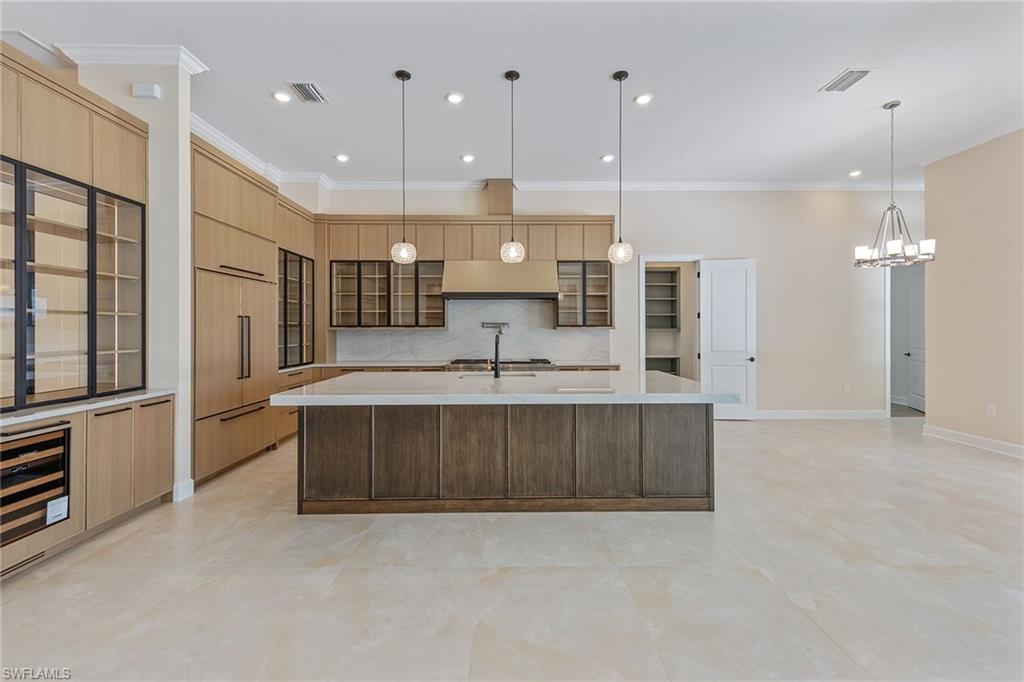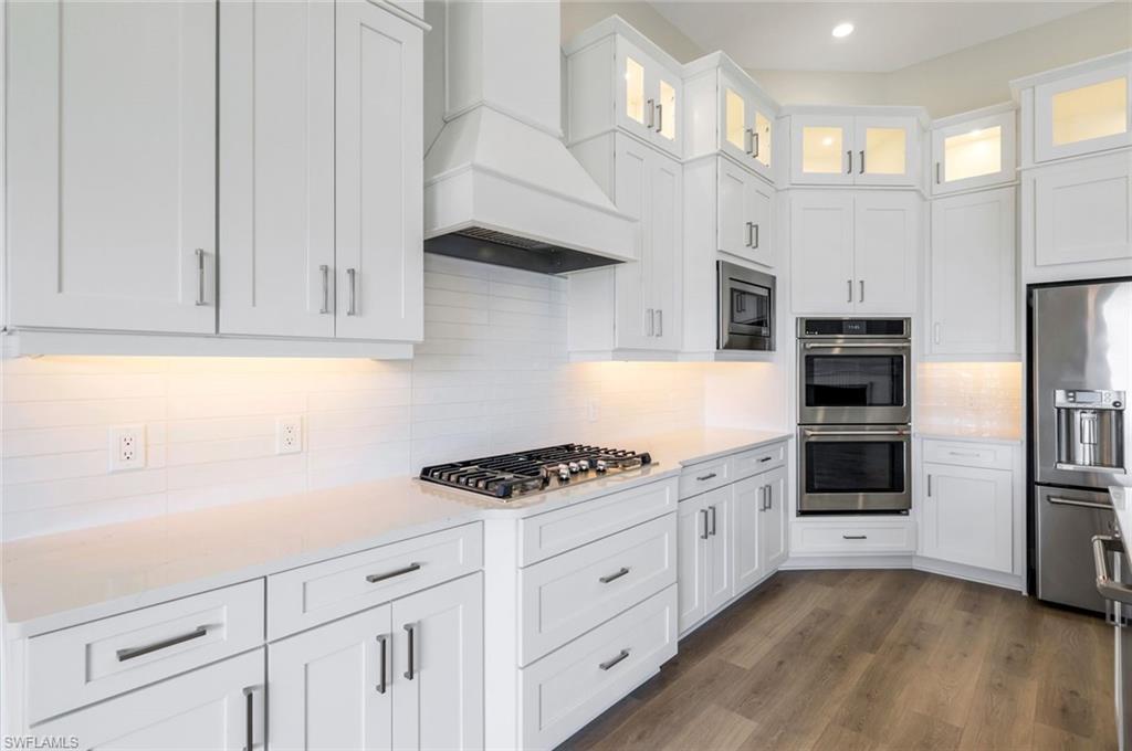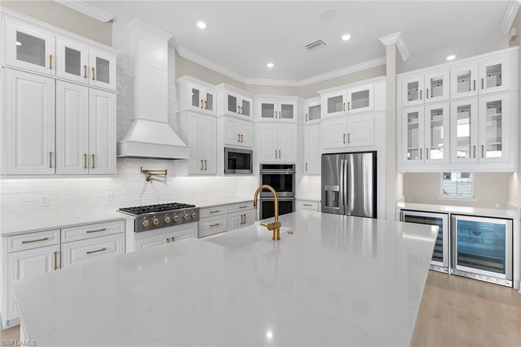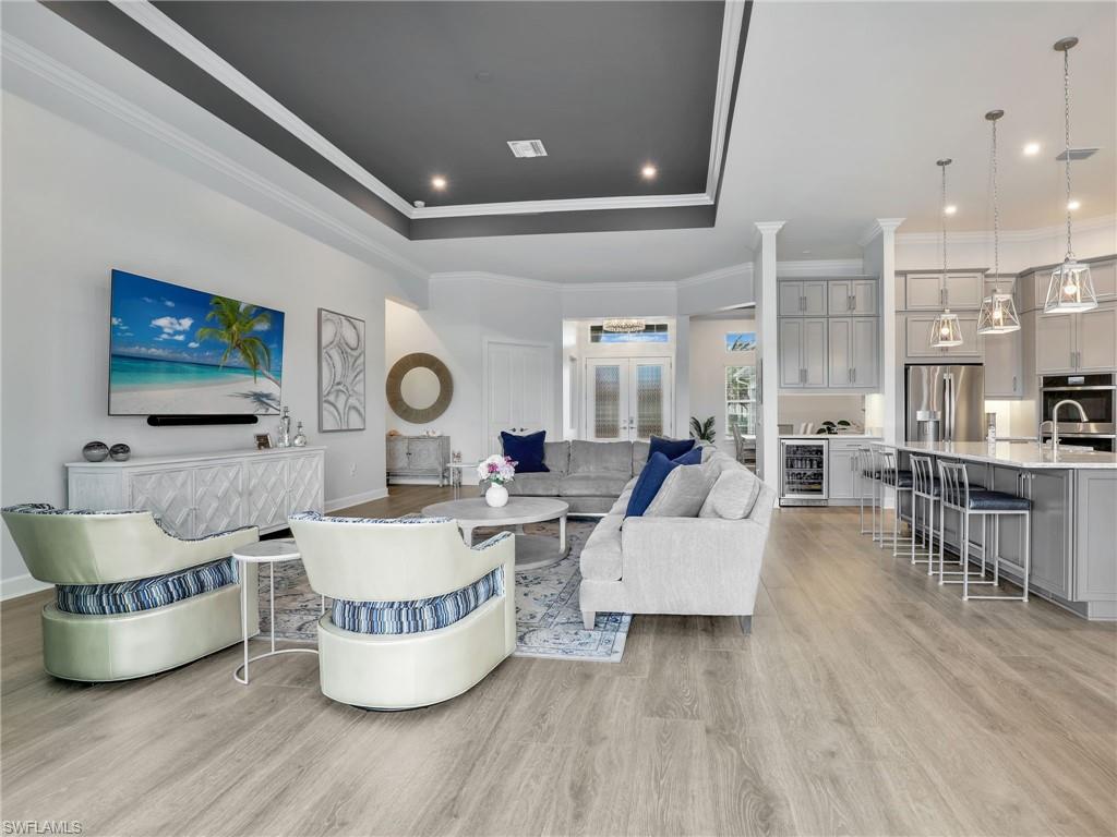 NEWLY BUILT LAKEFRONT POOL HOME WITH UNOBSTRUCTED VIEWS. This 4,500+ sq ft residence sits on a $400K premium lot with long lake views, complete privacy, and no future development across the water. The home impresses from the moment you arrive with an extended paver driveway, upgraded elevation, and hurricane-impact windows and doors. Inside, soaring tray ceilings, wood-beam accents, wainscoting, custom millwork, and wood-like tile floors create a warm, elegant feel. The open great room showcases panoramic lake views, a custom fireplace, built-in TV, and Sonos surround sound. The chef’s kitchen features quartz countertops, a massive island, gas cooktop, double ovens, dual wine coolers, soft-close cabinets, under-cabinet lighting, and a stylish glass-front bar. The first-floor owner’s suite is a private retreat with a bay window overlooking the lake, his/her walk-in closets with built-in cabinetry, and a spa-like bath with quartz counters, dual vanities, and a massive walk-in shower with three shower heads. Each guest bedroom includes an en-suite bath and walk-in closet. Upstairs, the bonus room offers a wet bar, lounge area, a full bath, and an additional guest suite with another full bath attached—perfect for entertaining or hosting guests. The outdoor living space is a true oasis with a gas-heated saltwater pool and spa, panoramic screens, extended lanai space, a full outdoor kitchen with grill, stovetop, sink, fridge, and a dedicated pool bath. Additional highlights include a 3-car epoxy garage, three AC units, tankless water heater, natural gas, generator-ready hookup, and no flood zone. Esplanade by the Islands offers resort-style living with a clubhouse, wine bar, restaurant, tiki bar, fitness center, dog park, and full social calendar—all minutes from Marco Island, Downtown Naples, and Gulf beaches. This home combines custom design, high-end finishes, and a one-of-a-kind lakefront lot—truly a rare find. MAKE AN OFFER TODAY.