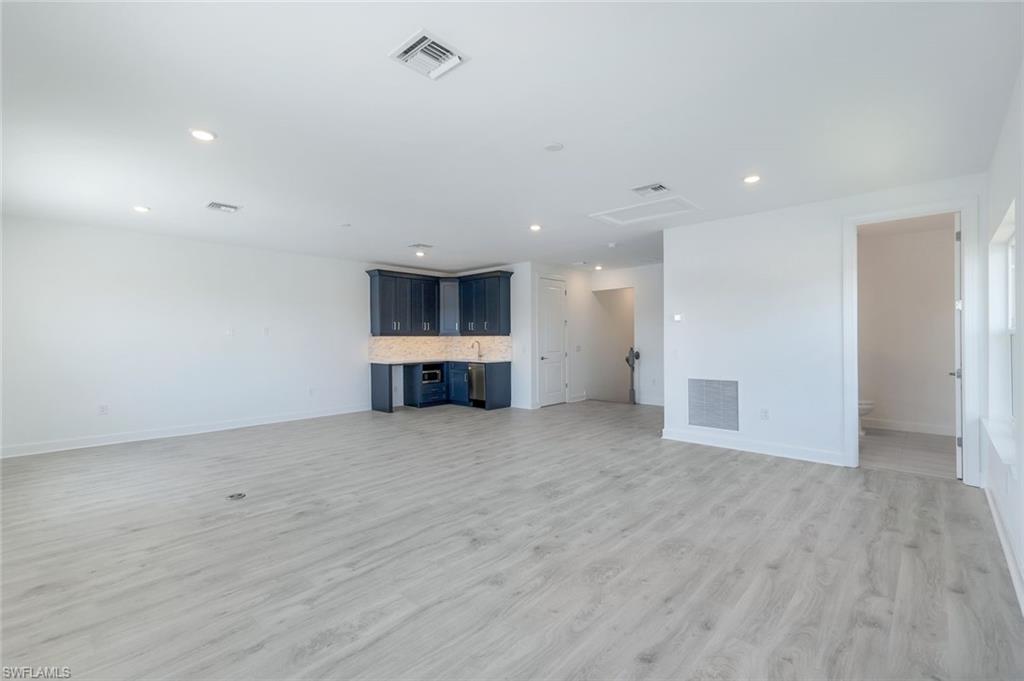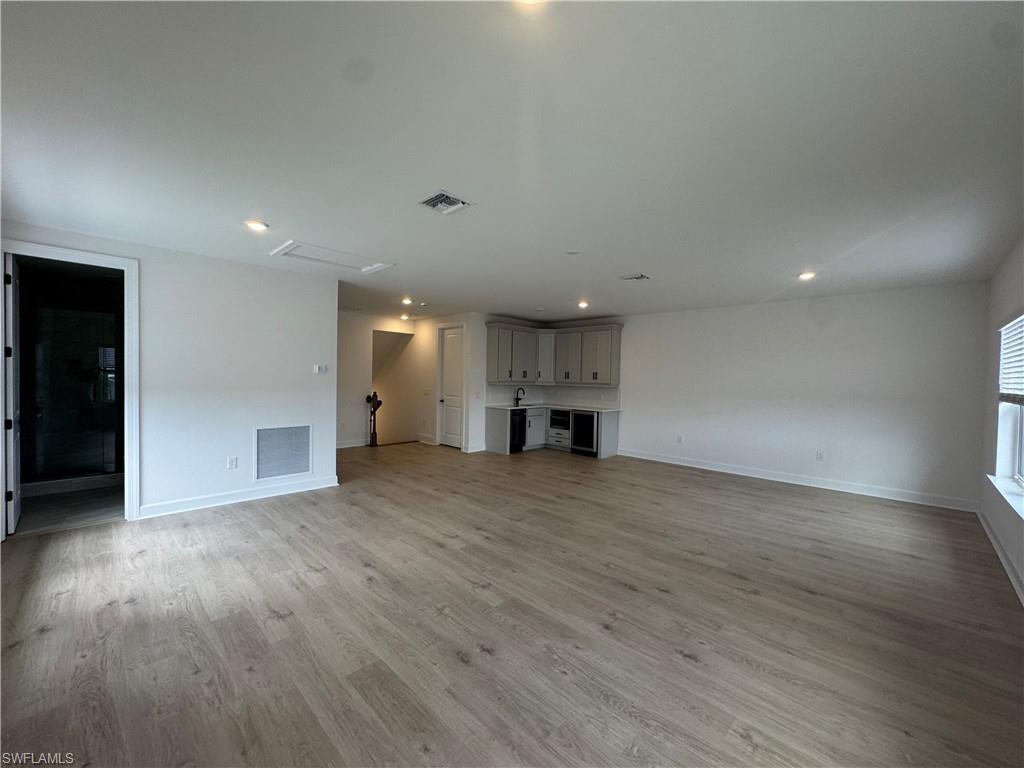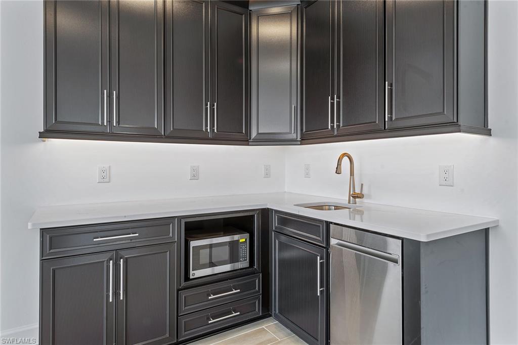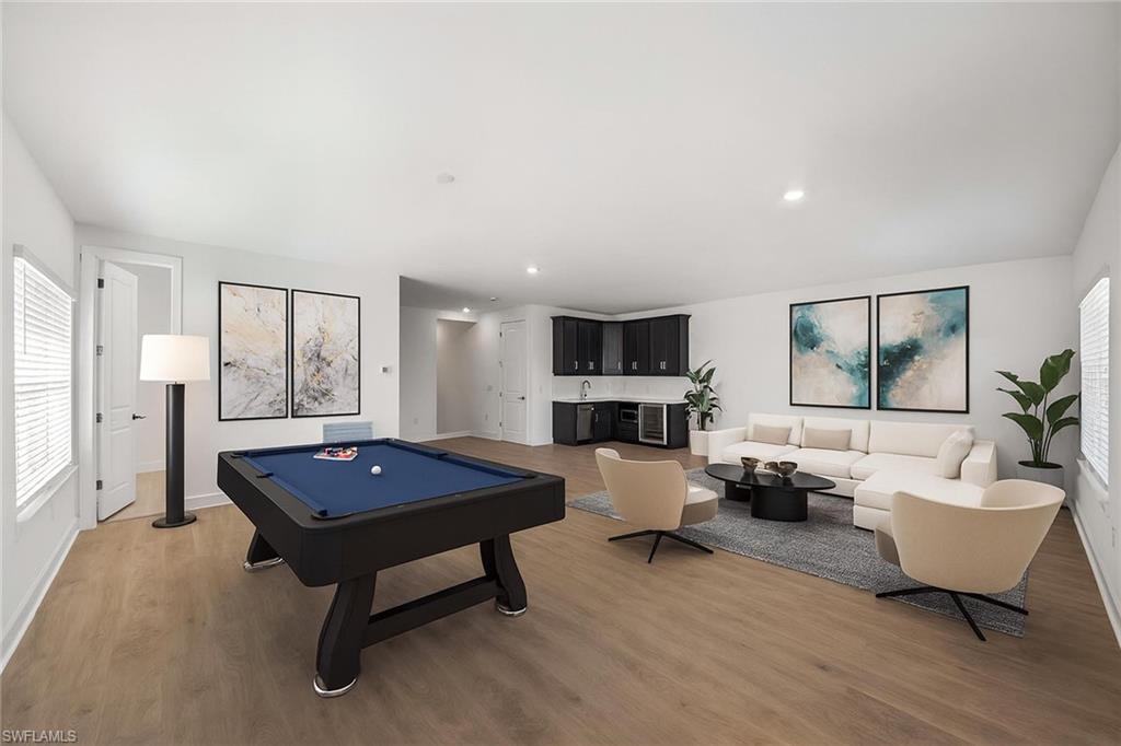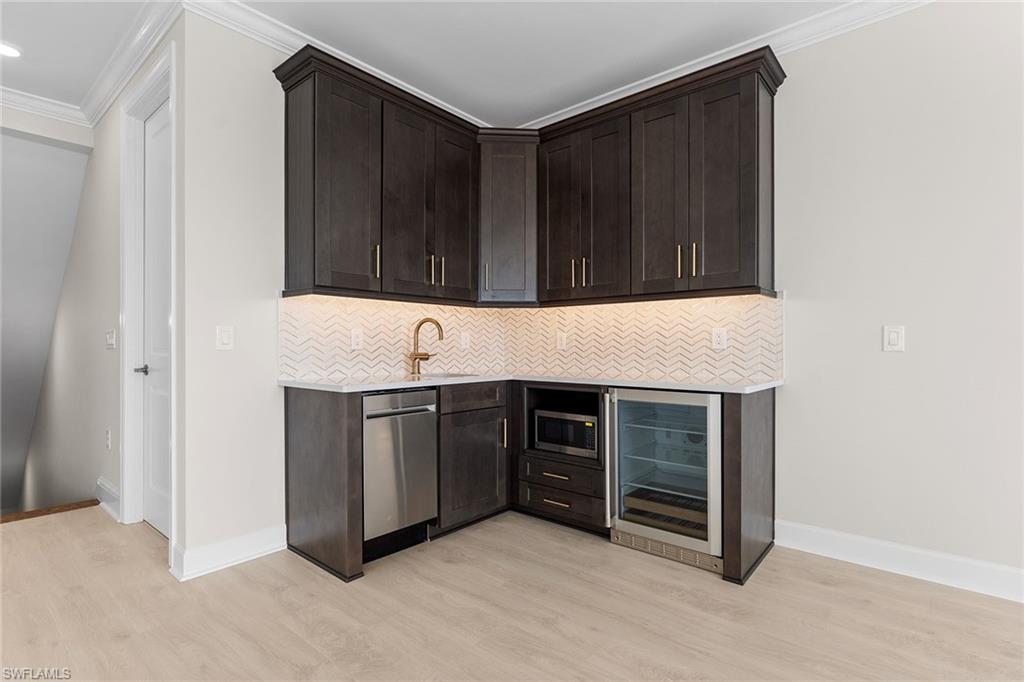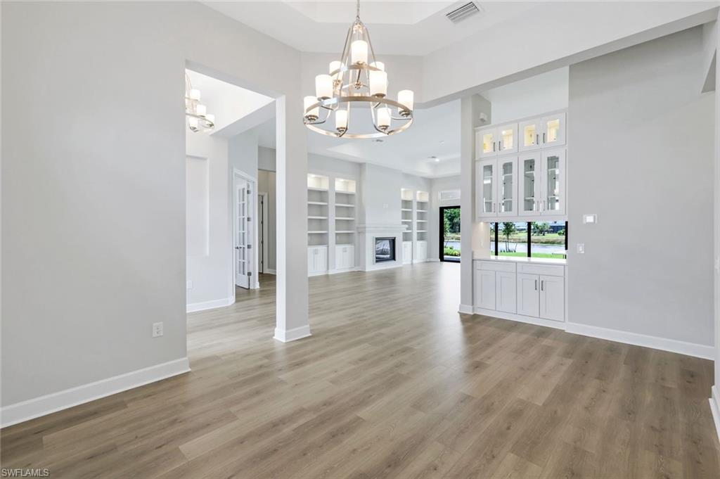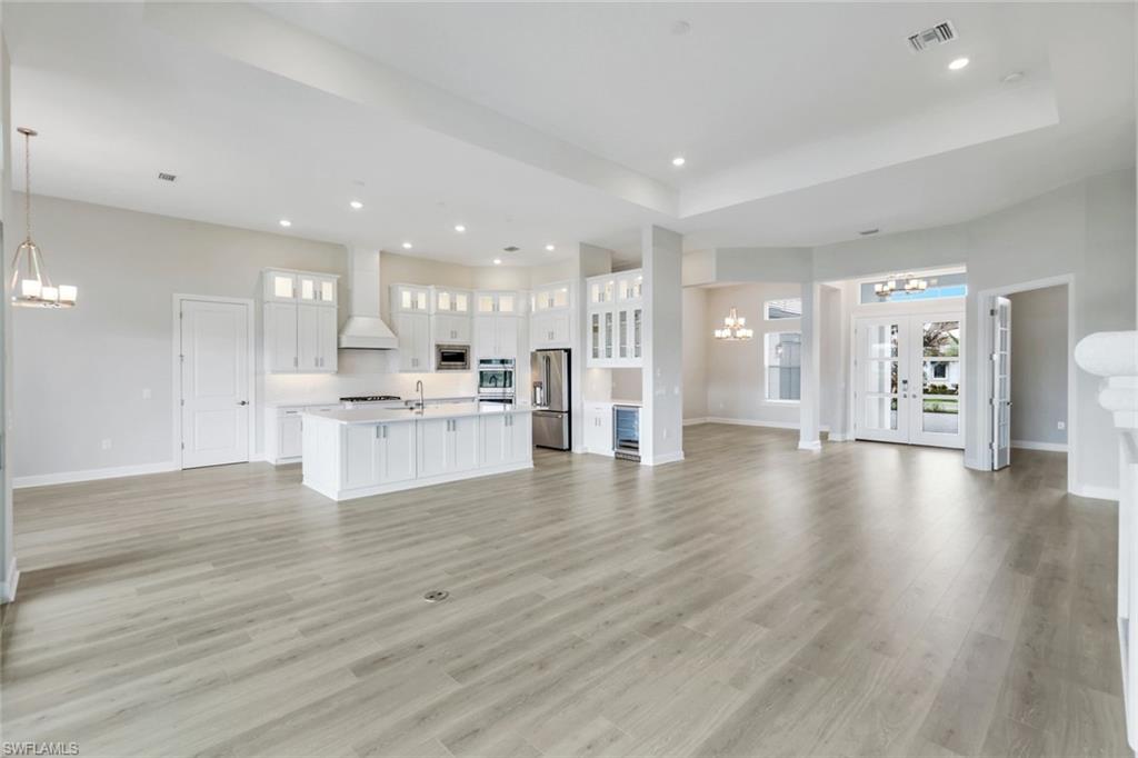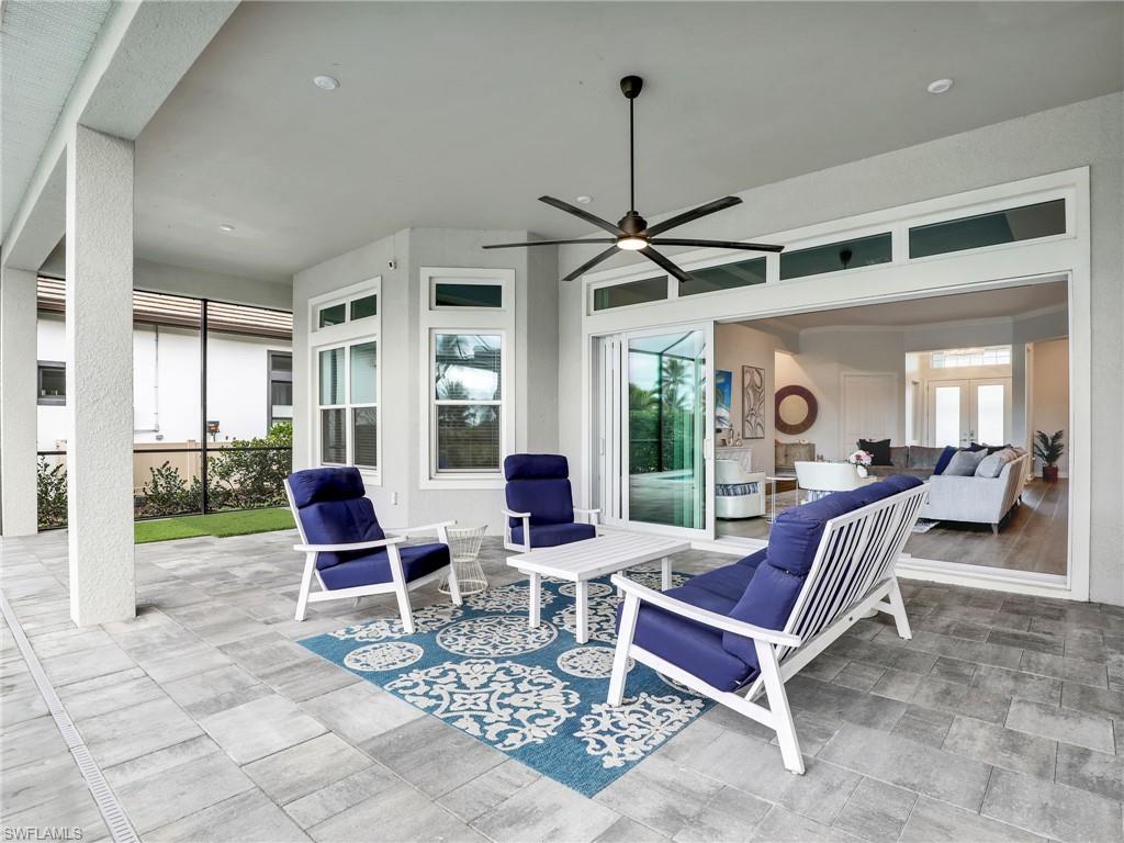 NEWLY BUILT LAKEFRONT POOL HOME WITH UNOBSTRUCTED VIEWS. This 4,500+ sq ft residence sits on a $400K premium lot with long lake views, complete privacy, and no future development across the water. The home impresses from the moment you arrive with an extended paver driveway, upgraded elevation, and hurricane-impact windows and doors. Inside, soaring tray ceilings, wood-beam accents, wainscoting, custom millwork, and wood-like tile floors create a warm, elegant feel. The open great room showcases panoramic lake views, a custom fireplace, built-in TV, and Sonos surround sound. The chef’s kitchen features quartz countertops, a massive island, gas cooktop, double ovens, dual wine coolers, soft-close cabinets, under-cabinet lighting, and a stylish glass-front bar. The first-floor owner’s suite is a private retreat with a bay window overlooking the lake, his/her walk-in closets with built-in cabinetry, and a spa-like bath with quartz counters, dual vanities, and a massive walk-in shower with three shower heads. Each guest bedroom includes an en-suite bath and walk-in closet. Upstairs, the bonus room offers a wet bar, lounge area, a full bath, and an additional guest suite with another full bath attached—perfect for entertaining or hosting guests. The outdoor living space is a true oasis with a gas-heated saltwater pool and spa, panoramic screens, extended lanai space, a full outdoor kitchen with grill, stovetop, sink, fridge, and a dedicated pool bath. Additional highlights include a 3-car epoxy garage, three AC units, tankless water heater, natural gas, generator-ready hookup, and no flood zone. Esplanade by the Islands offers resort-style living with a clubhouse, wine bar, restaurant, tiki bar, fitness center, dog park, and full social calendar—all minutes from Marco Island, Downtown Naples, and Gulf beaches. This home combines custom design, high-end finishes, and a one-of-a-kind lakefront lot—truly a rare find. MAKE AN OFFER TODAY.