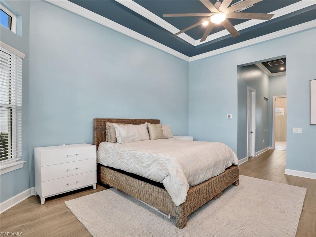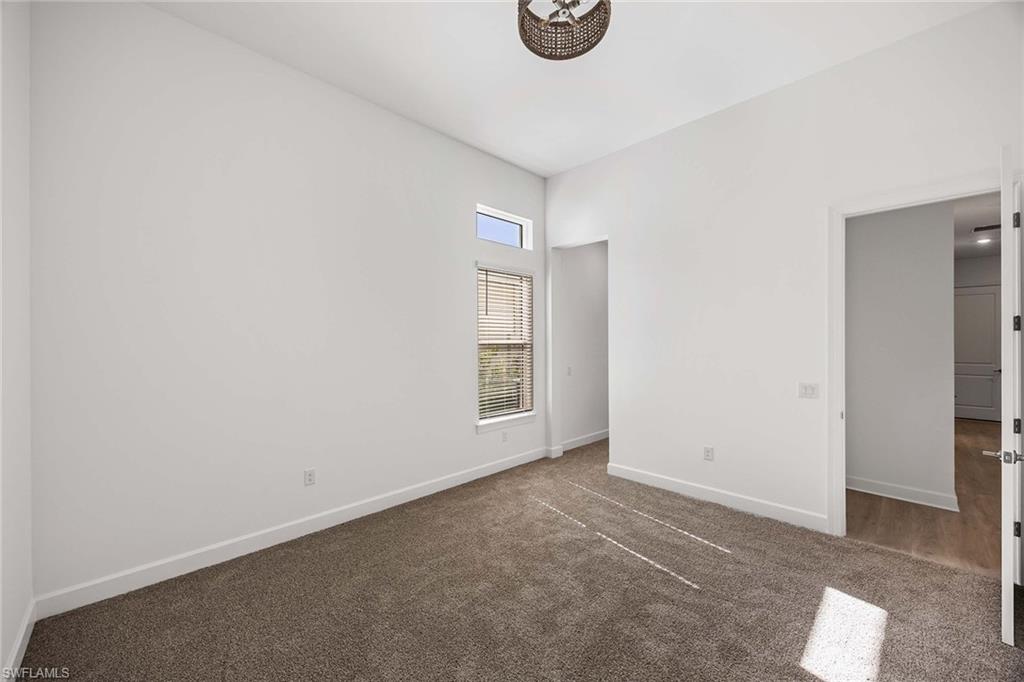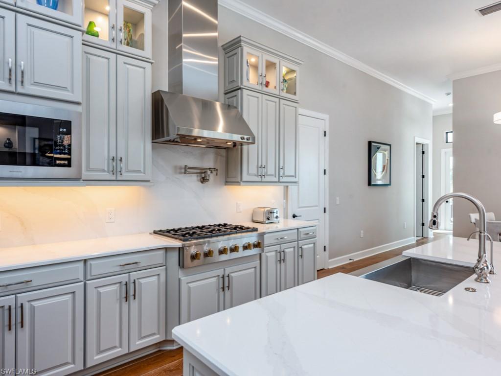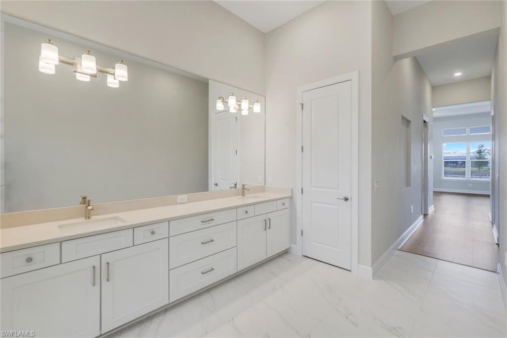 Showcasing a recent $25,000 custom upper-cabinet upgrade, this elegant Beacon with Loft, featuring a refined coastal elevation in timeless hues. Its striking curb appeal opens to a modern floor plan with porcelain tile flooring, 12-foot ceilings, and 8-foot solid-core doors. Impact glass ensures beauty, security, and tranquility. The spacious living area, prepped for a gas or electric fireplace, offers comfort and flexibility. The Chef’s Kitchen boasts shaker cabinetry, under-cabinet lighting, a farmhouse sink, large island, GE Monogram appliances, griddle, and pot filler, 24-inch upper cabinets with glass doors including custom molding will be installed soon. The primary suite features bay window views, two walk-in closets, and a spa-style bath with dual sinks and an oversized dual shower-head shower. Upstairs, the loft includes a private suite, generous living space, and wet bar—ideal for guests or versatile living. Sliding doors lead to a lanai with serene water and palm views, prepped for a custom pool and outdoor kitchen. Nestled in the prestigious Esplanade by The Islands on a prime water lot, the community’s luxurious amenities. Wellness Center, Bahama Bar & Grill, Dog Park, Massage Treatment Room, Fitness Center, Pickleball, Tennis, Bocce Ball, and Resort-Style Pool & Spa with a Culinary Center planned. Enjoy an exceptional upscale lifestyle. Close to dining, shopping, entertainment, downtown Naples, and Marco Island, this home offers refined living. Schedule your private showing today.