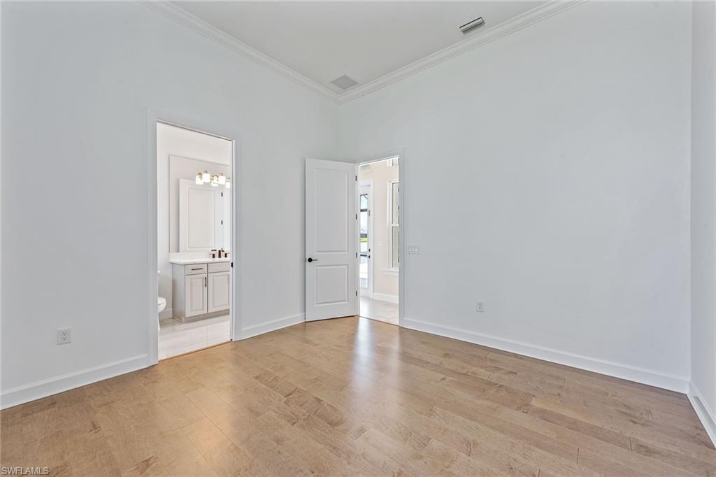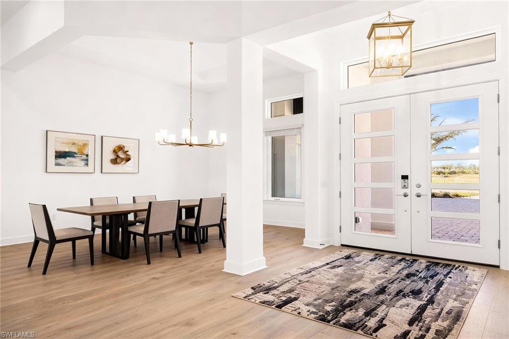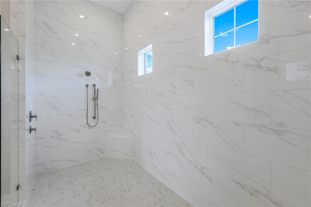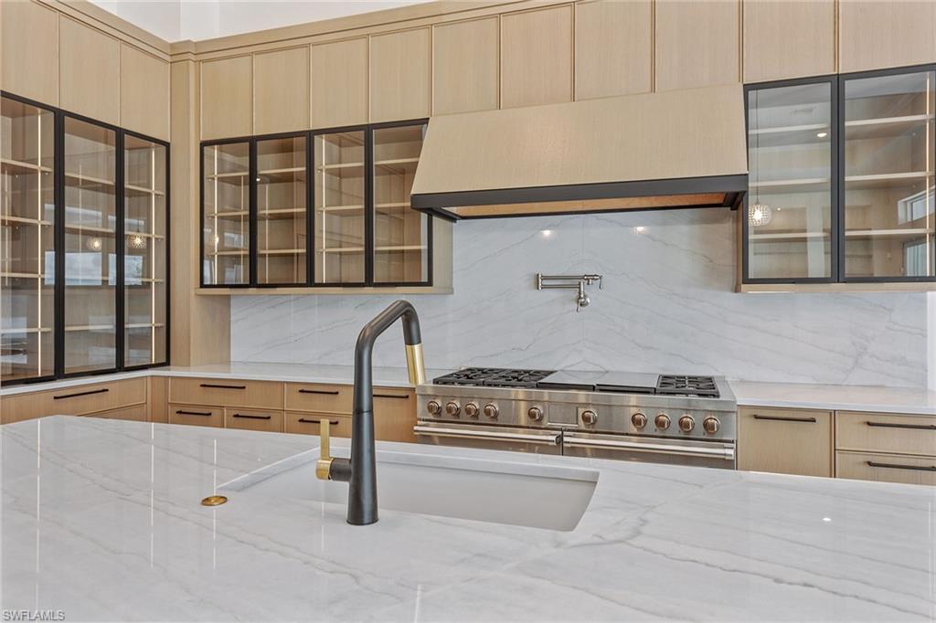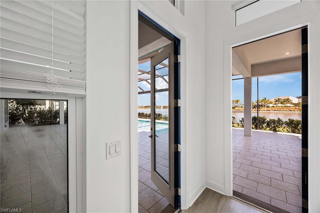 Built in 2024 and showcasing the finest in custom design, this lakefront home in Esplanade by the Islands offers luxurious living with wide, private water views and top-tier finishes throughout. Unlike a standard builder-grade home, every detail has been thoughtfully curated for elegance and function. The flexible floor plan includes four bedrooms, two flex rooms, a den, four and a half baths, and a three-car garage across two levels. The main living areas feature porcelain flooring, soaring ceilings, crown molding, designer lighting, and solid wood interior doors, while custom wood flooring enhances the bedrooms. Every bedroom features a custom-designed closet for optimal organization and luxury. A full security system, smart home wiring, and central vacuum provide modern convenience and peace of mind. The home is built for elegance and durability, featuring a tile roof, hurricane-impact windows and doors, and a wide brick paver driveway that enhances curb appeal and function. The gourmet kitchen impresses with Taj Mahal quartzite counters and backsplash, custom modern cabinetry with in-cabinet lighting, a large center island, and high-end appliances including a 60-inch Wolf dual fuel range with griddle and infrared charbroiler, pot filler, paneled 48-inch Sub-Zero refrigerator and wine cooler, and a paneled dishwasher. A spacious custom pantry adds extra storage, custom cabinetry, counter space and a built-in sink. The breakfast area with a picture corner window overlooks the lake and flows into a grand living room with fireplace, floating shelves and built-in cabinetry. Glass sliders with transom windows open to a serene outdoor space featuring a picture-frame screened lanai, custom Nassau-built pool and spa with waterfall feature, and an imported beveled Italian marble deck. The large covered outdoor living area includes recessed lighting, and all hookups are in place for a future outdoor kitchen, ideal for expanding your entertaining options. The owner’s suite offers lanai access, lake views, double-door entry, tray ceiling, two custom walk-in closets and a spa-like bath with soaking tub, walk-in shower with rain head and bench, dual vanities and full-width mirror. Two guest bedrooms on the main level each have en-suite baths and custom closets, one doubles as a pool bath. A flex room with lake views and lanai access provides space for a fifth bedroom or gym. Upstairs, a spacious media or game room with oak staircase entry, kitchenette with cabinetry, under-cabinet lighting and mini refrigerator, plus a full bath, is complemented by another guest suite with en-suite bath. The den, accessed via French doors, makes an ideal office. A full laundry room includes Samsung washer/dryer, utility sink, custom cabinetry and additional storage. Residents enjoy a resort lifestyle with a private clubhouse, Bahama bar, fitness center, spa, courts, trails and events, just minutes from beaches, golf, dining, and shopping in Naples and Marco Island.