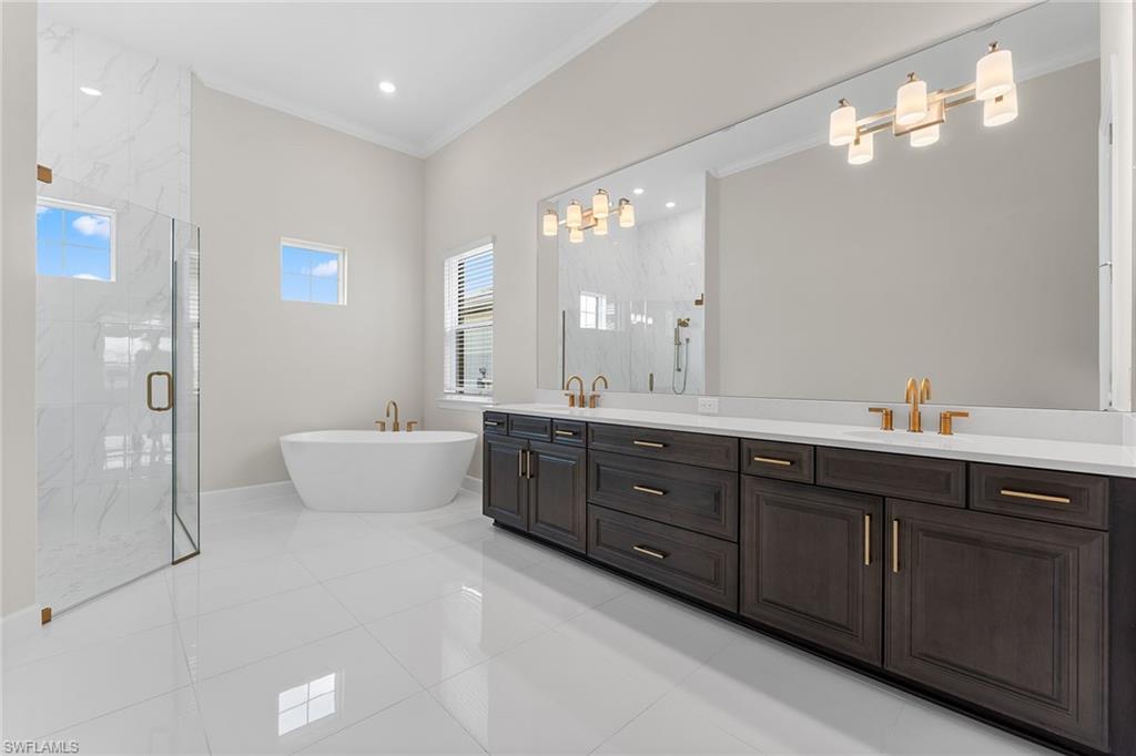 Luxury and spaciousness in an idyllic location awaits! This newly built home, with serene coastal finishes and calming neutral palette opens the mind to the possibilities of your dream home coming to life! Imagine your personal style imprinted on this gorgeous, extremely well designed home in the fresh new community of Esplanade by the Islands! Oversized primary suite with additional 3 en-suite bedrooms and baths plus den and powder room providing multiple areas to relax, unwind, entertain, and gather with friends and family. Spectacular expansive lake and preserve views off of the lanai where you can design your own version of heaven. Why settle for basic, standard selections, when you can design your own outdoor living room, custom pool, spa, outdoor, kitchen, fireplace and more! The possibilities are endless and could be every single thing you desire. The second floor of this beauty is perfect for an additional lounge, game room, ultra private guest apartment, or a family friendly bunk room and indoor movie theatre. Thoughtful and functional selections were made for you, the indestructible yet stylish light wood look LVP flooring throughout, upgraded quartz counters, custom indoor fireplace and built in shelving, upgraded tiling in all baths, and 3 car garage with flooring ready for your customization. This home is secured by impact glass and doors, and comes with all the new home warranties for peace of mind and ease of ownership. All this plus the wonderful amenities this community provides at extremely affordable costs make this opportunity one you should not miss! An active lifestyle is supported by the fabulous new Clubhouse featuring a state of the art fitness center, full service spa with salon services, cafe, resort pool, and wonderfully welcoming poolside restaurant and bar. Abundant pickleball and tennis courts, miles of sidewalks, plus a new culinary center under construction completes the perfect Naples destination you can call home! Minutes from the white sands of Marco Island, and world renowned downtown Naples, this is the one!