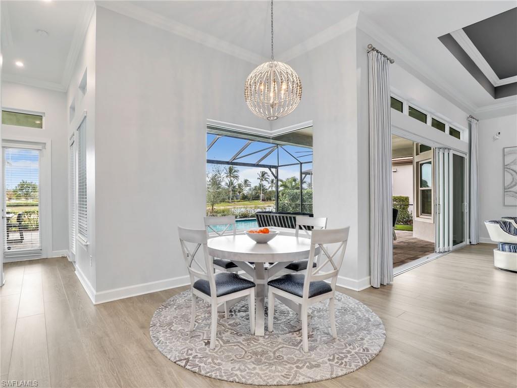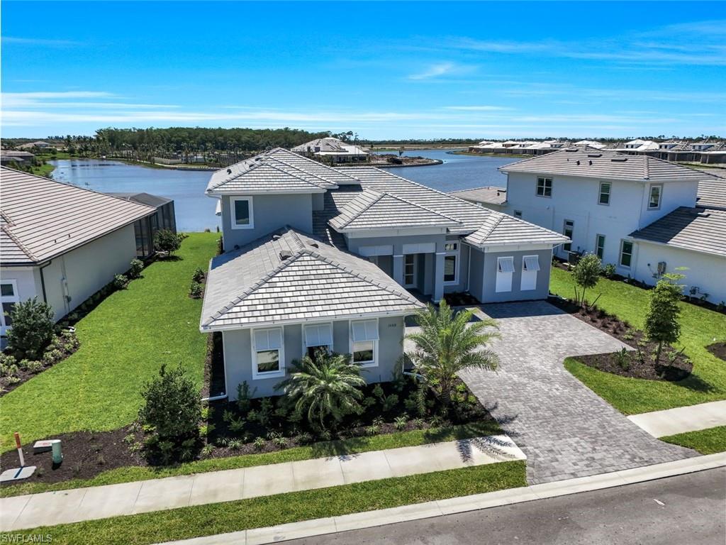 Waterfront with wide water views come with this luxurious four-bedroom, six-bath Beacon model home in the sought-after Esplanade by the Islands community. This new two-story home sits on a fantastic large water-view lot, that shows like a model with so much coastal allure! Complete with a custom-designed heated saltwater pool and spa featuring marble decking and a panoramic screened lanai. Additional bonus room upstairs complete with a wet bar for entertaining! Professionally decorated with high-end finishes including custom-made plantation shutters, upgraded kitchen cabinetry, built-in appliances and quartz countertops throughout! Featuring hurricane-impact windows, sliders and doors. Enjoy all the amenities at Esplanade by the Islands, which include a beautiful resort-style pool, restaurant, pickleball, tennis and fitness center. Just minutes to 5th Avenue's restaurants, shopping and beaches!