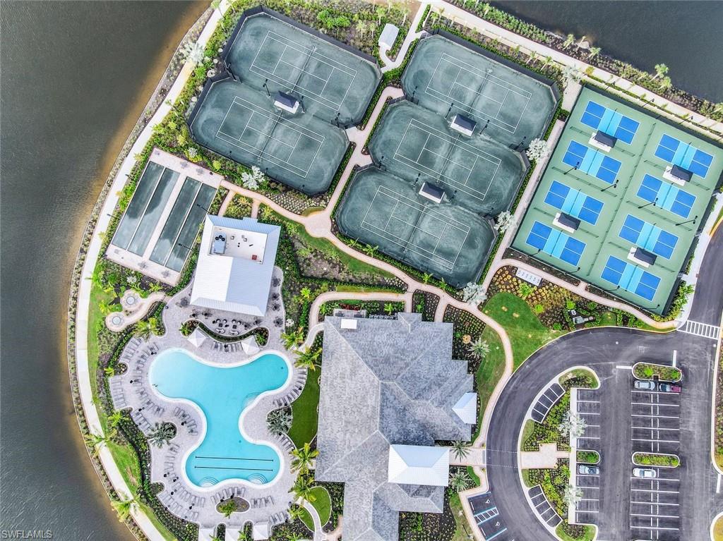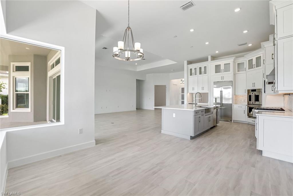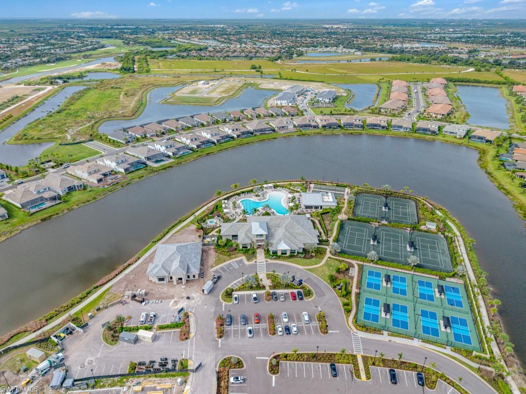Experience modern luxury and wide-water views from this newly built masterpiece in Esplanade by the Islands. Completed in 2022, this two-story residence was designed to capture lake vistas from nearly every room. Featuring four bedrooms plus a den, four full and two half baths, and a three-car garage, it perfectly blends sophistication, comfort, and functionality. The open concept living area boasts tray ceilings, designer lighting, and expansive glass sliders that open to a stunning lanai. The gourmet kitchen showcases quartz countertops, Monogram appliances, and a large island ideal for entertaining. The primary suite offers panoramic pool and lake views, dual closets, and a spa-inspired bath, while two guest suites offer en-suite baths, one with pool access. Upstairs, a spacious loft includes a sleek bar and additional guest suite. Outdoor living impresses with a panoramic screen enclosure, Italian marble lanai, a covered seating area, outdoor kitchen, and fireplace. Additional highlights include impact-resistant windows and doors, upgraded landscape lighting, and tankless water heating. Enjoy resort-style amenities: a pool and spa, fitness center, pickleball and tennis courts, salon and spa services, and poolside dining at The Bahama Bar.