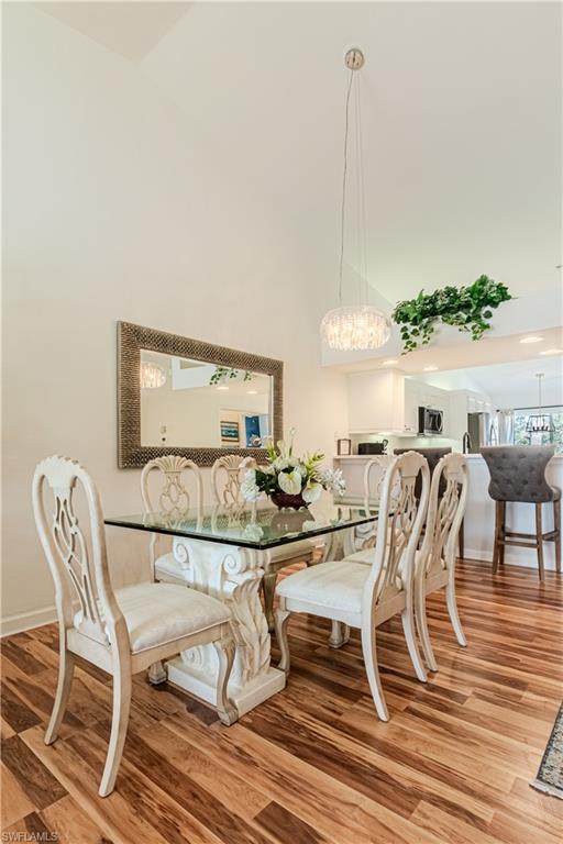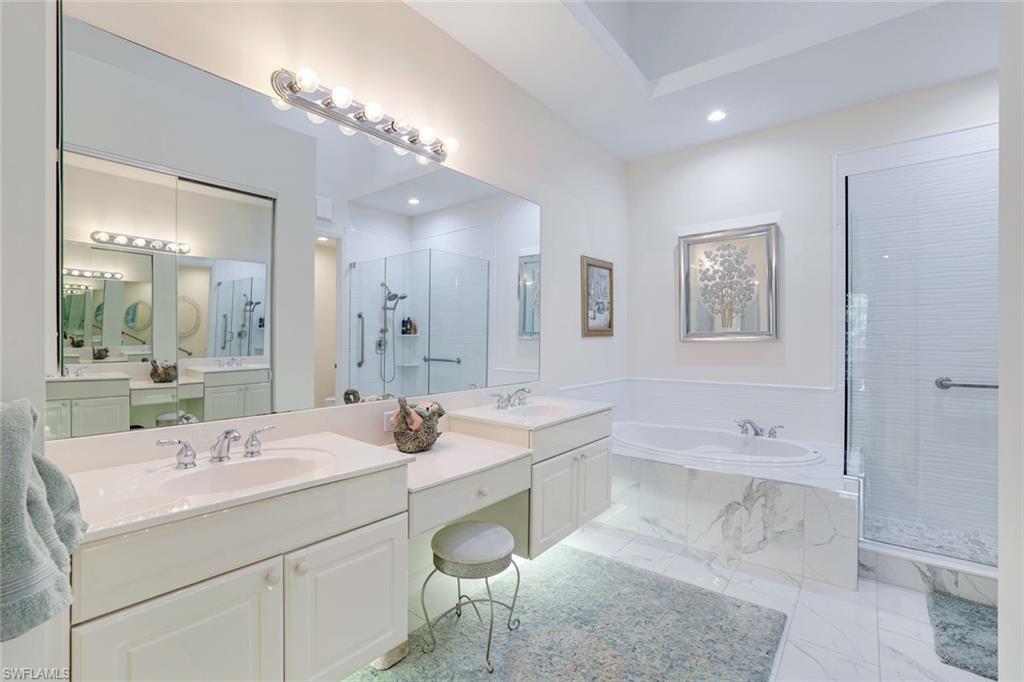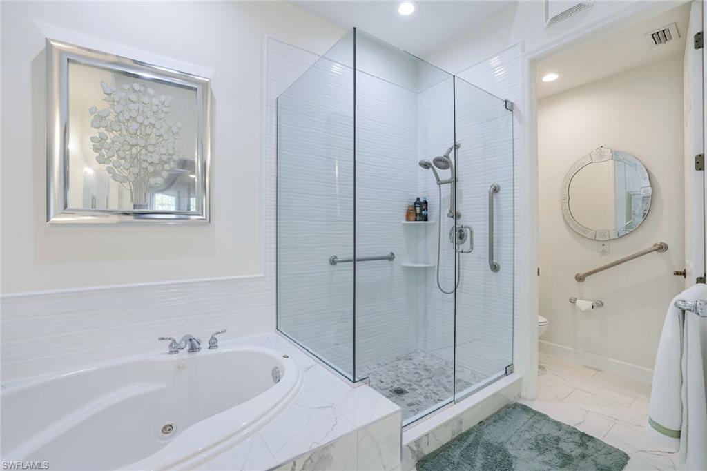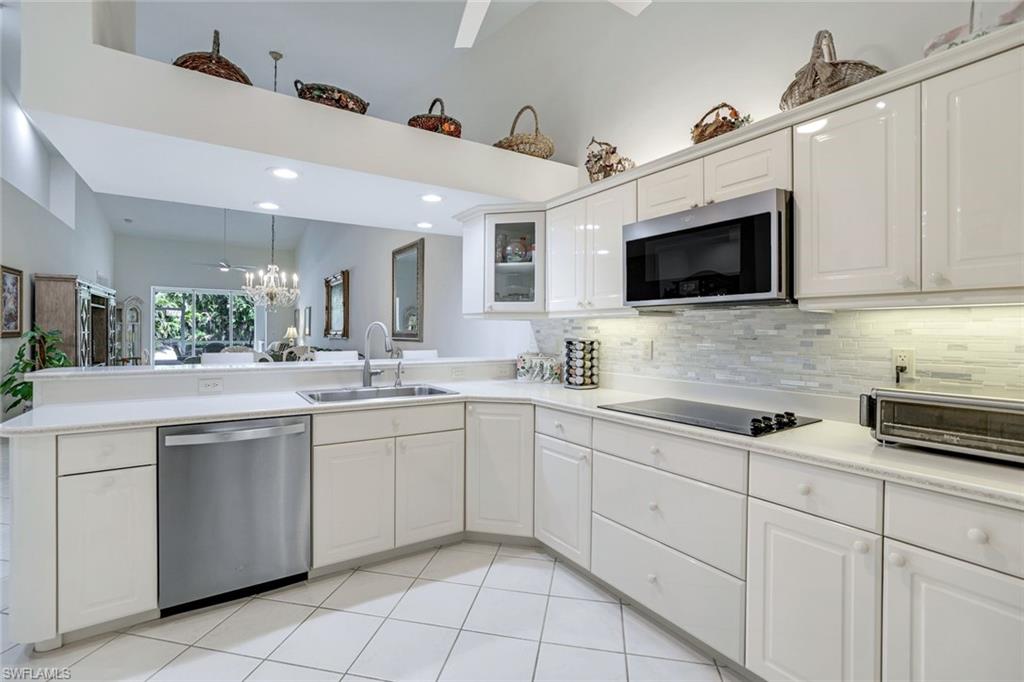 Discover this beautifully renovated & reimagined 3-bedroom, 2-bath condominium in Falling Waters featuring one of the largest saltwater pools in Naples. This modern end-unit residence includes a detached garage with custom cabinetry for additional storage and has been thoughtfully redesigned to balance functionality and elegance. The home showcases rich engineered wood flooring, crisp new baseboards, and detailed casement moldings that define each space with architectural precision. The reimagined kitchen offers expanded custom cabinetry, quartz waterfall countertops, pendant lighting, stunning new chandeliers, and GE Profile appliances, all designed for beauty and efficiency. Both bathrooms were completely redesigned with designer tile work, new toilets, dual quartz vanities, LED mirrors, and seamless glass shower doors. The primary suite is a true retreat, highlighted by ocean-inspired tile, a double-sink quartz vanity, new pocket doors, and sophisticated brushed-gold finishes. Natural light fills the living spaces, enhanced by new recessed lighting and direct-drive ceiling fans with integrated lights. Every closet has been upgraded with cedar shelving, and the entire interior has been freshly repainted. The lanai extends the home’s living space with upgraded lighting, an under-counter GE refrigerator, and a built-in BBQ, ready for relaxing or entertaining. Falling Waters offers an impressive array of amenities, including a sprawling saltwater lagoon-style pool surrounded by waterfalls and tropical landscaping, a beautifully updated clubhouse, tennis and bocce courts, putting green and a vibrant social calendar. The community’s lush setting and resort atmosphere create an unmatched Naples lifestyle experience. Falling Waters is ideally located just minutes from Downtown Naples, Tin City, and 5th Avenue South. Surrounded by new development and planned expansion, this area continues to grow in appeal and long-term value. Modern, functional, and ideally located—this is one of the finest residences in Falling Waters.