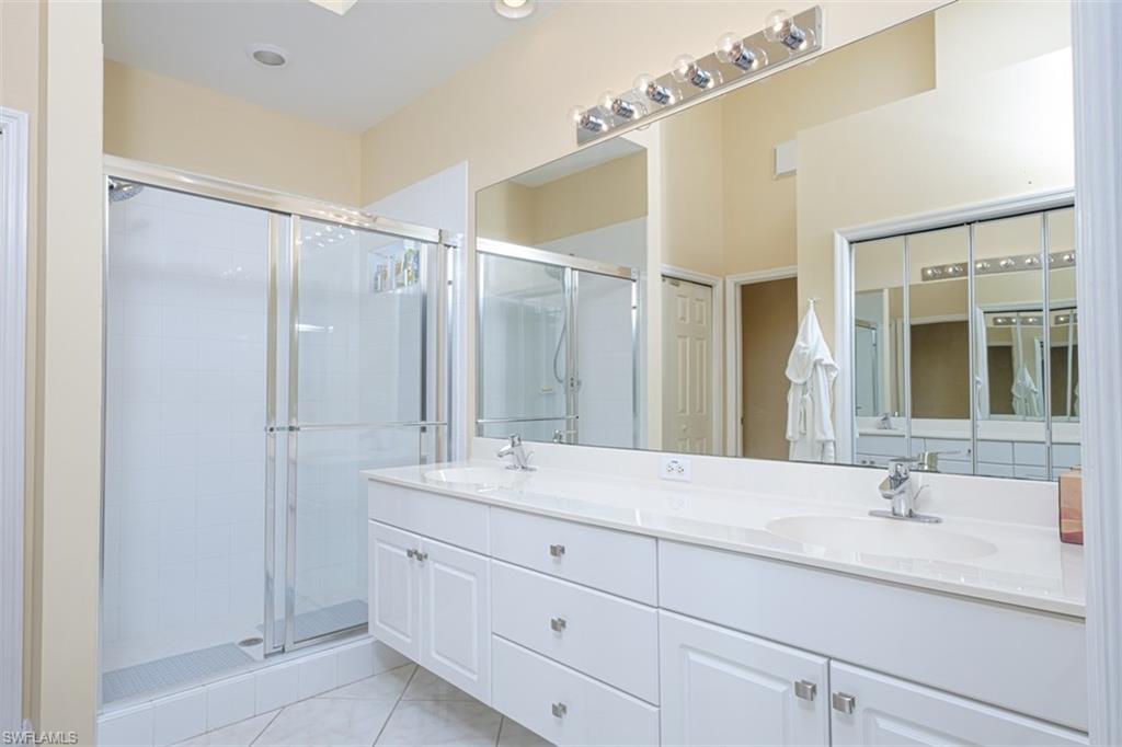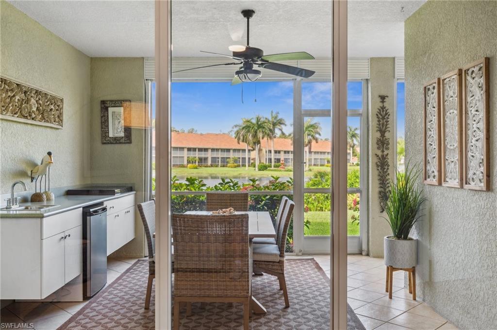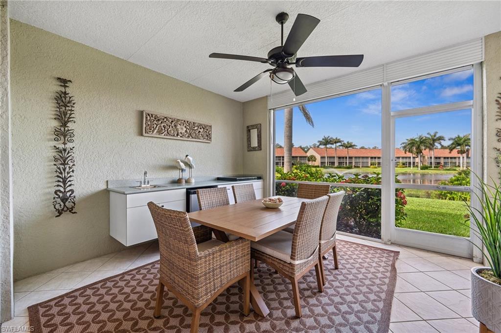 FIRST FLOOR Lakeview condo located on a Premium Cul De Sac. This provides a very private and quiet environment with no traffic. Discover serene living in this beautifully appointed 2-bedroom, 2 -bath split bedroom floor plan. Enjoy tranquil lake views from over 300 square feet of extended space thanks to a fully ENCLOSED LANAI with glass sliding doors-perfect for year-round relaxation or entertaining. The summer kitchen has a full set of base and overhead cabinets, sink and refrigerator to complete this great space. The kitchen features white raised panel cabinets, quartz counters and white appliances. The open-concept layout has tile throughout with abundant light. The master suite has a tray ceiling, plantation shutters, sliding doors leading to the lanai and the bathroom has a new rain glass shower enclosure with a new tile floor, dual sinks, walk in closet and linen closet. Detached one car, 12'x24' garage offers ample parking and storage. This condo offers the perfect blend of comfort, style and peaceful surroundings. Whether you are seeking a seasonal retreat or a full-time residence, this home delivers exceptional value and lifestyle. To add to the Falling Waters lifestyle are the amenities. The largest saltwater community pool in SW FL, 11,000 sf with tropical landscaping and connected to a clubhouse that provides many activities. Enjoy a round of tennis with friends on the clay tennis courts. The bocce courts offer a place to play a fun sport with new neighbors in many of the seasonal bocce leagues. Falling Waters's ideal location provides a 4.5-mile direct drive to the shops and fine dining offered on 5th Ave & Third Street in downtown Naples and the the beaches of the Gulf.
