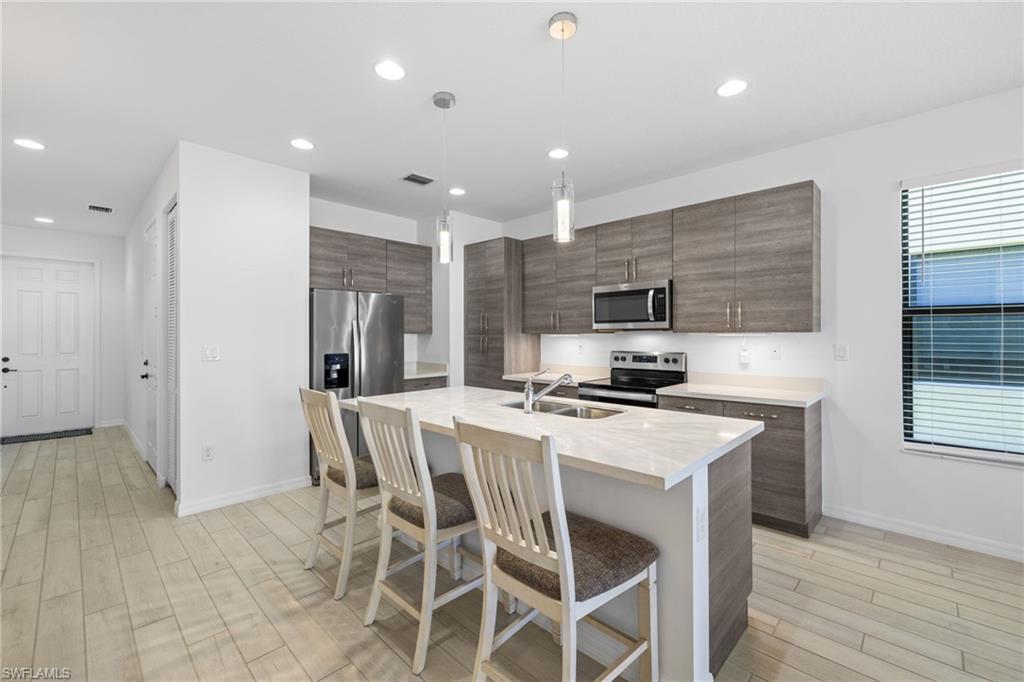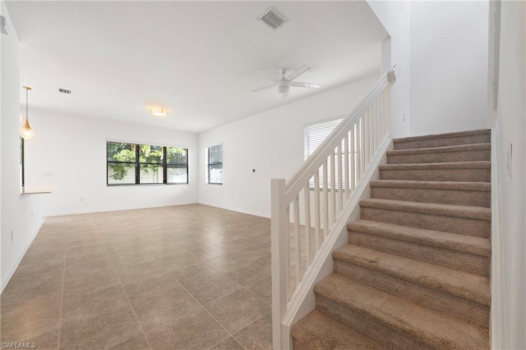 Priced to Sell in Fronterra! Welcome to this charming two-story single-family home in the desirable gated community of Fronterra. Offering over 1,700 sq. ft. of living space, this 3-bedroom, 2.5-bath residence features an open-concept floor plan designed for comfort and convenience. Step inside to find expansive ceiling heights, elegant 8-foot doors, and a spacious living and dining area. The kitchen is beautifully appointed with stainless steel appliances, quartz countertops, and custom wood cabinetry. A bonus storage closet near the garage adds practicality to the thoughtful layout. The home showcases freshly painted interior, newly installed tile floors throughout living room and kitchen, crafted wood plank flooring on second floor, whole house "Puronics" water filtration system, and a 2018 barrel tile roof. Enjoy outdoor living in the fully fenced backyard—perfect for relaxing or entertaining. A pavered driveway and attached one-car garage complete the picture. Fronterra is a pet-friendly community of only 145 residences, offering residents a sparkling pool, low HOA fees, and a quiet neighborhood feel. Conveniently located just minutes from I-75, downtown Naples, shopping, dining, and recreation. The Great Wolf Lodge indoor waterpark & Paradise Sports Complex—less than 10 minutes away—will bring even more excitement to the area. Whether you’re searching for a primary residence, vacation getaway, or investment opportunity with rental potential from day one, this home offers outstanding value and accessibility.
