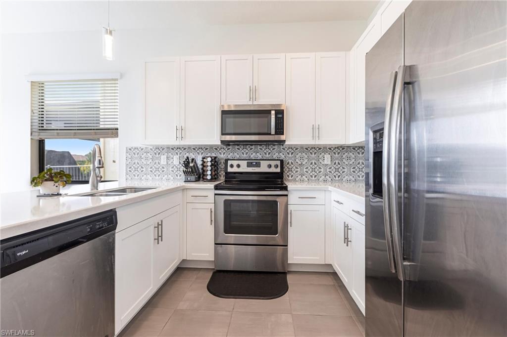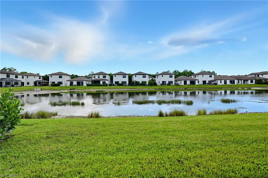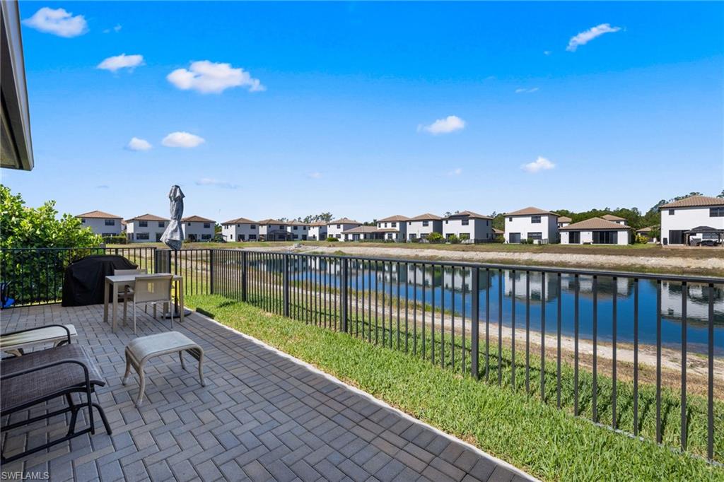 Welcome to your beautifully upgraded 3-bedroom, 2.5-bath water front single family home in sunny Naples, Florida—perfectly situated in a quiet, gated community with exceptionally low HOA fees. This freshly painted move-in-ready residence offers the best of Florida living, featuring a bright and airy open floor plan with soaring 10’ ceilings, and ceramic tile throughout the first floor. The kitchen is equipped with quartz countertops, stainless steel appliances, quiet-close cabinetry, and under-cabinet lighting, creating a modern and functional space for everyday living or entertaining. Enjoy peace of mind with impact glass windows, hurricane shutters, a durable Mediterranean style tile roof, and low insurance premiums with no flood zone requirements. Step outside to your private outdoor oasis—a fully fenced backyard with extended pavers, large side yard and relaxing views of the community pond, offering both privacy and beauty. Fronterra’s amenities include a resort-style pool with cabana, exterior irrigation, and lawn service—all covered by the incredibly low association fees. Don’t miss this exceptional opportunity!