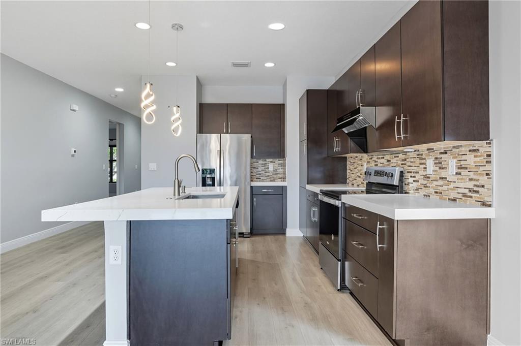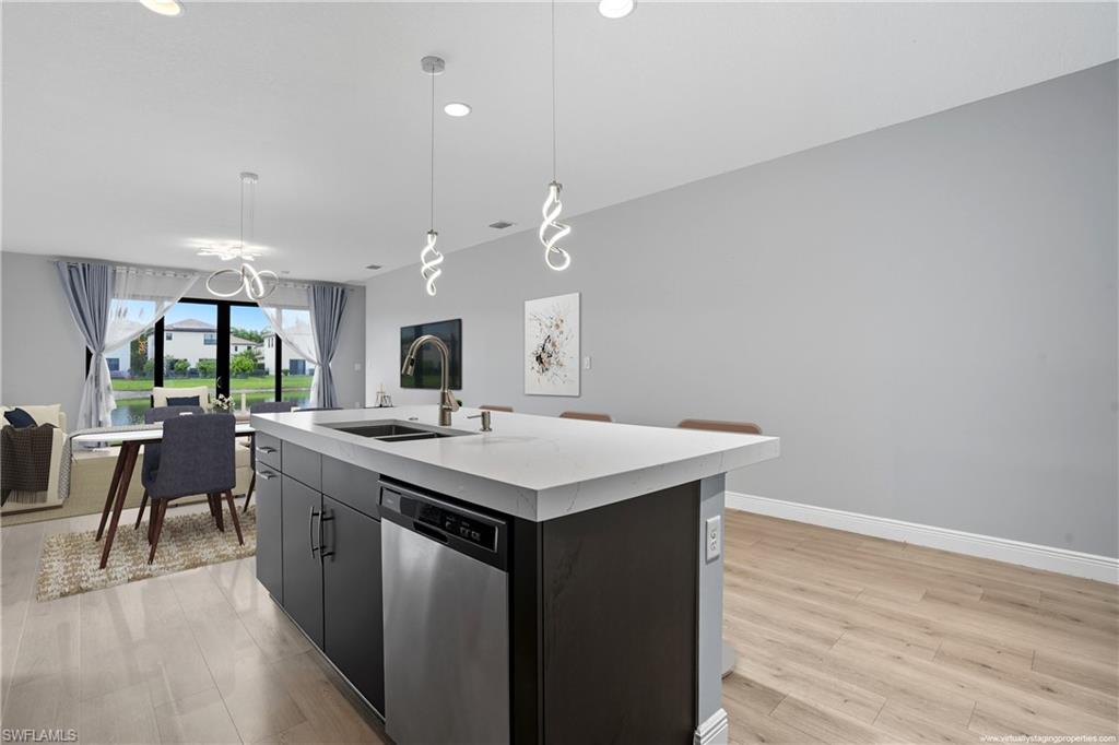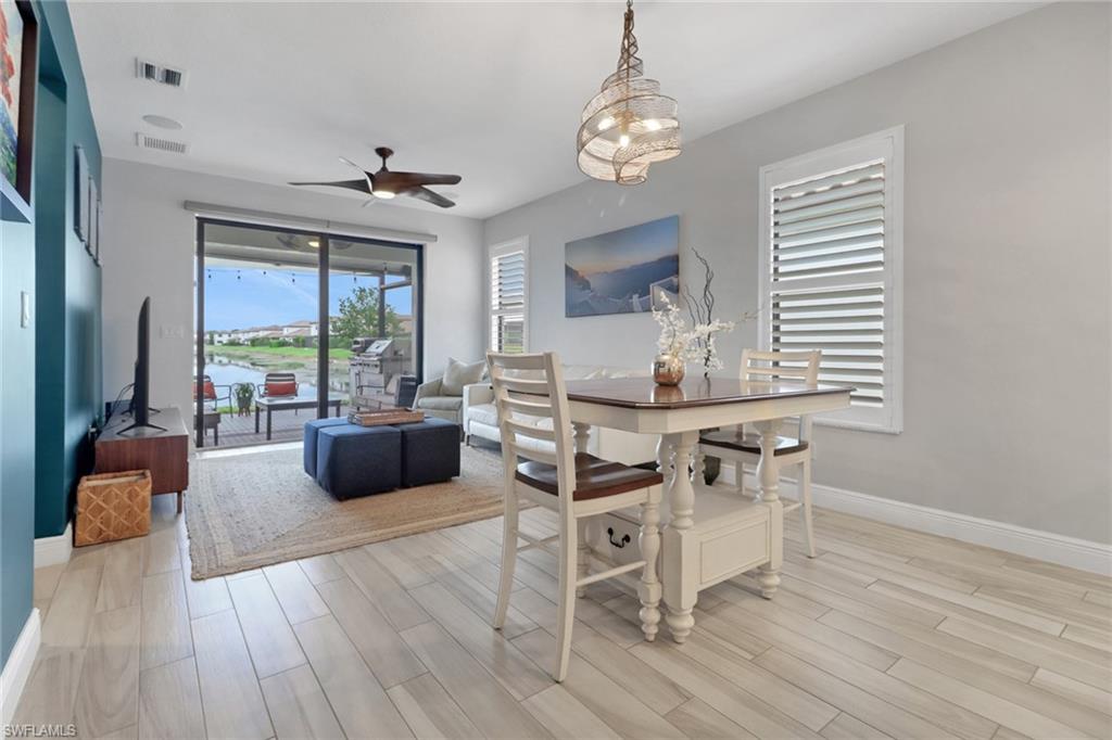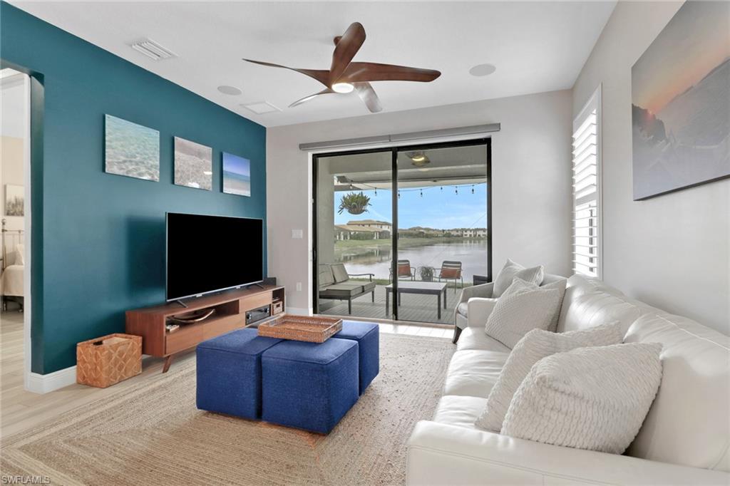 Welcome to Your Lakeview Dream Home in Fronterra! Experience modern comfort, thoughtful upgrades, and exceptional value in this beautifully maintained 2-bedroom plus den, 2-bath single-family home located in the highly desirable gated community of Fronterra. Offering newer construction, low HOA fees, and no flood insurance requirement, this move-in-ready home stands out as the best-priced property in the community. Step inside to an inviting open-concept layout with high ceilings, wood-look tile flooring throughout, and abundant natural light. The kitchen is a showstopper, featuring quartz countertops, oversized cabinetry, stainless steel appliances, and an upgraded reverse osmosis (RO) water system, paired with a whole-home water softener. Elegant plantation shutters throughout the home add a timeless, upscale touch. Other notable interior features include a tankless water heater and impact windows for energy efficiency and peace of mind. Outdoor living is equally impressive, with an extra-large screened-in lanai overlooking tranquil lake views, perfect for morning coffee or evening gatherings. A screened porch enclosure adds comfort and usability, while the outdoor kitchen and brand-new composite back deck (completed in 2025) make this space ideal for entertaining. The exterior of the home was freshly repainted in August 2025, enhancing its already strong curb appeal. Additional features include a tile roof, 1-car garage, and access to the resort-style community pool and cabana, all included in the super low monthly HOA fees (which also cover irrigation water and gated security). Ideally located just 1 mile from I-75, this home offers quick access to downtown Naples, world-class beaches, shopping, dining, and the nearby Paradise Coast Sports Complex. Combining style, location, and affordability, this upgraded home is a rare opportunity in one of Naples' most convenient communities. Don’t miss your chance to make it yours—schedule your private showing today!