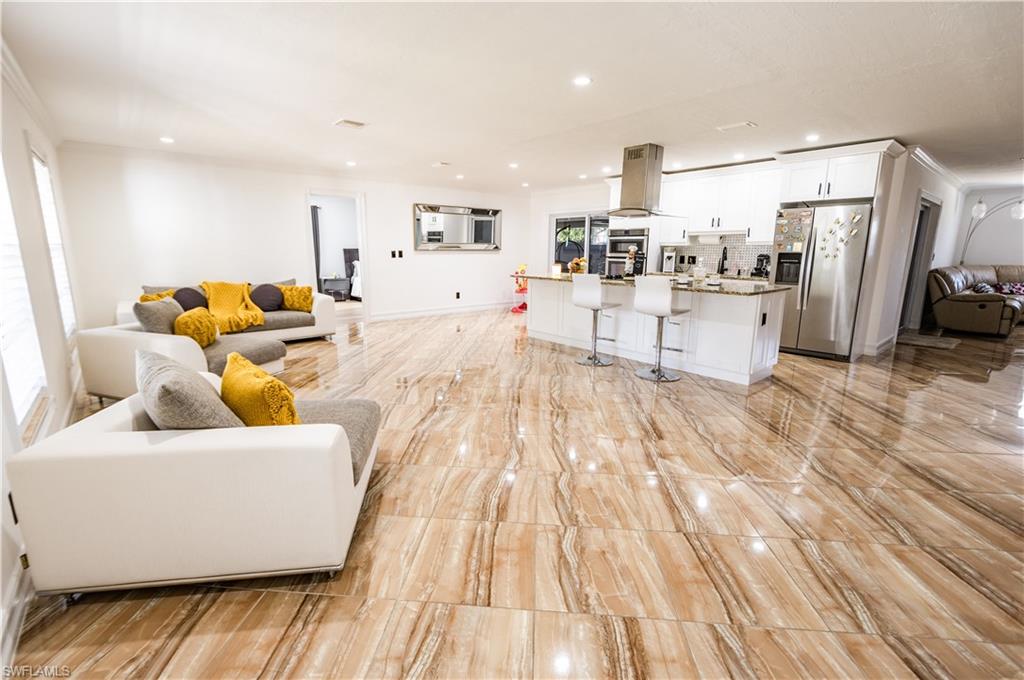 This Golden Gate City home is all about easy, comfortable living in one of Naples’ most convenient neighborhoods. From the moment you walk inside, the home feels open, bright, and welcoming. Two separate living areas give you flexibility for everyday life. One space is ideal for relaxing with a movie or hosting friends, while the second living area near the front of the home works perfectly as a lounge, reading room, or spot to greet guests. Large windows and soft natural light make both rooms feel calm and inviting. The kitchen is updated with white cabinetry, granite counters, and a sleek backsplash. It connects smoothly to the dining and living spaces, making it easy to entertain or keep conversations going while you cook. The split floor plan keeps the primary bedroom tucked away for privacy, with a clean, modern bath featuring a walk-in shower. Guest rooms are comfortable and well-placed for family or visitors. What sets this home apart is how it lives outdoors. The backyard offers real breathing room with mature tropical landscaping, hedges for privacy, and shaded paths for strolling or gardening. There’s a large open lawn, perfect for pets or play, along with a cozy sitting area ideal for morning coffee or evening drinks. The screened lanai adds even more usable space and lets you enjoy the Florida weather year-round. Whether you want to relax, grill, garden, or entertain, this yard gives you options. The home also features updated flooring, modern lighting, neutral paint tones, and plenty of natural light throughout. A two-car garage and wide driveway provide practical convenience, while the quiet street adds to the overall sense of ease. Living in Golden Gate City means you’re close to everything Naples offers. Shopping, dining, parks, and schools are all minutes away, and the beaches are an easy drive. It’s a friendly, established neighborhood where people still say hello and enjoy the relaxed Southwest Florida lifestyle. If you’re looking for a home that feels good the moment you walk in—and gives you an outdoor space that truly works for your life—this property delivers.