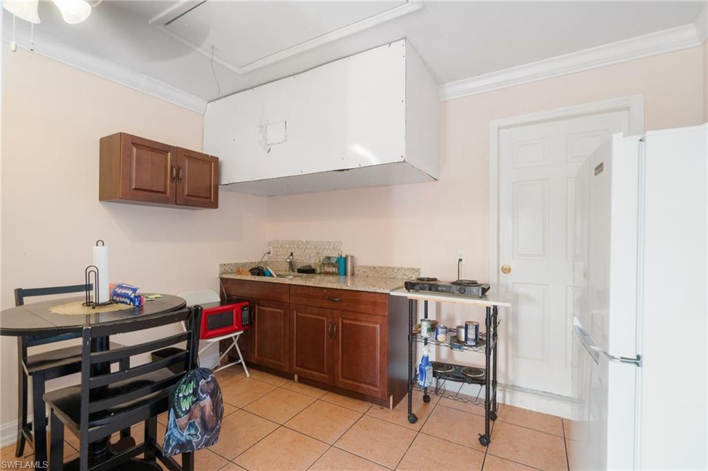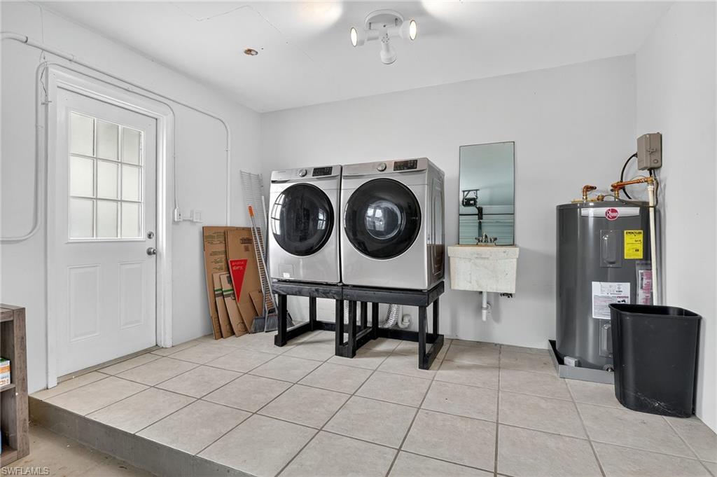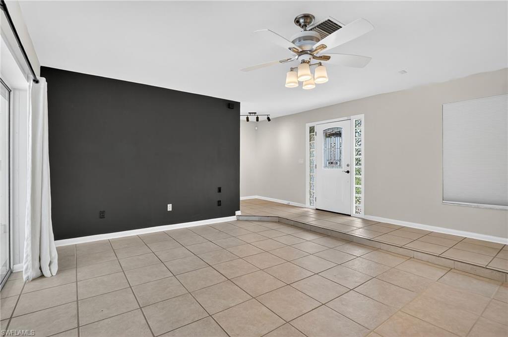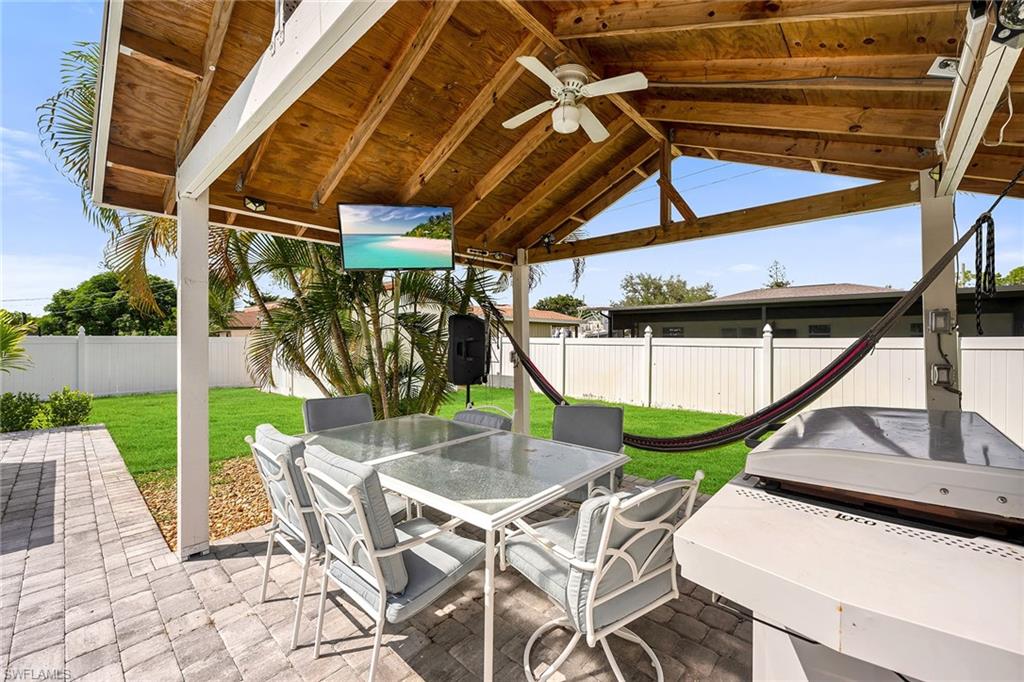 Experience the best of Naples living in this beautifully maintained single-family home offering southern exposure, a new heated saltwater pool with a waterfall feature (2023), and a spacious gazebo perfect for relaxing or entertaining. With no HOA fees or restrictions, this property provides exceptional freedom and convenience in a desirable Golden Gate City location close to schools, parks, shopping, dining, and just 15–20 minutes from downtown Naples and the beaches. The inviting layout features three bedrooms and two baths, with one of the guest rooms converted from a garage into a versatile suite complete with a kitchenette, sink, and overhead cabinetry, ideal for extended family or guests. Inside, diagonal tile flooring flows throughout the main living areas, creating a cohesive and easy-care design. The cozy living room features a window that fills the space with natural light and a modern ceiling fan for comfort. The kitchen is well-appointed with shaker-style cabinetry, sleek modern countertops, and appliances, including a range, microwave, dishwasher, and refrigerator with icemaker. An adjacent formal dining area with sliding glass doors opens to the back patio, providing effortless indoor-outdoor living. The owner’s suite is a peaceful retreat with a walk-in closet and an en-suite bath featuring a modern vanity and shower-tub combination. Two additional guest bedrooms share an updated bath with a walk-in shower, offering ample space and privacy for family or visitors. Go outside to your own private oasis. The fully fenced backyard showcases updated landscaping and a patio with brick paver flooring. The sparkling saltwater pool and gazebo create an inviting setting for outdoor enjoyment year-round. Additional updates include a newer roof (2020) and a washer and dryer. In Flood Zone X, this home offers lower insurance costs with no flood insurance required, making it an exceptional opportunity for comfort and peace of mind.