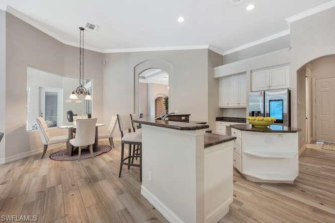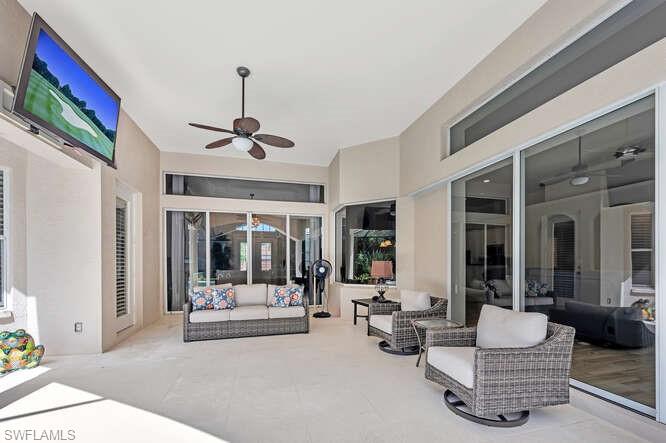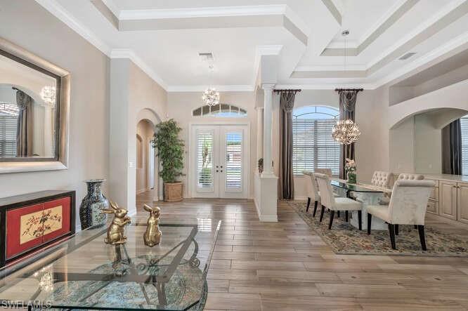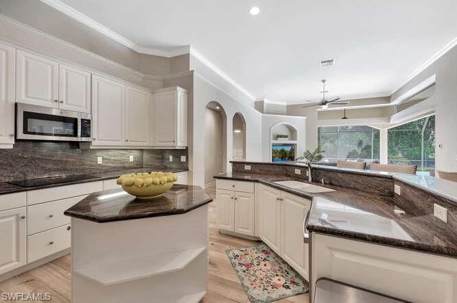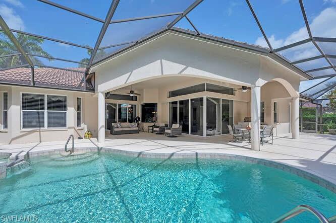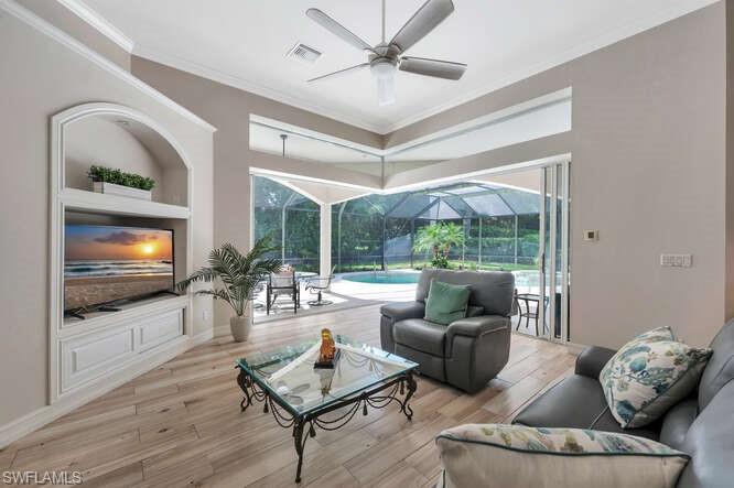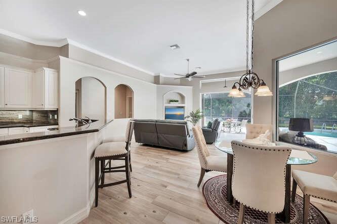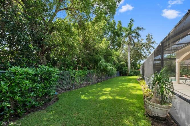 Unique & Rare opportunity .61 over half acre lot with golf & water views!! Take note most lots are only .30. Discover a harmonious blend of sophistication and serenity in this beautifully updated home. Be sure you click on Lifestyle video. The nearly 3,000 sq ft residence boasts breathtaking views of the lake and golf course. The inviting courtyard entrance makes a lasting first impression from the moment you arrive, setting the stage for the elegance that awaits inside. The grand entryway leads to the thoughtfully designed layout that is prime for entertaining and privacy, where every space exudes warmth and intimacy, from the formal living and dining rooms to the inviting family room with a cozy fireplace. A wet bar makes entertaining effortless, while the spacious kitchen inspires culinary creativity. Updates abound with wide-panel maple hardwood floors in every bedroom, custom porcelain and granite tile in the office, fully renovated bathrooms, a brand-new AC, and stylish recessed LED lighting with updated fixtures in the kitchen and baths. Three generously sized bedrooms, 2 1/2 baths and a versatile office space are strategically positioned for optimal privacy. The primary suite boasts a beautifully updated ensuite bath with a freestanding soaking tub, dual sinks, and a separate shower. Outdoor living is just as impressive. A sprawling screened lanai offers multiple lounging and dining areas, all overlooking the oversized pool. Recent updates—including brand-new tinted screening, a paved deck, and lush landscaping—enhance the ambiance of this serene retreat. Ideally located just minutes from Gulf beaches, shopping, and fine dining—with easy access to both US-41 and Livingston Rd. This exceptional home offers the perfect balance of tranquility and convenience. Schedule your private showing today!