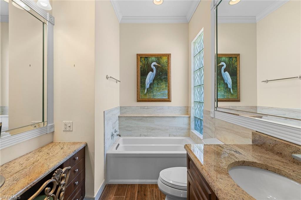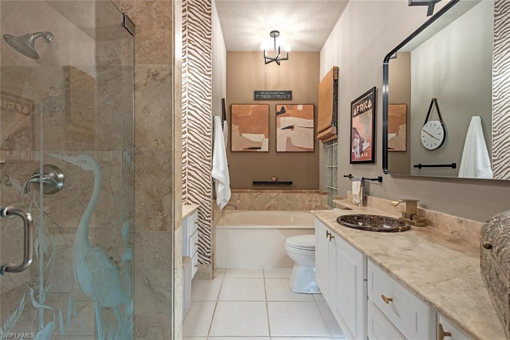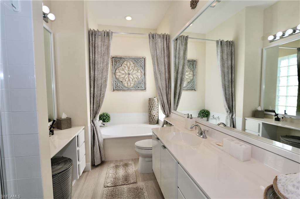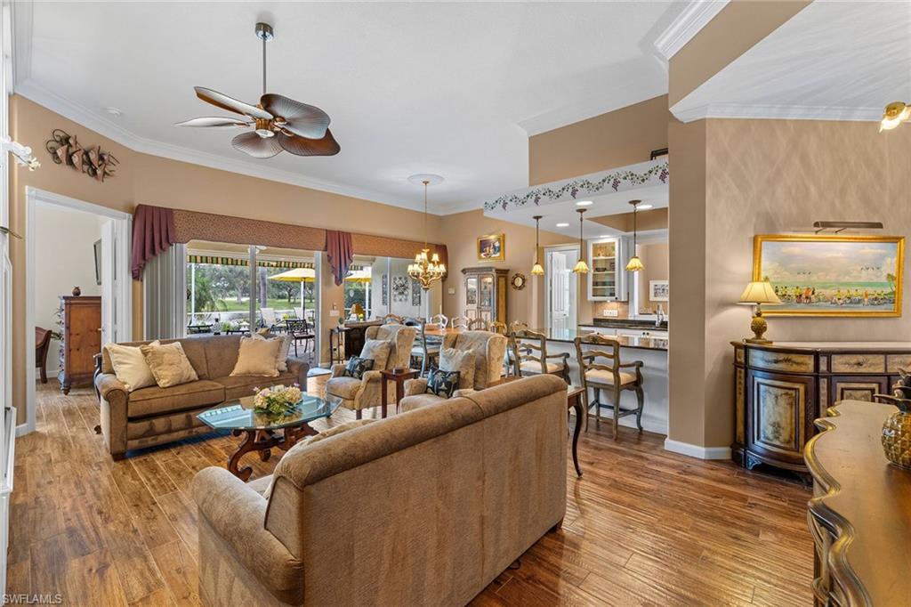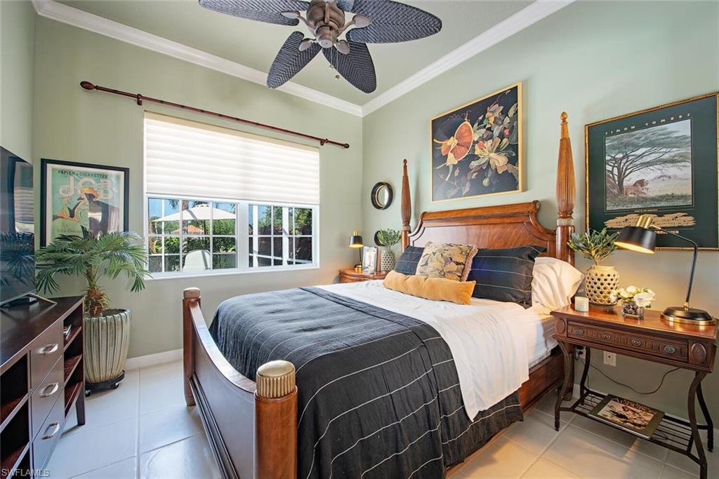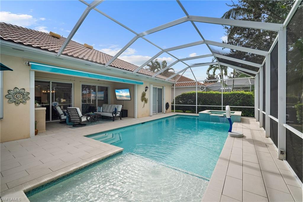In sought-after Island Walk community, this Carlyle model residence exemplifies Florida indoor-outdoor living. With Florida-style decor and Tommy Bahama-inspired finishes, the home features four bedrooms, three full baths and a two-car garage with an impact-resistant door and epoxy flooring. Interior features include a white kitchen with breakfast bar seating, a formal dining room and a spacious family room with multiple windows and a fireplace. Interior features include a white kitchen with breakfast bar seating, a formal dining room and a spacious family room with multiple windows and a fireplace. Flooring includes tile in main areas and engineered hardwood in select spaces. The primary suite includes dual sinks and toilets, a soaking tub, a walk-in shower and direct access to the lanai. Imagine waking to a pool and lake view, this screened outdoor retreat features a custom solar-heated pool, hot tub spa, and dedicated living and dining areas. Two mechanical awnings provide added shade and comfort on the patio, making the space ideal for sunning, swimming or entertaining. A covered front patio adds even more versatility. Additional enhancements include a 2018 roof replacement, a 2022 air-conditioning system and hurricane shutters for added peace of mind. Island Walk offers shaded streets, mature trees and scenic lakes in a tranquil setting. Residents enjoy a gated town center with a gas station, fitness center and resort-style pool. Athletic amenities include tennis, pickleball and pop tennis courts with grandstand seating, league play and lighted evening access. Close to shopping and dining and within 15 miles of Naples’ world-renowned beaches, this home offers a blend of privacy, resort-style amenities and lifestyle value in one of Naples premier lakefront communities.