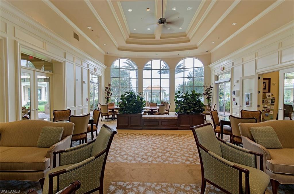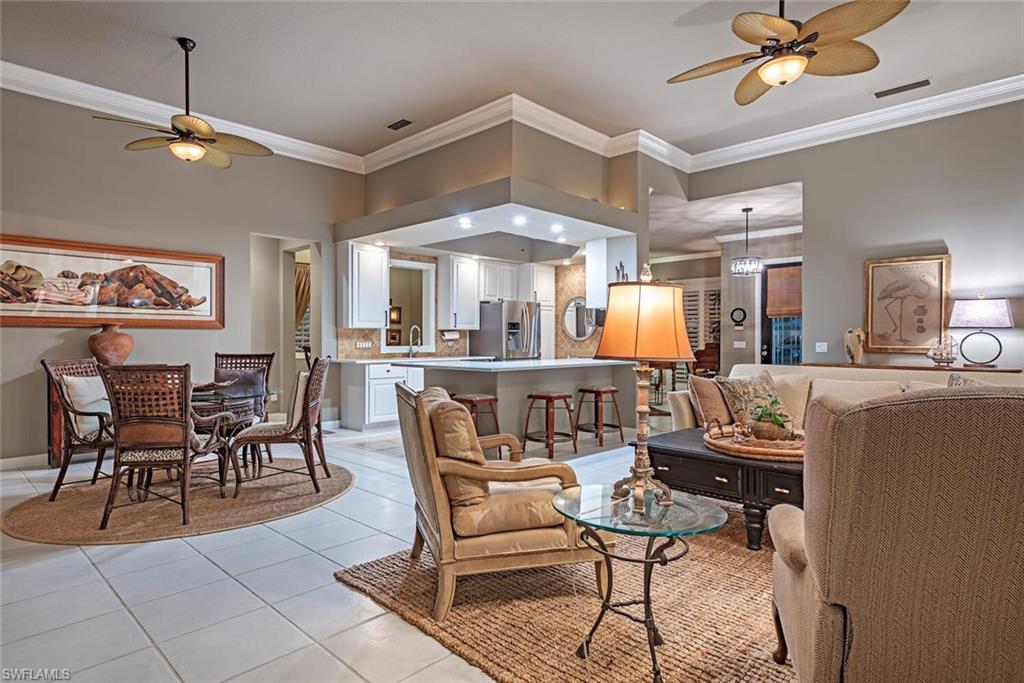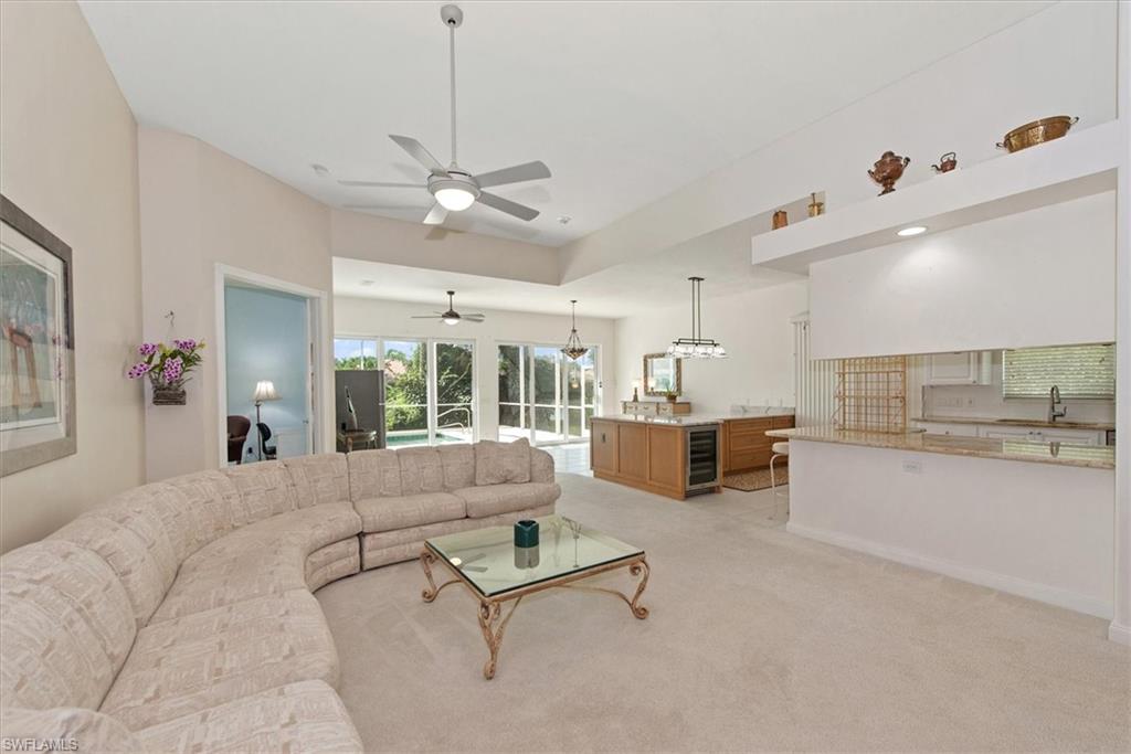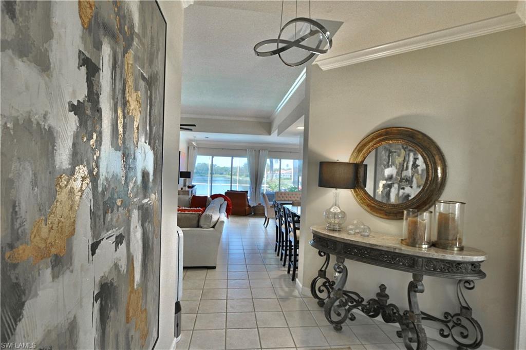 This gracious Island Walk home is the extended Carlyle model, boasting 2687 sq ft of living space under air. Walk in the front door and be blown away by the expansive feel of the 12 ft ceilings with a view through the house to the pool and lake beyond. The home has an open concept kitchen/family room with new cabinetry and counter tops, and contemporary built ins; large format polished travertine tile flooring throughout; custom window treatments; custom salt water pool and lanai with a lovely southern exposure lake view; meticulously maintained landscaping; spacious front porch, freshly painted exterior and a brand new roof. Together with its 4 bedrooms, 3 upgraded baths, as well as formal living and dining rooms - the layout of this home is flexible to meet all of your needs and beyond. Accordion and electric storm shutters make hurricane prep a breeze. Garage has built in storage and an epoxy coated floor. Warm and inviting with many luxury finishes, this lovely home is beautifully appointed with high end furnishings, which are available to purchase, if you desire. It’s a must see! Residents of Island Walk enjoy a large town center offering many amenities as well as hair & nail salon, post office, gas station, car wash, fitness center, resort and lap pools, pickleball, tennis, bocce, a putting green, and a very popular restaurant. Conveniently located near beaches, shopping, restaurants and everything Naples has to offer.