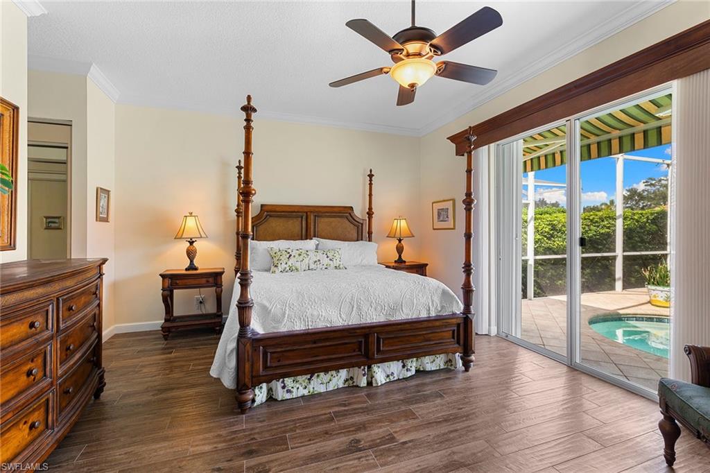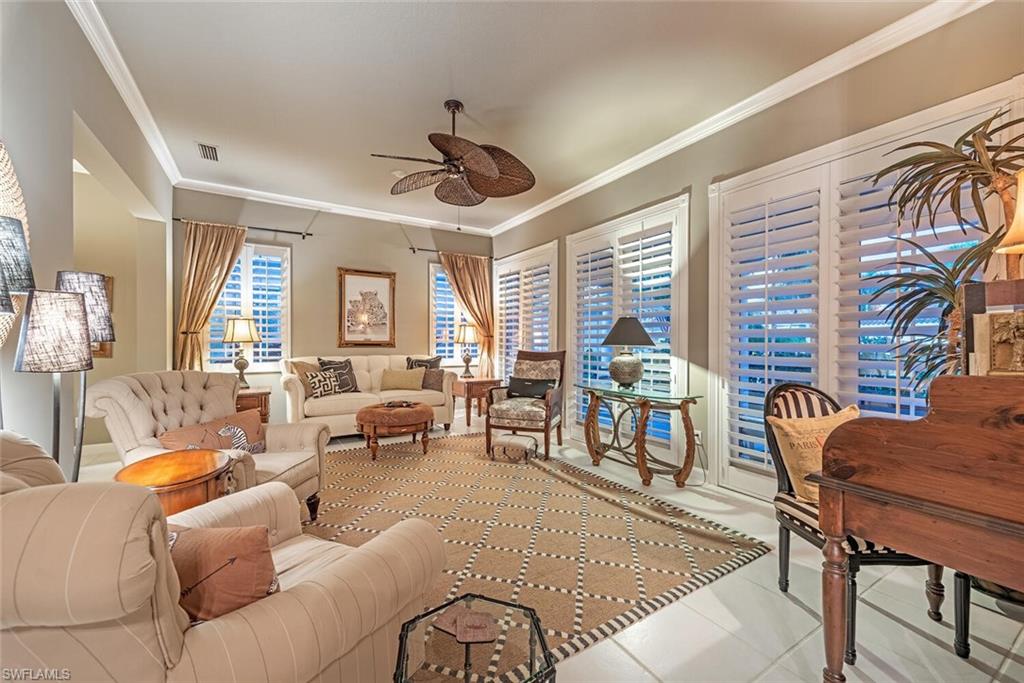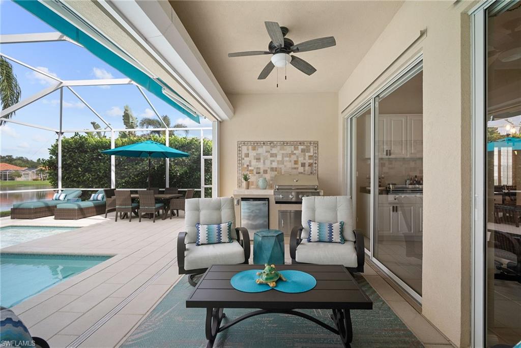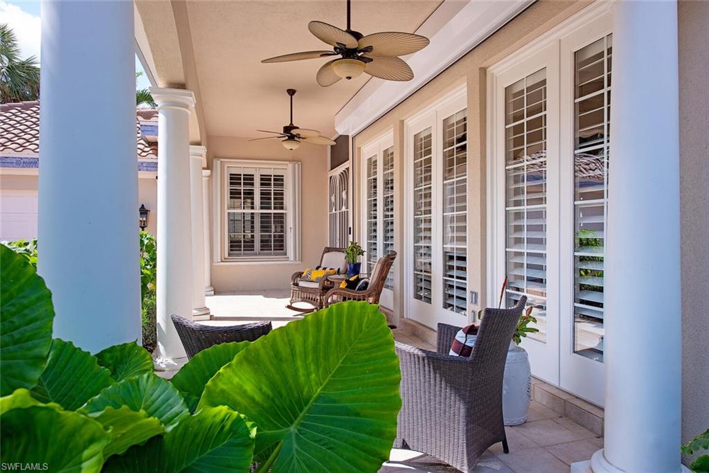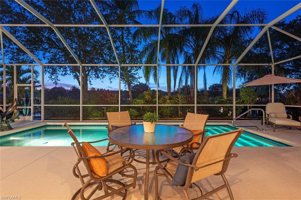 This exquisite home offers a perfect blend of classic sophistication and comfort, combined with the vacation lifestyle you've been dreaming of. Step onto the charming Southern-style front porch and into a thoughtfully designed 2,500+ sq. ft. Carlyle floor plan home featuring 4 bedrooms and 3.5 baths, providing plenty of space for you and your guests. Outside, the screened lanai invites you to relax by the sparkling pool, complete with a charming dolphin fountain and a new pool pump. An electric, retractable awning adds additional space beyond the covered lanai, offering plenty of shade for those warm Florida days. Enjoy stunning lake views and breathtaking sunsets as you entertain or unwind in your private backyard oasis, surrounded by lush, tropical landscaping. Inside, the home offers a well-defined floor plan, with a formal living room, spacious family room, and a beautifully appointed kitchen with a separate morning room for casual dining. The formal dining room provides an elegant setting for meals. The kitchen has been updated with gorgeous quartz countertops, a new deep stainless sink, new faucet, newer microwave, and new hardware. The owner's suite is a true retreat, offering easy access to the pool, generous closet space, and a true his-and-her bath with dual vanities, tumbled marble counters, a walk-in shower, and a soaking tub. Luxury touches throughout the home include plantation shutters or shades on all windows, crown molding, decorator lighting, new ceiling fans inside and out, new exterior lighting, professionally painted interior, and built-in closets that enhance both convenience and style. The finished laundry room features a new Samsung washer and dryer, cabinets, and a utility sink. With a brand-NEW ROOF just installed and a newer A/C, this residence provides a worry-free lifestyle for years to come. Storm prep is simple with accordion shutters and electric roll-down shutters. Located in Island Walk, a vibrant, amenity-rich community with a variety of recreational options to fit your lifestyle. The Town Center includes a large resort pool, lap pool, fitness center, tennis courts, pickleball, bocce courts, and a restaurant, along with everyday conveniences like a gas station, post office, and hair & nail salon. Take advantage of miles of scenic walking paths, complete with picturesque bridges over sparkling lakes, all while being centrally located in Naples, close to shopping, dining, and beaches. This home offers the perfect opportunity to enjoy the relaxed, resort-style living you've been dreaming of. Move in and start living the idyllic lifestyle that Naples has to offer!