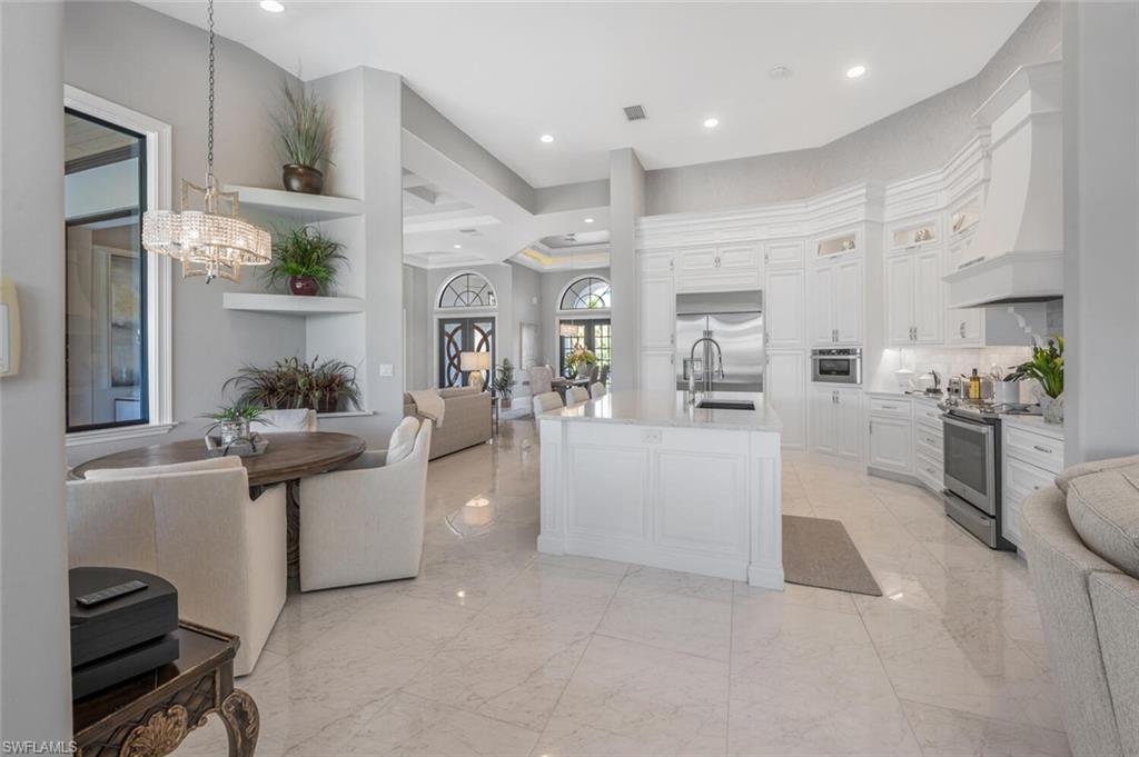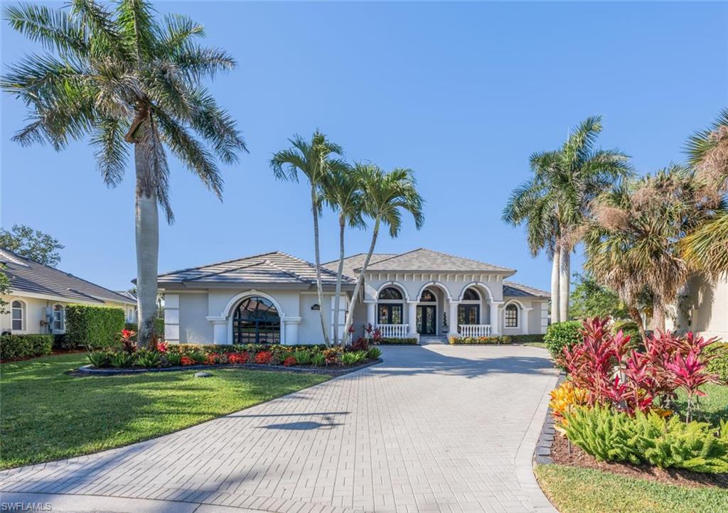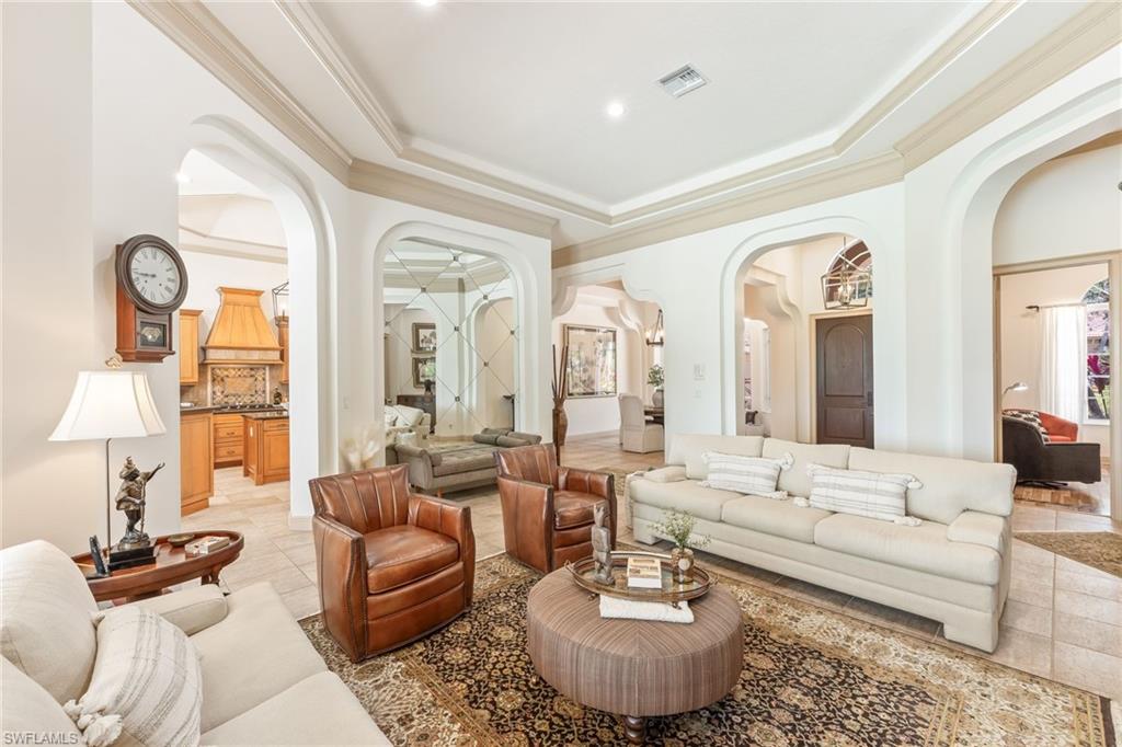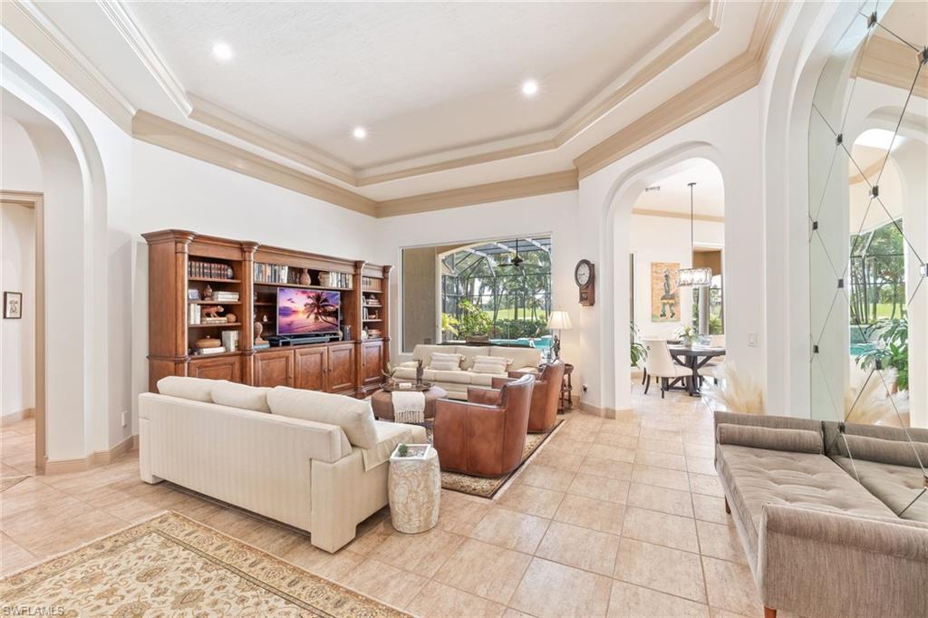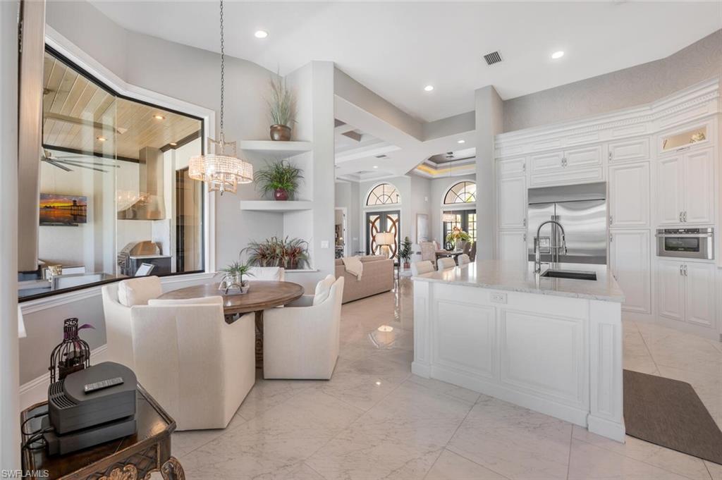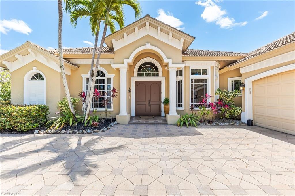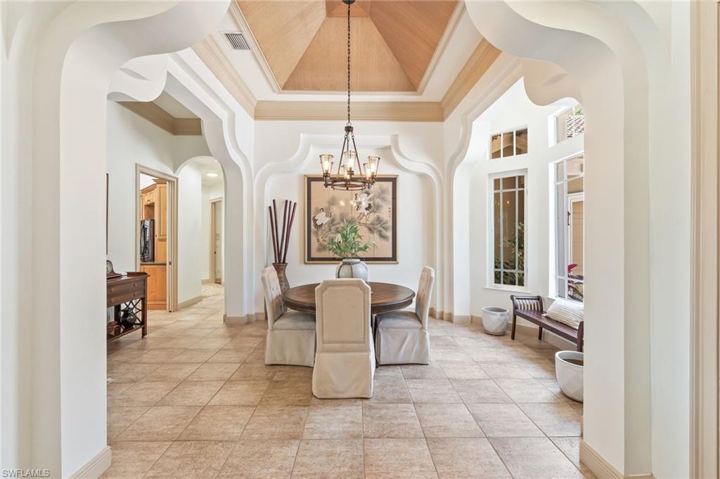 Regal in design and grand in proportion, this residence exemplifies timeless architectural beauty and offers a remarkable foundation for personalization. Perfectly positioned on a prime lakefront lot, the circular brick-paver driveway, manicured landscaping, and stately façade set the stage for what awaits within—soaring ceilings, exquisite mosaic inlay tile details, and walls of glass that showcase breathtaking lake views and bathe the interiors in natural light. The grand foyer transitions seamlessly into the formal living room, where tray ceilings elevate the residence’s sense of scale and sophistication. The spacious kitchen is a dream layout to modernize, featuring a large island, wraparound breakfast bar, and abundant cabinetry. Just off the kitchen lies a bar area additional cabinetry, and a wine cooler—perfectly positioned within view of the formal dining room, making it ideal for entertaining guests or hosting grand fêtes. The kitchen offers an eat-in dining area attached to a large Great room provide inviting spaces for casual dining and relaxed gatherings, all overlooking the lanai and lake beyond. Corner pocketing sliders open to the screened lanai, where a sparkling pool is surrounded by both undercover lounging areas for shaded comfort and open-air spaces for sunbathing. The primary suite continues the theme of elegance, offering private lanai access, mosaic inlay tile accents, and a sprawling ensuite bath with a luxurious pass-through “car wash” shower, soaking tub, dual vanities, and makeup station. The guest rooms, too, are given the attention they deserve, including a guest suite with French doors and a walk-in closet, along with additional spacious bedrooms that ensure comfort and privacy for family and guests alike. Ideally located within Kensington Golf & Country Club, just minutes from Mercato, Waterside Shops, the Naples Philharmonic, and Gulf beaches, this home offers fantastic bones, timeless appeal, and enduring architectural character—a rare opportunity to refresh a classic or reinvent it for modern living.