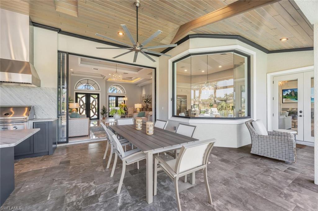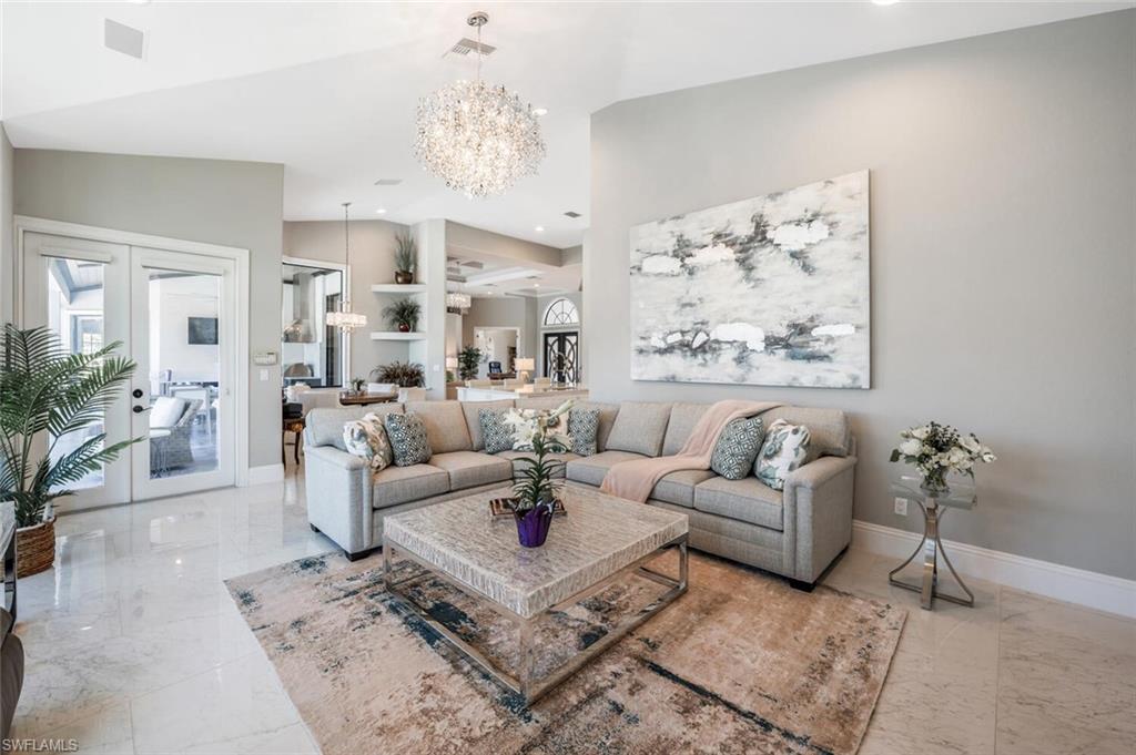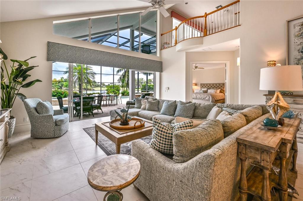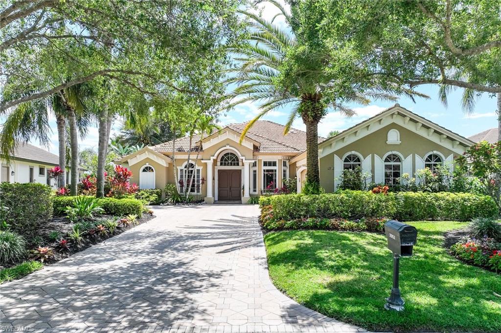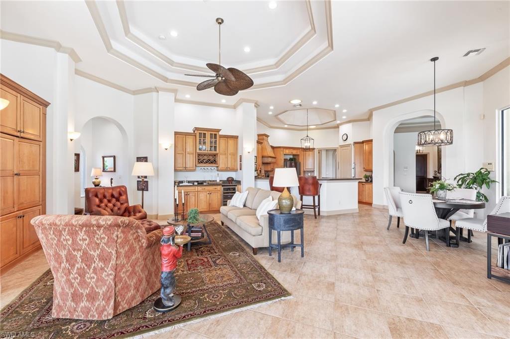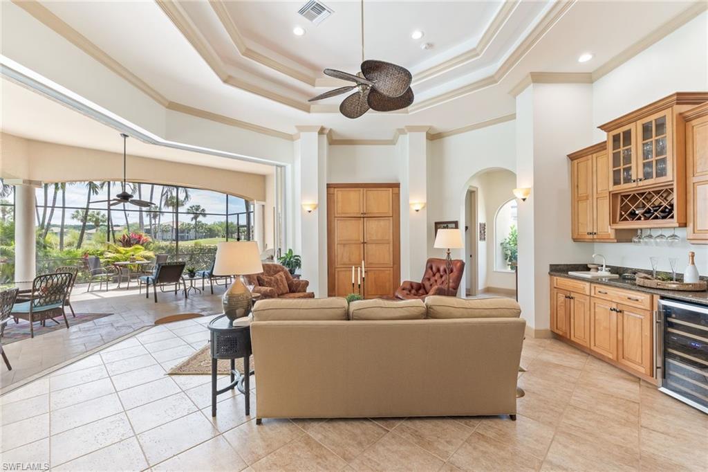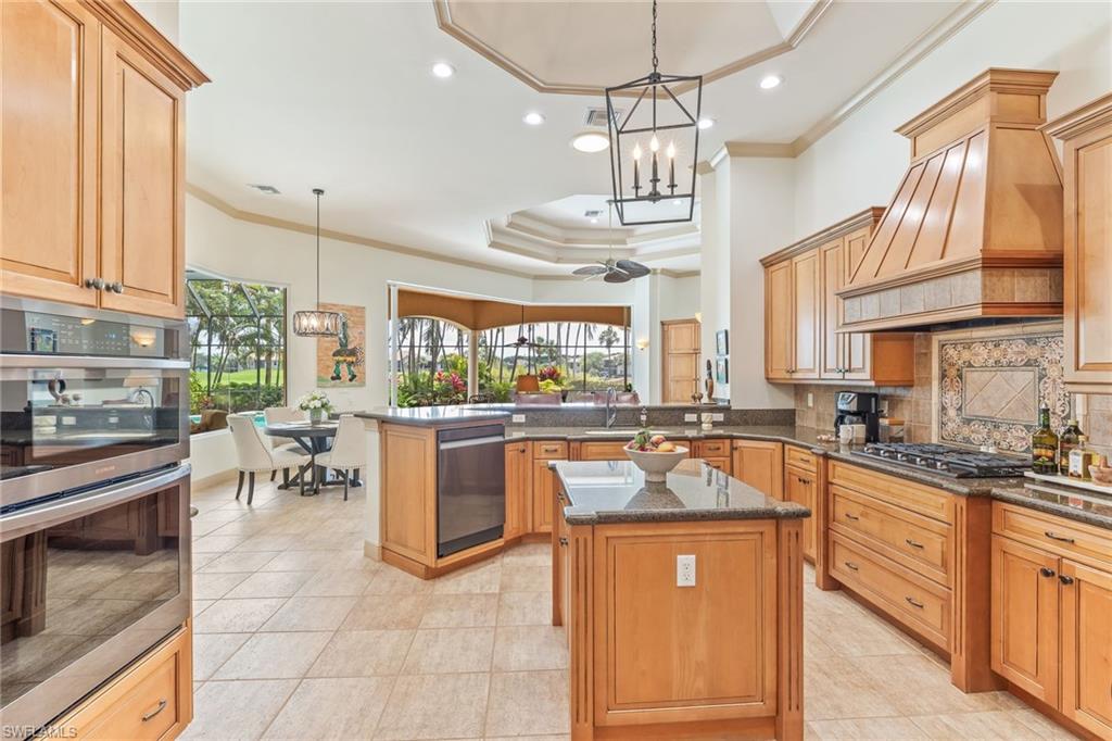 Regal in design and grand in proportion, this residence exemplifies timeless architectural beauty and offers a remarkable foundation for personalization. Perfectly positioned on a prime lakefront lot, the circular brick-paver driveway, manicured landscaping, and stately façade set the stage for what awaits within—soaring ceilings, exquisite mosaic inlay tile details, and walls of glass that showcase breathtaking lake views and bathe the interiors in natural light. The grand foyer transitions seamlessly into the formal living room, where tray ceilings elevate the residence’s sense of scale and sophistication. The spacious kitchen is a dream layout to modernize, featuring a large island, wraparound breakfast bar, and abundant cabinetry. Just off the kitchen lies a bar area additional cabinetry, and a wine cooler—perfectly positioned within view of the formal dining room, making it ideal for entertaining guests or hosting grand fêtes. The kitchen offers an eat-in dining area attached to a large Great room provide inviting spaces for casual dining and relaxed gatherings, all overlooking the lanai and lake beyond. Corner pocketing sliders open to the screened lanai, where a sparkling pool is surrounded by both undercover lounging areas for shaded comfort and open-air spaces for sunbathing. The primary suite continues the theme of elegance, offering private lanai access, mosaic inlay tile accents, and a sprawling ensuite bath with a luxurious pass-through “car wash” shower, soaking tub, dual vanities, and makeup station. The guest rooms, too, are given the attention they deserve, including a guest suite with French doors and a walk-in closet, along with additional spacious bedrooms that ensure comfort and privacy for family and guests alike. Ideally located within Kensington Golf & Country Club, just minutes from Mercato, Waterside Shops, the Naples Philharmonic, and Gulf beaches, this home offers fantastic bones, timeless appeal, and enduring architectural character—a rare opportunity to refresh a classic or reinvent it for modern living.
