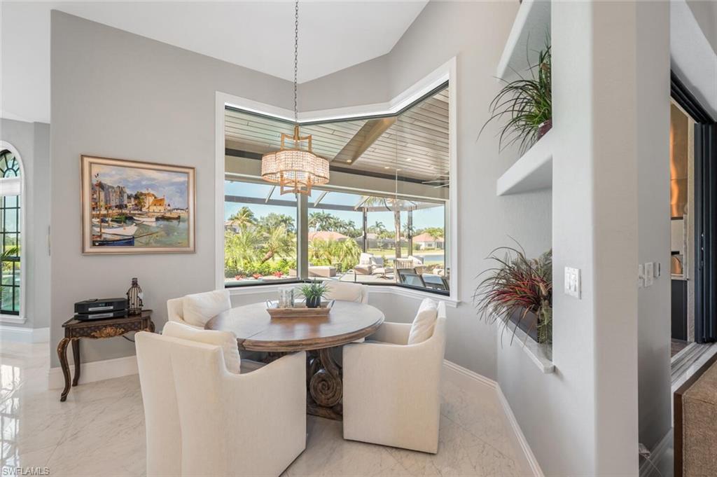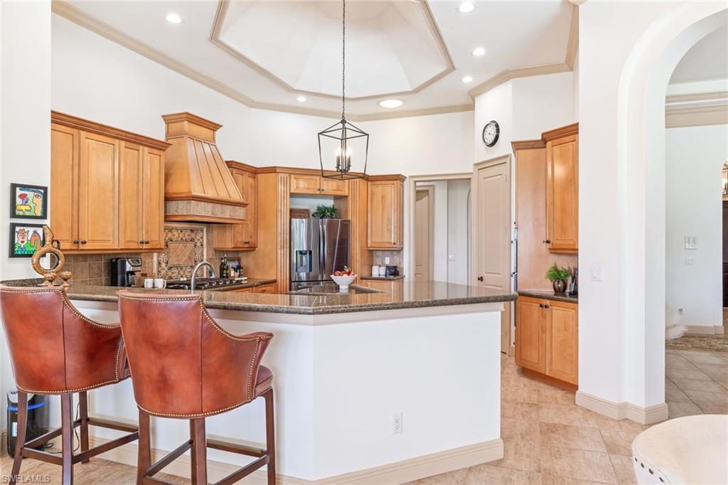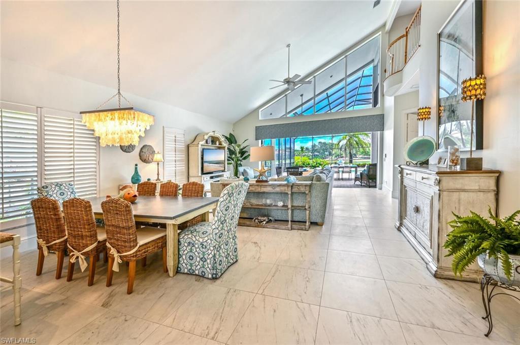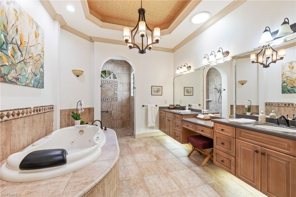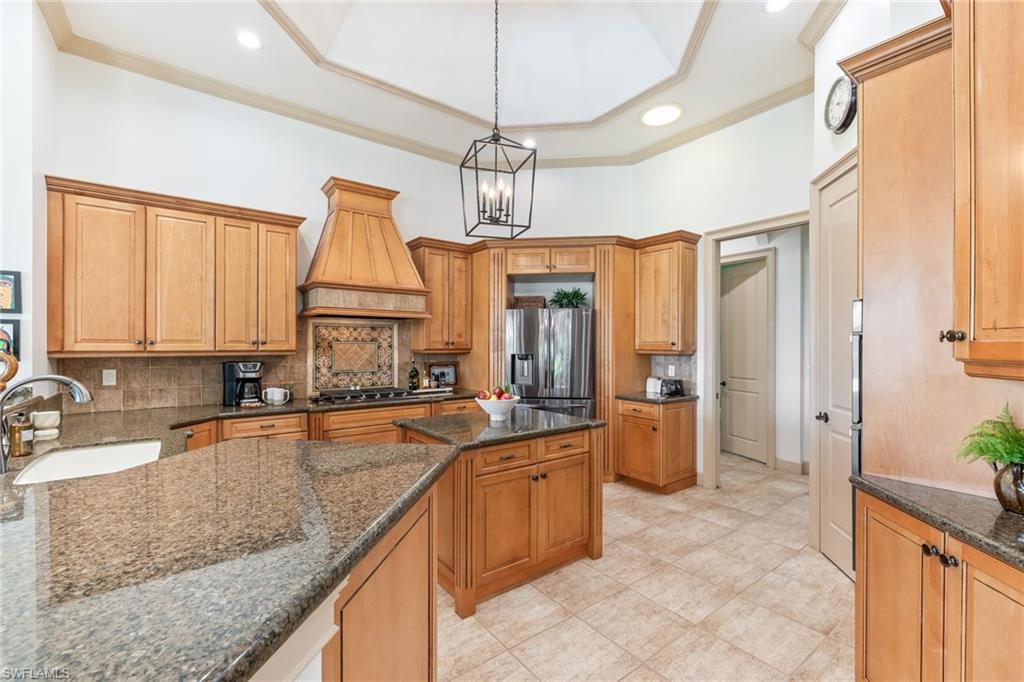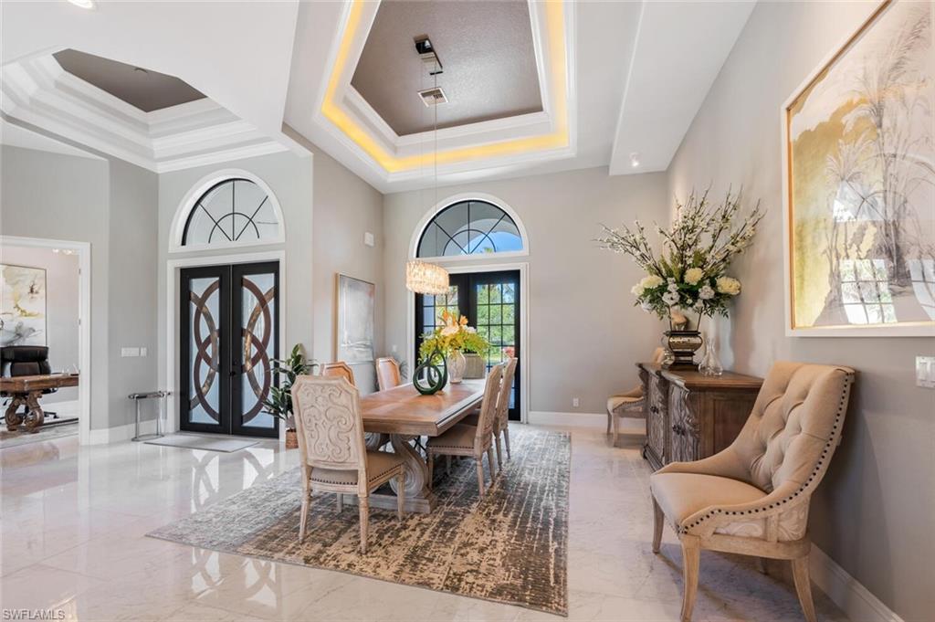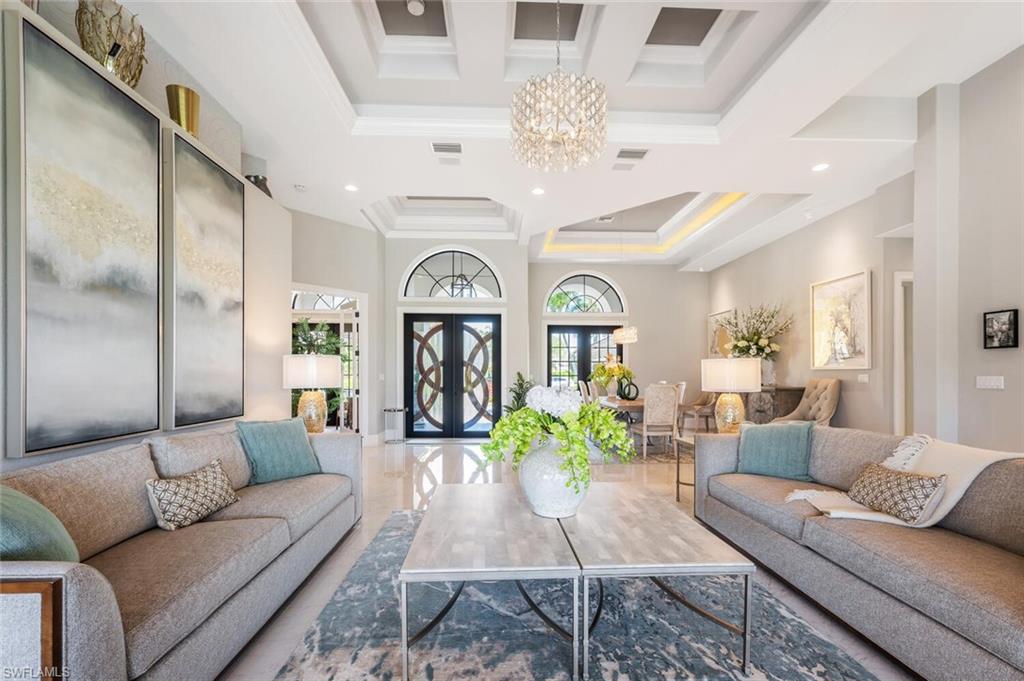 Regal in design and grand in proportion, this residence exemplifies timeless architectural beauty and offers a remarkable foundation for personalization. Perfectly positioned on a prime lakefront lot, the circular brick-paver driveway, manicured landscaping, and stately façade set the stage for what awaits within—soaring ceilings, exquisite mosaic inlay tile details, and walls of glass that showcase breathtaking lake views and bathe the interiors in natural light. The grand foyer transitions seamlessly into the formal living room, where tray ceilings elevate the residence’s sense of scale and sophistication. The spacious kitchen is a dream layout to modernize, featuring a large island, wraparound breakfast bar, and abundant cabinetry. Just off the kitchen lies a bar area additional cabinetry, and a wine cooler—perfectly positioned within view of the formal dining room, making it ideal for entertaining guests or hosting grand fêtes. The kitchen offers an eat-in dining area attached to a large Great room provide inviting spaces for casual dining and relaxed gatherings, all overlooking the lanai and lake beyond. Corner pocketing sliders open to the screened lanai, where a sparkling pool is surrounded by both undercover lounging areas for shaded comfort and open-air spaces for sunbathing. The primary suite continues the theme of elegance, offering private lanai access, mosaic inlay tile accents, and a sprawling ensuite bath with a luxurious pass-through “car wash” shower, soaking tub, dual vanities, and makeup station. The guest rooms, too, are given the attention they deserve, including a guest suite with French doors and a walk-in closet, along with additional spacious bedrooms that ensure comfort and privacy for family and guests alike. Ideally located within Kensington Golf & Country Club, just minutes from Mercato, Waterside Shops, the Naples Philharmonic, and Gulf beaches, this home offers fantastic bones, timeless appeal, and enduring architectural character—a rare opportunity to refresh a classic or reinvent it for modern living.