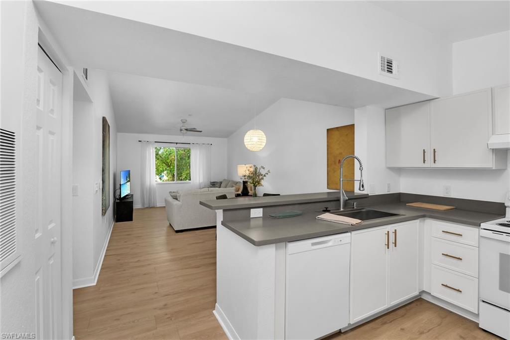 Located on the FIRST FLOOR in the heart of North Naples, this 2-bedroom, 1-bath condo offers a functional layout with great potential. The unit features tile flooring throughout, an updated kitchen with quartz countertops and new shaker-style cabinets, a fully remodeled bathroom with a walk-in shower, walk-in closets in both bedrooms, and in-unit laundry for added convenience. Step outside to an open patio with peaceful lake views and enjoy the ease of a covered, assigned parking space—perfect for soaking in the Florida lifestyle. Key Royal is a gated, amenity-rich community with low HOA fees and includes a clubhouse, resort-style pool, Tiki hut, fitness center, billiards, library, business center, and car wash area. Located in an A-rated school district and just minutes from new shopping plazas, top medical facilities, popular restaurants, and a short drive to Naples’ world-famous white sand beaches, this condo offers the perfect blend of comfort, value, and location. Photos are virtually staged.