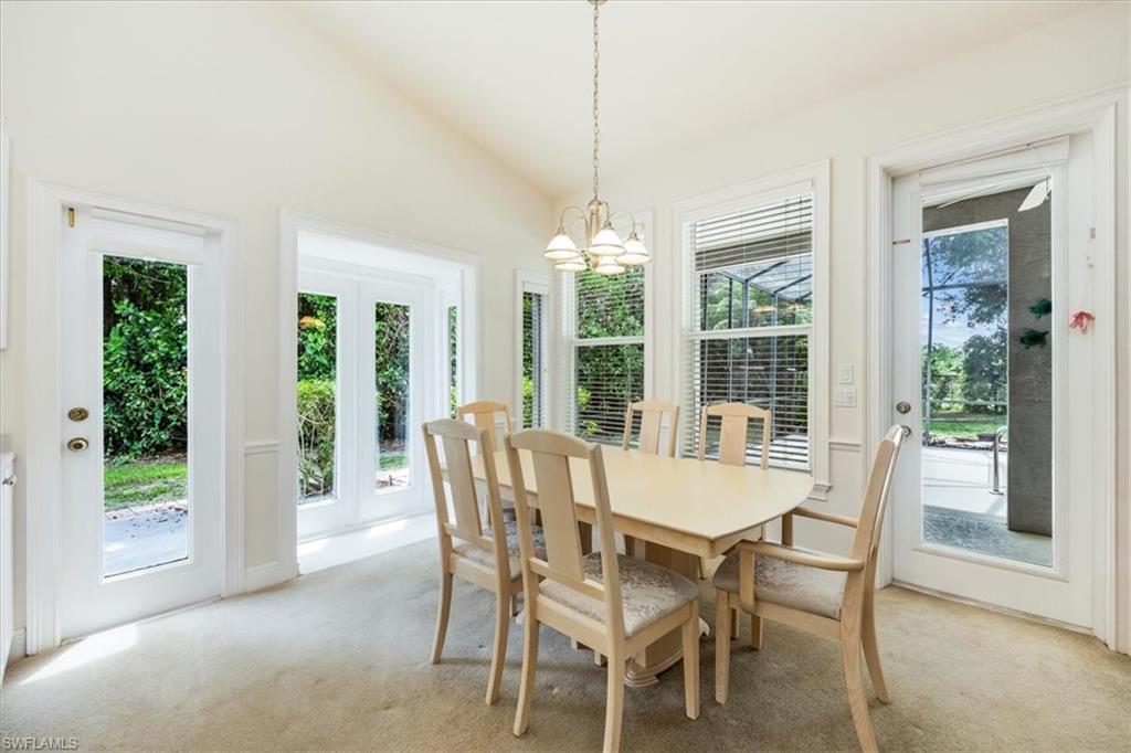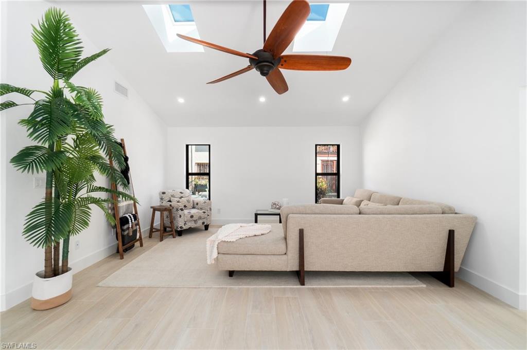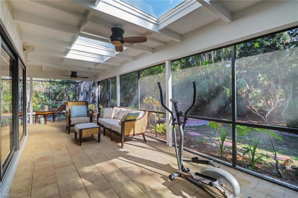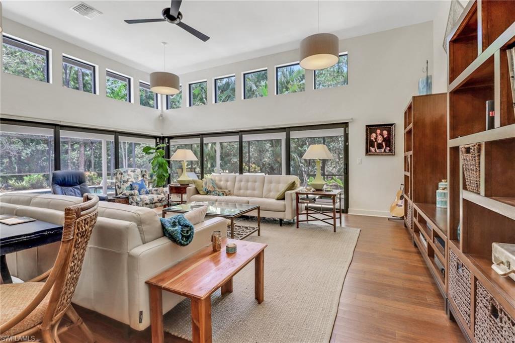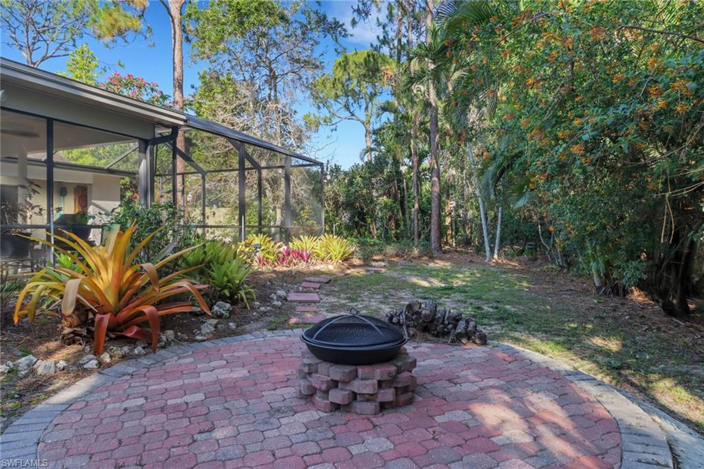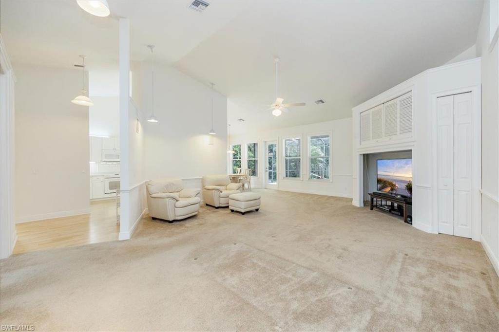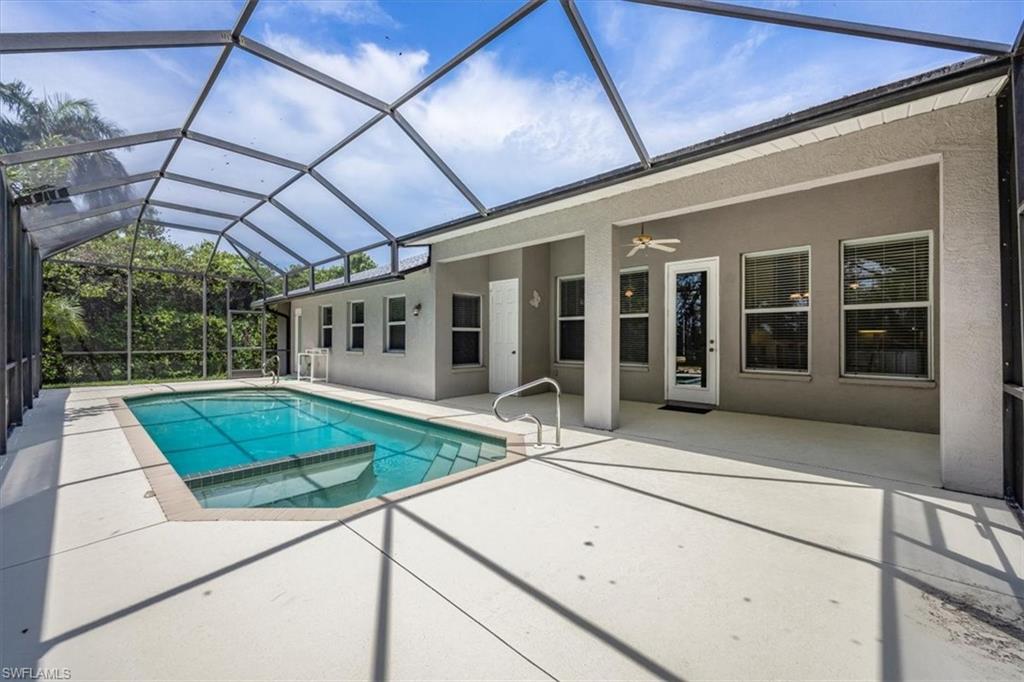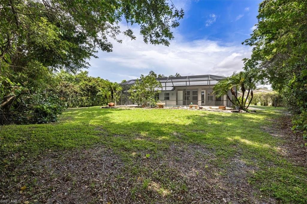 Beautifully updated pool home in the coveted community of Kings Lake. This 3-bedroom, 2.5-bath residence offers nearly 2,500 sq ft of living space with multiple living areas, soaring vaulted ceilings, and a bright, open layout. The upgraded kitchen features new countertops (2025) and a convenient pass-through window to the pool area. Recent improvements include upgraded electric, two new HVAC units, new washer and dryer, new refrigerator, and fresh paint (all 2023). The home also features solar panels, a cozy fireplace, hurricane shutters, and abundant natural light from multiple skylights. The landscaping has been refreshed with new plantings and numerous fruit trees throughout the yard. Enjoy the large screened lanai with pool and a private backyard backing to the walking trail—no rear neighbors! Kings Lake offers scenic walking paths and a prime Naples location just minutes to downtown and the beach. Ideal for full-time or seasonal living.