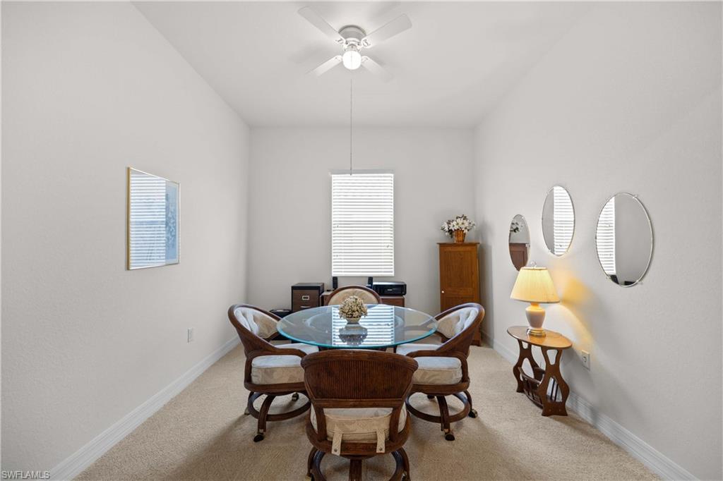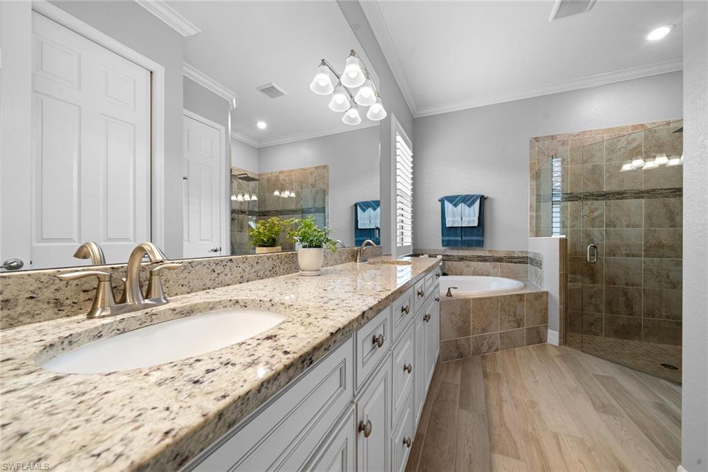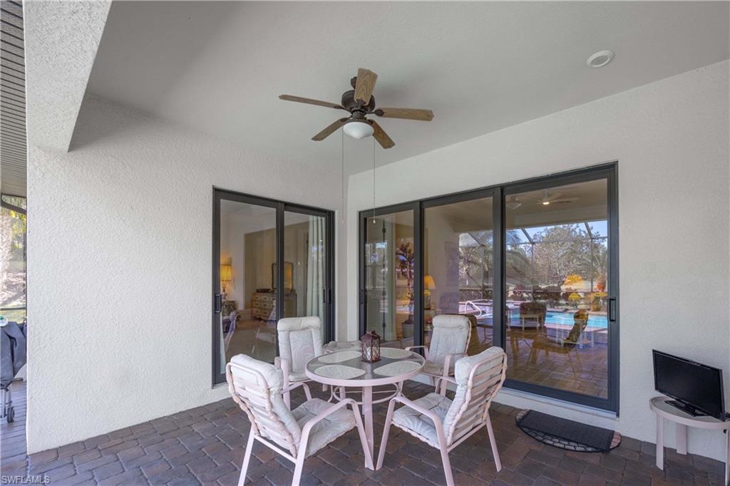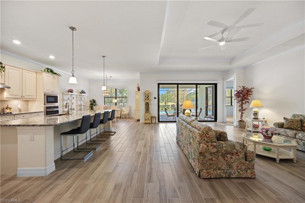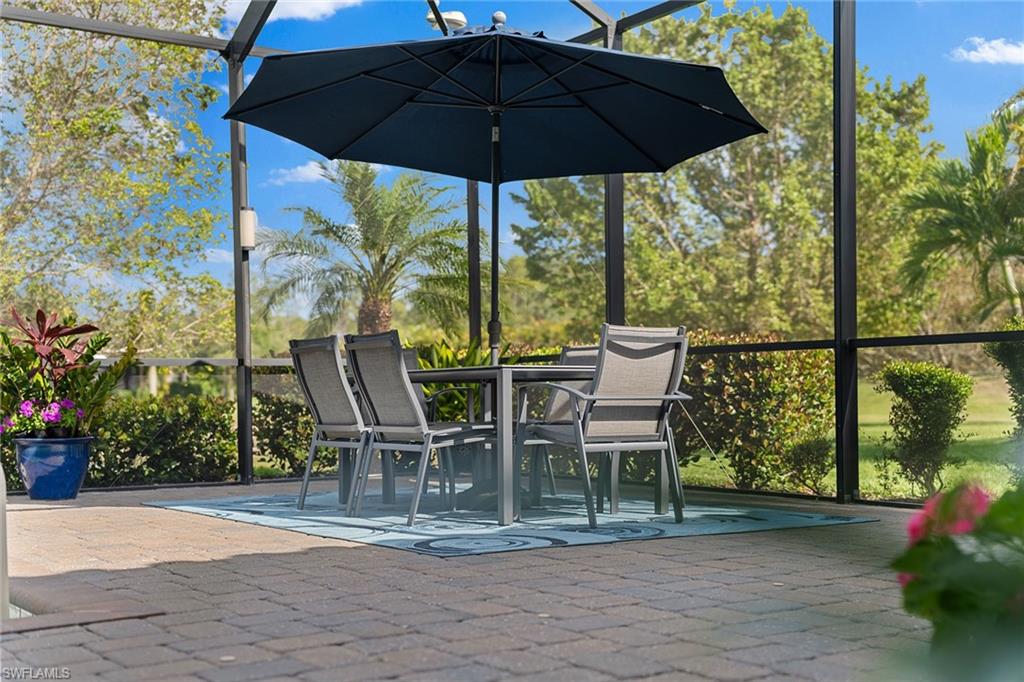 ELEGANT and sophisticated POOL Home on a PRIVATE cul-de-sac in LaMorada, a tranquil AMENITY-RICH community in highly desirable NORTH Naples. This popular Victoria floor plan offers an OPEN-CONCEPT design with classic finishes spanning 1900 square feet of living space. FURNITURE IS NEGOTIABLE. The home features 2 BEDROOMS PLUS A LARGE DEN and 2 and a half bathrooms, combining LUXURY and COMFORT. The GREAT ROOM seamlessly connects to the kitchen, formal dining area, a casual dining area with a built-in DRY BAR perfect for entertaining. The Living area has neutral rectangular tile, TEN foot ceilings, CROWN molding, TRAY ceilings and contemporary new light fixtures. This home also offers all HIGH IMPACT windows and sliders, BRAND NEW ELECTRIC hurricane shutters in the lanai, and a BRAND NEW GENERATOR with auto-transfer switch for your peace of mind. The kitchen features QUARTZ countertops, a large island, spacious pantry, stainless steel appliances, a natural GAS RANGE with a stainless vent hood, tile backsplash, and a large stainless-steel sink. The primary bedroom suite serves as a peaceful retreat, with a TRAY ceiling, large walk-in closet, sliders to the pool and BRAND NEW carpeting. The spacious primary bathroom has a walk-in shower, Roman tub and dual vanities. The Den is spacious and bright. The guest bedroom has BRAND NEW CARPETING and the guest bath a walk-in shower. The OUTDOOR living area is an ENTERTAINER'S DREAM, featuring a pavered Pool and Spa Patio enclosed area, beautiful manicured and a recently updated tropical landscape, new landscape/pool lighting, peaceful water views, and a POOL BATH, what a luxury. The patio has a modern OUTDOOR KITCHEN complete with a stainless steel refrigerator, gas grill and a brick accented wall; tankless water heater, epoxy flooring in garage. Close to $50k in recent upgrades. Enjoy world-class club amenities including a resort-style pool, fitness center, spa, tennis courts, pickleball courts, and casual pool dining. All of this just a short drive to some of Naples most popular destinations, Vanderbilt Beach, Mercato, Venetian Village and downtown Naples.