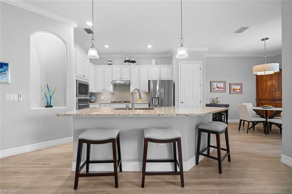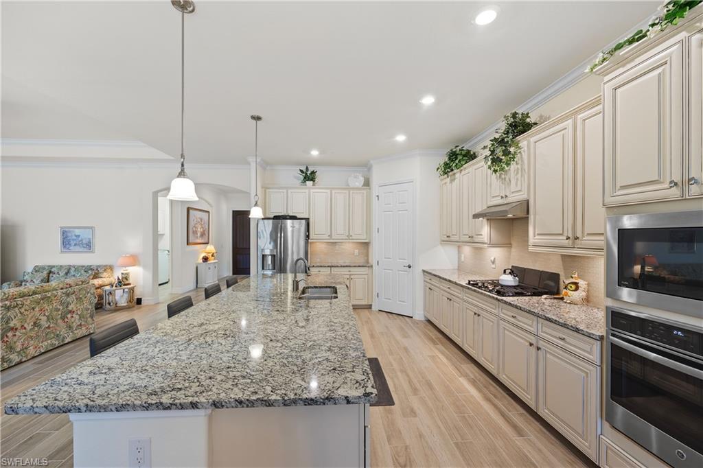 This upgraded Summerville model, part of the Manor Home Collection, offers spacious and stylish living with thoughtful design throughout. With 3 bedrooms, 3 full bathrooms, a den, and a 3-car garage, this home was built for comfort, functionality, and entertaining. Step through double glass doors into a wide foyer with a custom accent wall. The open-concept great room impresses with expansive views and a seamless connection between the living, dining, and kitchen areas. The chef’s kitchen features an 11-foot island, custom walk-in pantry, and a full-height backsplash that extends over the cabinets to the ceiling for a dramatic finish. Each bedroom has been tastefully styled with custom wall or ceiling accents. The master suite is a serene retreat with two walk-in closets, a chandelier, and a statement accent wall. The master bath includes dual vanities, a soaking tub with custom wall art above, and an oversized walk-in shower. The guest suite offers privacy and comfort with its own en-suite bathroom, ideal for visitors or extended stays. The den is enclosed with 8-foot French doors and plantation shutters, creating a quiet and flexible space for work or relaxation. Outdoors, the covered lanai delivers the full Florida lifestyle with a complete outdoor kitchen, built-in grill and exhaust hood, refrigerator, marble countertops, and a wall-mounted TV. The custom saltwater pool, installed in 2021, is 15 by 32 feet and features a sun shelf with loungers, a bubbler, water features, and two built-in stanchions with matching planters. The oversized panoramic cage is finished with travertine tile and landscape lighting, offering the perfect setting for day or night entertaining. Additional features include hurricane impact windows and doors throughout and three large overhead storage racks in the garage that eliminate the need for off-site storage. LaMorada is a gated, natural gas community in North Naples that combines the amenities of a large resort-style neighborhood with a more intimate residential feel. Residents enjoy pickleball, tennis, bocce, a fitness center, resort-style pool and bar, theater, culinary arts studio, and a library.
