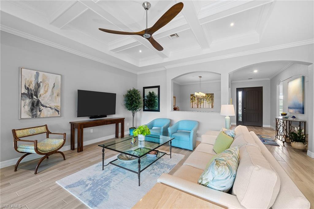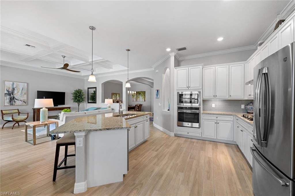 One story (Summerville model) home loaded with upgrades. This 3 bed, 3 bath plus den home has many desirable features including gourmet style kitchen with GAS range, expanded lanai, outdoor kitchen, outdoor lighting, coffered ceilings, crown molding, impact resistant windows and doors, 3 car garage with finished epoxy floor, tankless water heater, custom backsplash and much more!!! There's also Impact resistant sliders from the Master suite and triple-sliders from main living area to pool. Smart Home technology includes Amazon Nest, Ring and wireless upgrades. All rooms have blinds and drapes and all bedrooms have upgraded ceiling fans. Lamorada has low HOA fees and has a luxury 13,000 square foot clubhouse with a poolside bar with food and beverage service. Other amenities include a pool with lap lanes, spa, fitness center, movie theater, culinary arts studio, tennis, pickleball and bocce. Lamorada is located a short distance from the future development of "The Pointe" at Founders Square, adding several new shopping, entertainment and dinning options to this already fabulous Naples location.