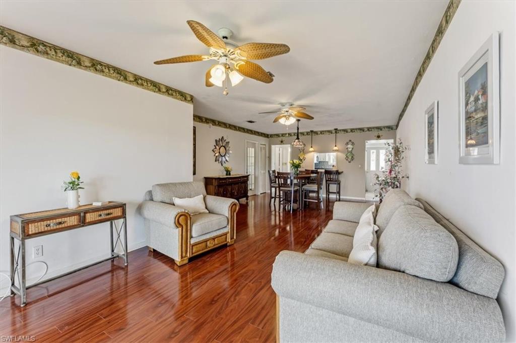 New price for this beautifully maintained second floor residence with stunning lanai views of Hibiscus Golf Course, its waterways and abundant local wildlife - day and night. A change of scenery is available from front deck-at no charge! Interior floors are a lovely combination of real wood in living areas and ceramic tiles in bedrooms, baths, kitchen and lanai. Impact glass windows, electric and manual shutters for safety. HVAC in 2024, Electrical Panel 2025, new washer/dryer in 2018, kitchen updates including appliances in 2019. Single car garage with painted floor adds to care shown in property. This home is the perfect balance of comfort and leisure in a peaceful and friendly neighborhood. Steps to Club House, Pool and Mailbox center. Come experience this wonderful property and what it has to offer! Some photographs have been virtually staged.