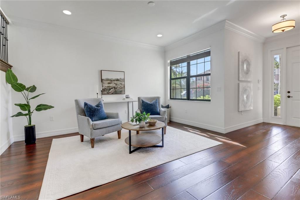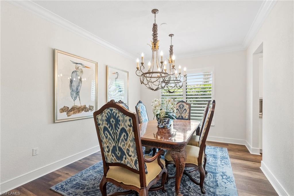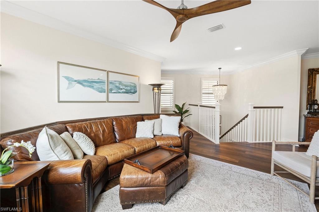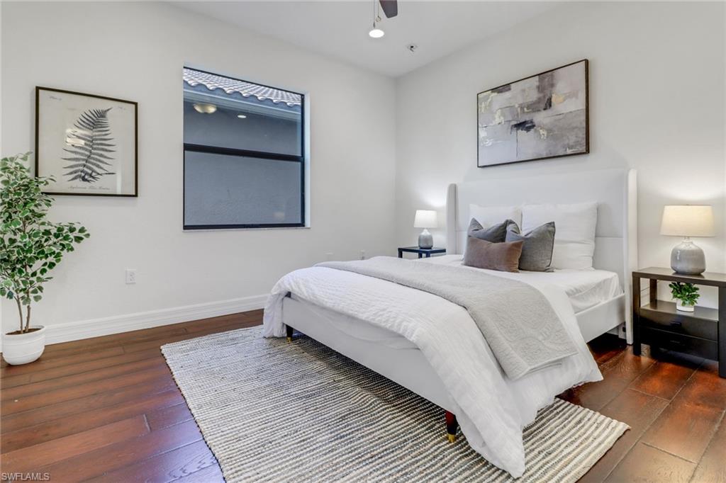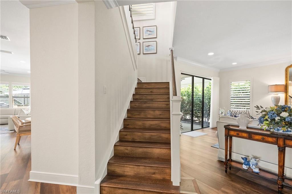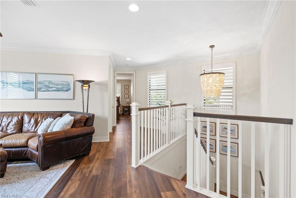 Amazing Value! Price just reduced! Welcome to this stunning 5-bedroom, 4-bathroom plus den home located in the luxurious gated enclave of Marbella Isles. Thoughtfully designed with both comfort and elegance in mind, this spacious two-story home boasts an open floorplan, wide-plank wood flooring, and crown molding throughout the first floor, creating a warm and inviting atmosphere. A bedroom and full bathroom are conveniently located on the first floor, providing flexibility for modern living. The heart of the home is the beautifully appointed kitchen, featuring custom white cabinetry, granite countertops, stainless steel appliances, and ample storage for all your culinary needs. Upstairs, a versatile flex space offers endless possibilities - it’s perfect as a game room, library, or home office. The primary suite is a true retreat, complete with a tray ceiling, walk-in closet with custom built-ins, and a luxurious ensuite bath featuring dual sinks, a large corner soaking tub, and an oversized glass-enclosed shower. Sliding glass doors from the main living area open to a serene caged lanai, where a sparkling saltwater pool and integrated spa are surrounded by mature landscaping for ultimate privacy - ideal for relaxing or entertaining. Marbella Isles is known for its exceptional amenities, including a clubhouse with a full-sized indoor basketball court, game rooms, fitness center, and community spaces for social gatherings. Outdoors, residents enjoy tennis courts, pickleball, and a resort-style pool with a water play area. Ideally located in the heart of Naples, this home offers easy access to world-class dining, shopping, golf courses, entertainment, and the white-sand beaches. This is Florida living at its finest.