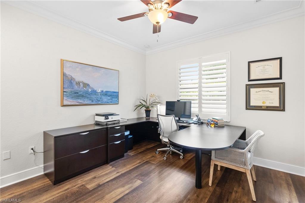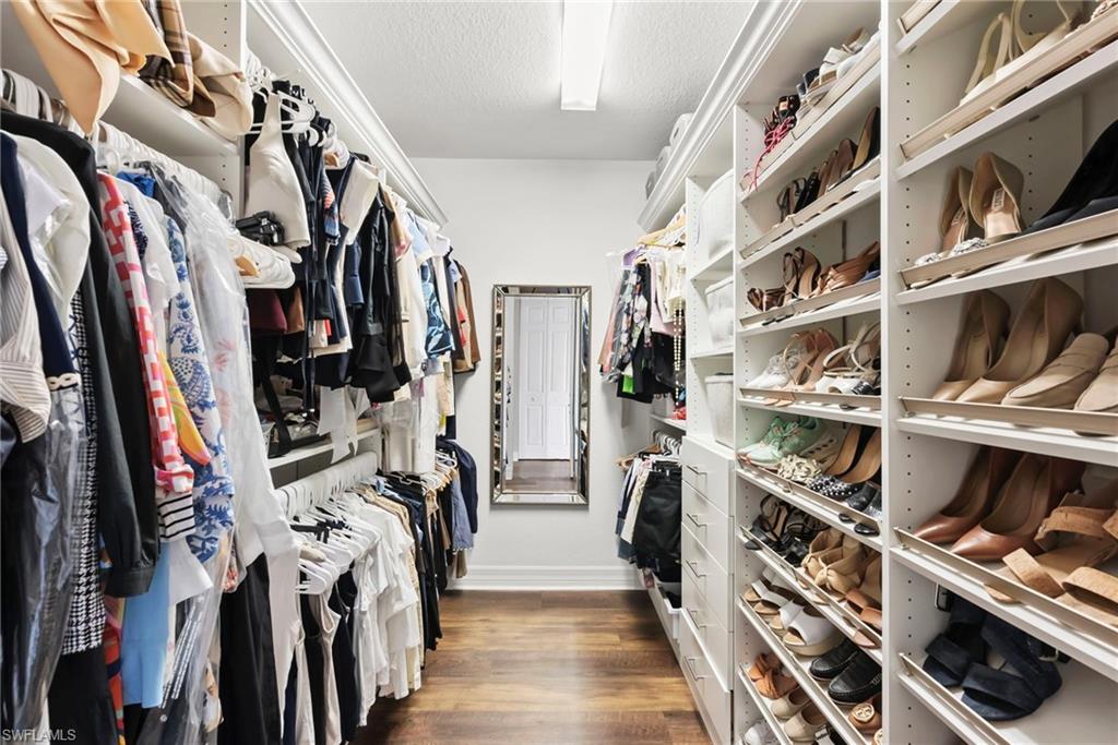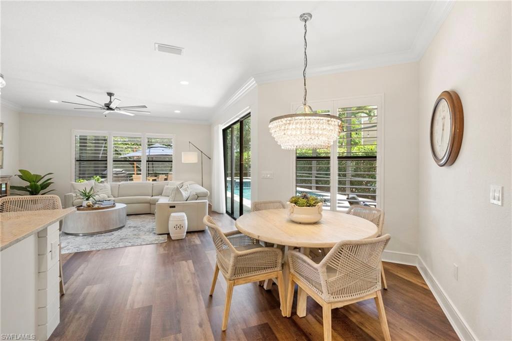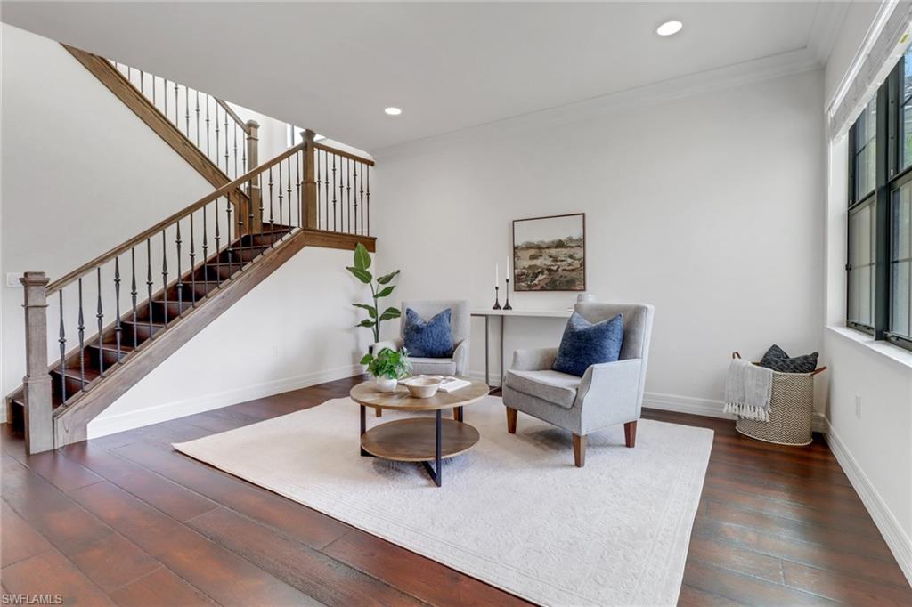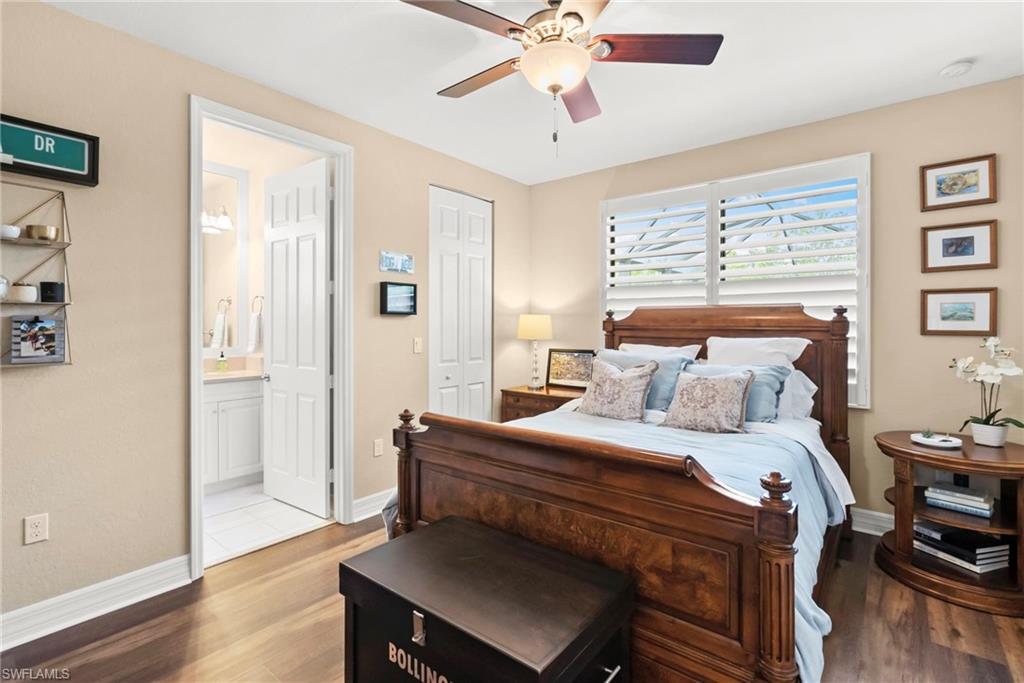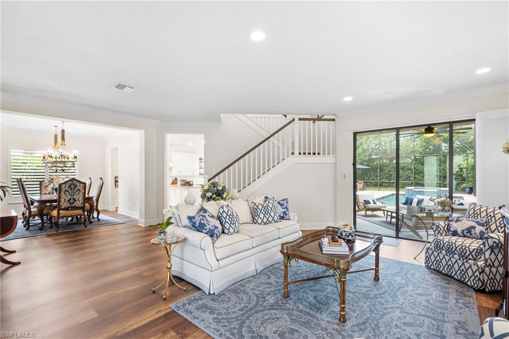 Amazing Value! Price just reduced! Welcome to this stunning 5-bedroom, 4-bathroom plus den home located in the luxurious gated enclave of Marbella Isles. Thoughtfully designed with both comfort and elegance in mind, this spacious two-story home boasts an open floorplan, wide-plank wood flooring, and crown molding throughout the first floor, creating a warm and inviting atmosphere. A bedroom and full bathroom are conveniently located on the first floor, providing flexibility for modern living. The heart of the home is the beautifully appointed kitchen, featuring custom white cabinetry, granite countertops, stainless steel appliances, and ample storage for all your culinary needs. Upstairs, a versatile flex space offers endless possibilities - it’s perfect as a game room, library, or home office. The primary suite is a true retreat, complete with a tray ceiling, walk-in closet with custom built-ins, and a luxurious ensuite bath featuring dual sinks, a large corner soaking tub, and an oversized glass-enclosed shower. Sliding glass doors from the main living area open to a serene caged lanai, where a sparkling saltwater pool and integrated spa are surrounded by mature landscaping for ultimate privacy - ideal for relaxing or entertaining. Marbella Isles is known for its exceptional amenities, including a clubhouse with a full-sized indoor basketball court, game rooms, fitness center, and community spaces for social gatherings. Outdoors, residents enjoy tennis courts, pickleball, and a resort-style pool with a water play area. Ideally located in the heart of Naples, this home offers easy access to world-class dining, shopping, golf courses, entertainment, and the white-sand beaches. This is Florida living at its finest.